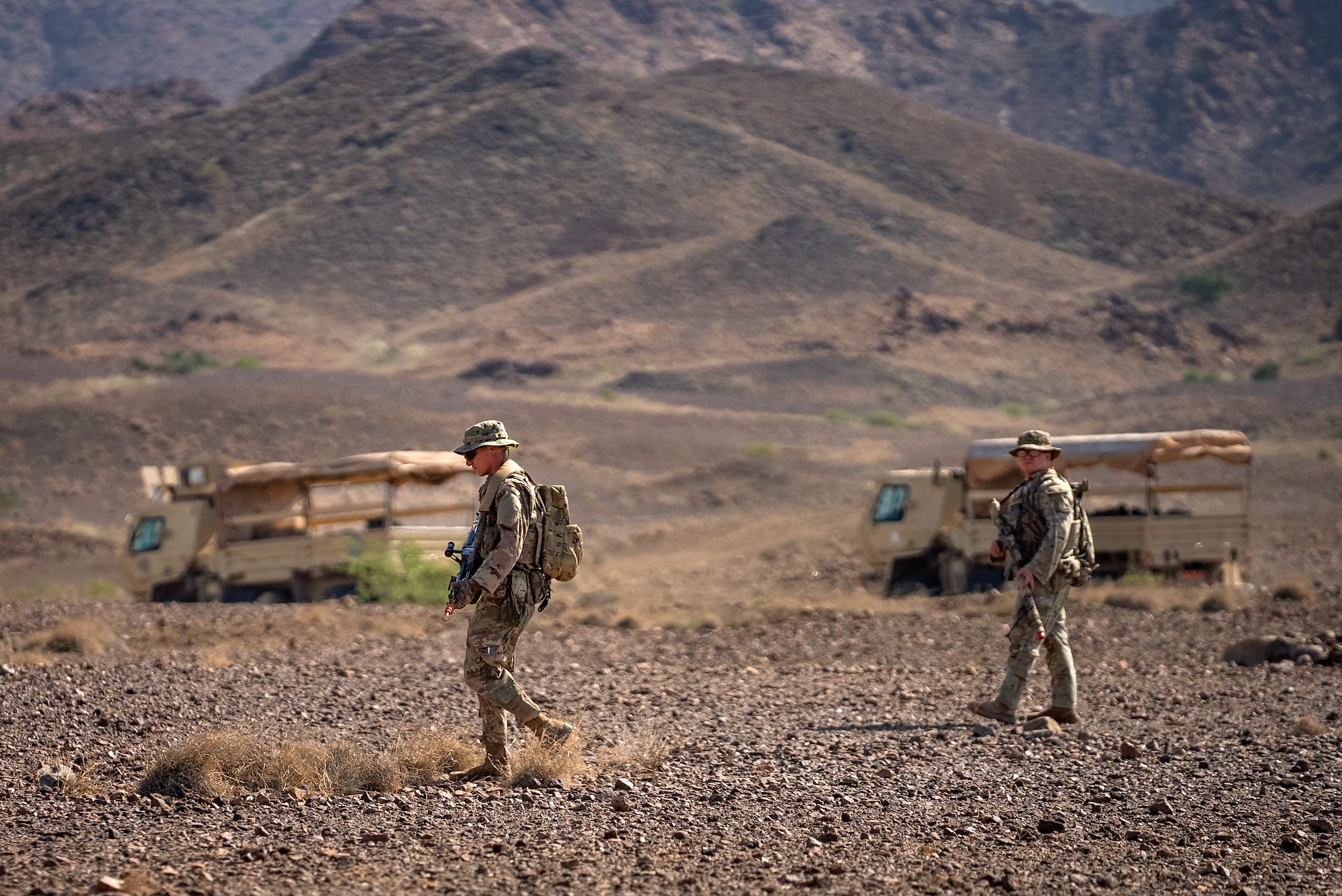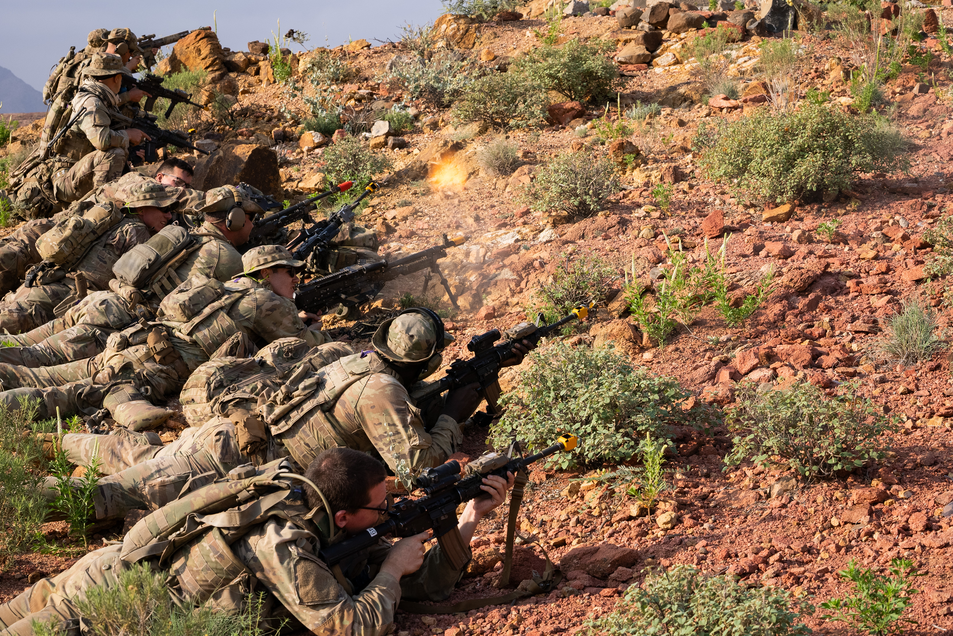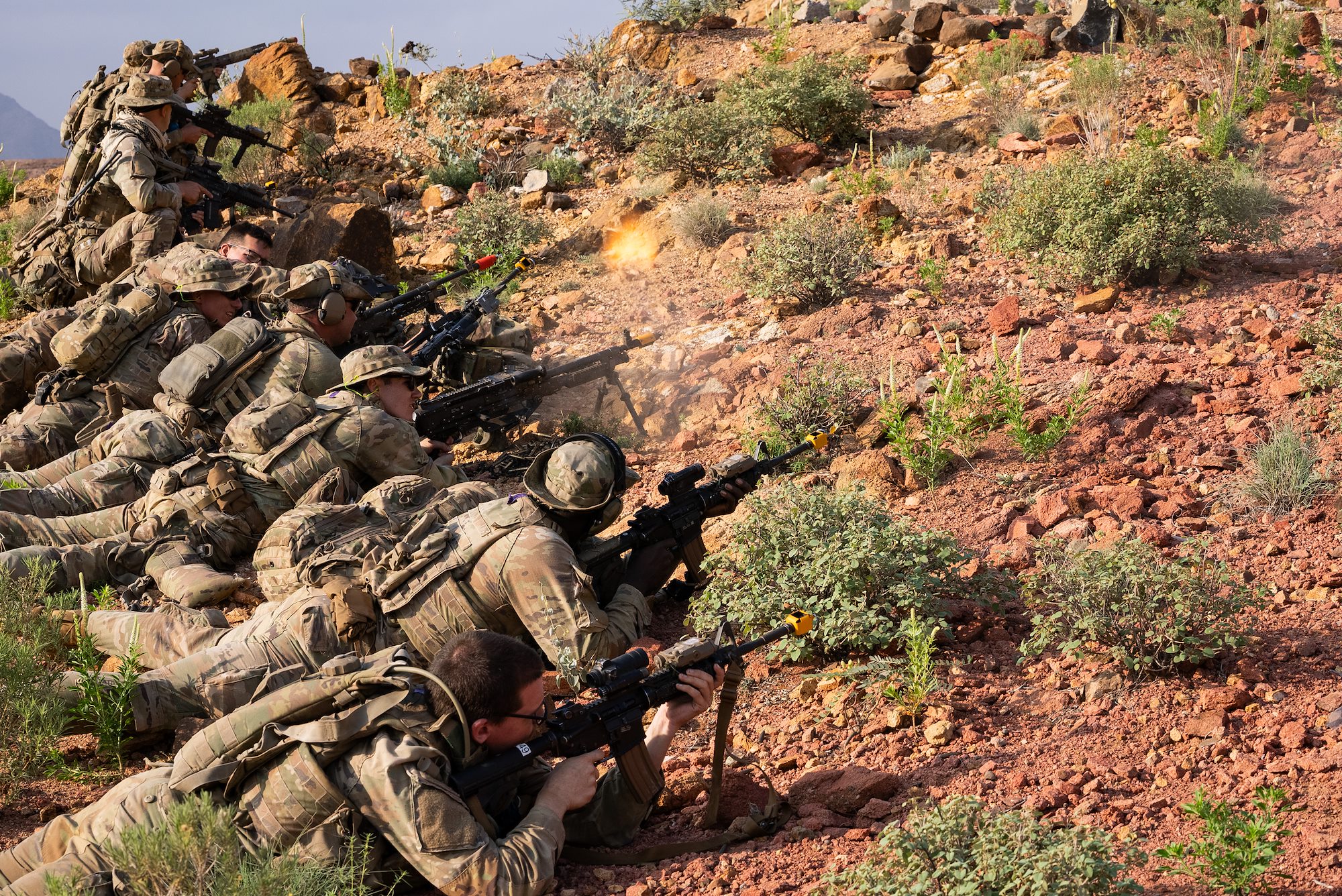 Taskforce Tomahawk soldiers return fire during an ambush on a mountainside during Exercise Wakri near Ali Sabieh, Djibouti, Dec. 5, 2023. (Department of Defense photo by U.S. Air Force Staff Sgt. Dylan Gentile)