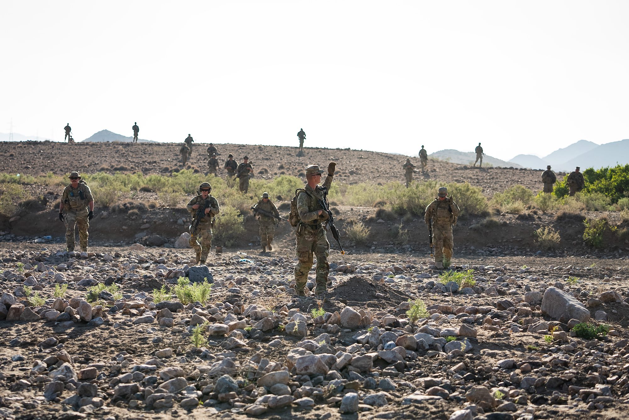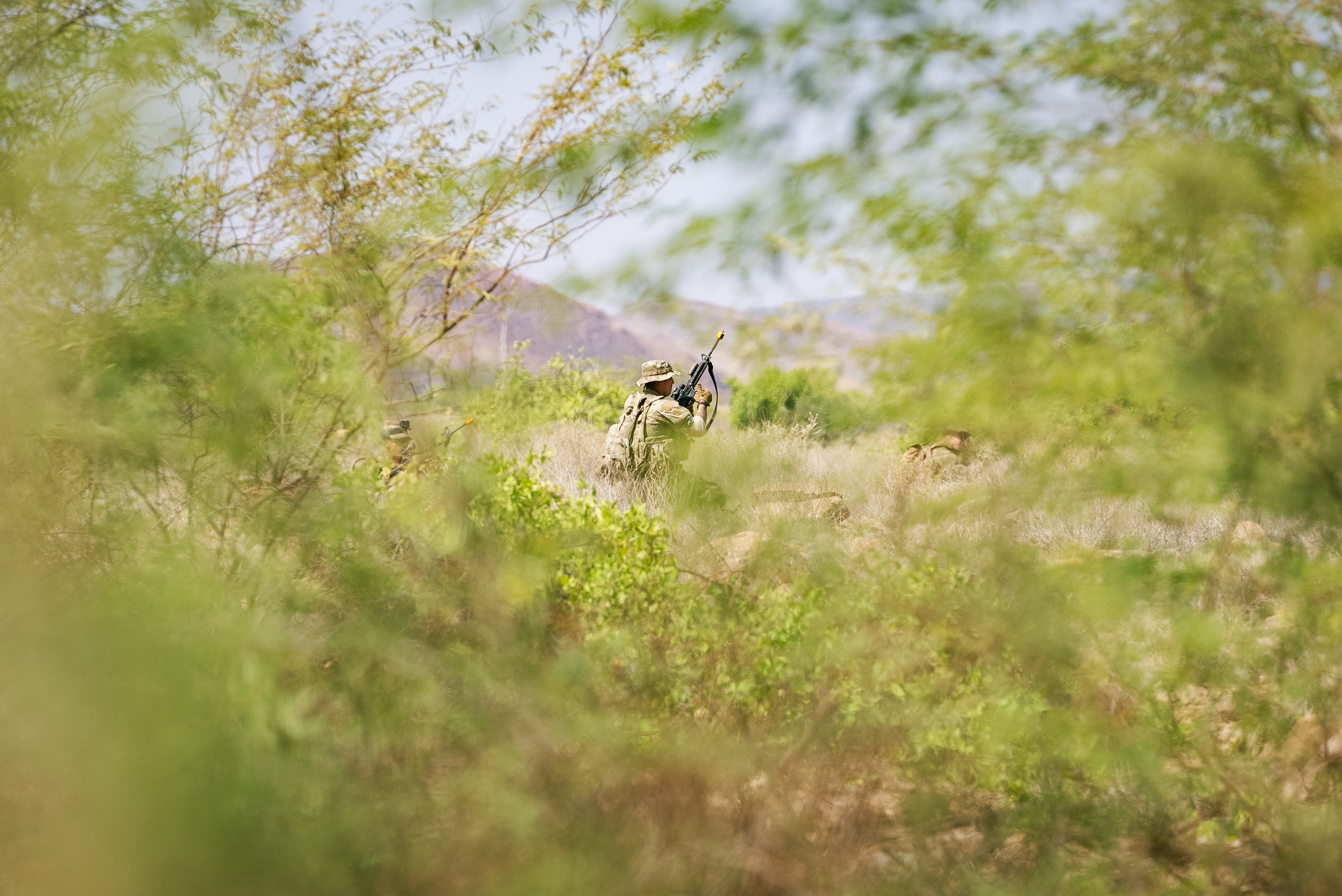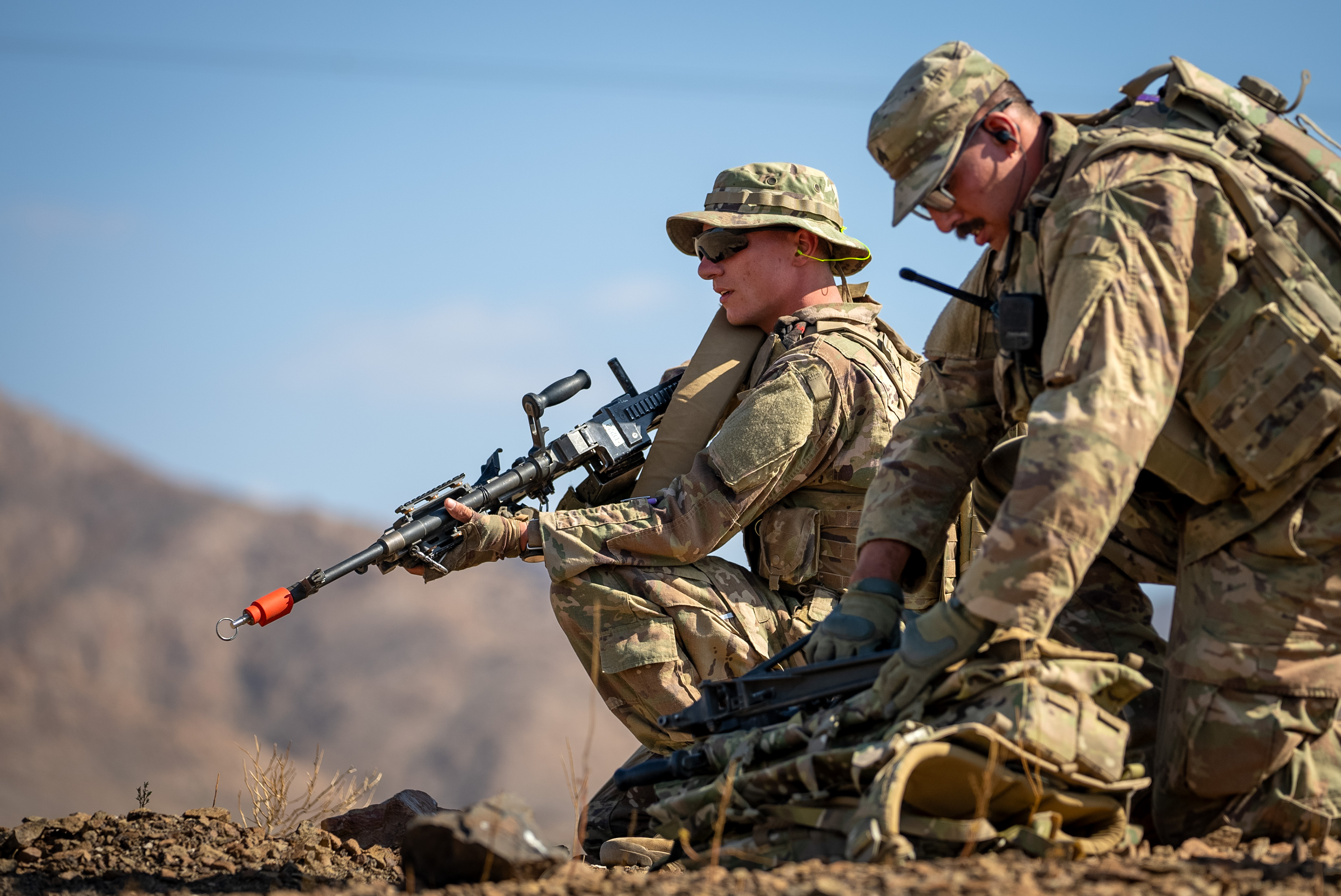 Taskforce Tomahawk soldiers return fire during an ambush on a mountainside during Exercise Wakri near Ali Sabieh, Djibouti, Dec. 5, 2023. (Department of Defense photo by U.S. Air Force Staff Sgt. Dylan Gentile)