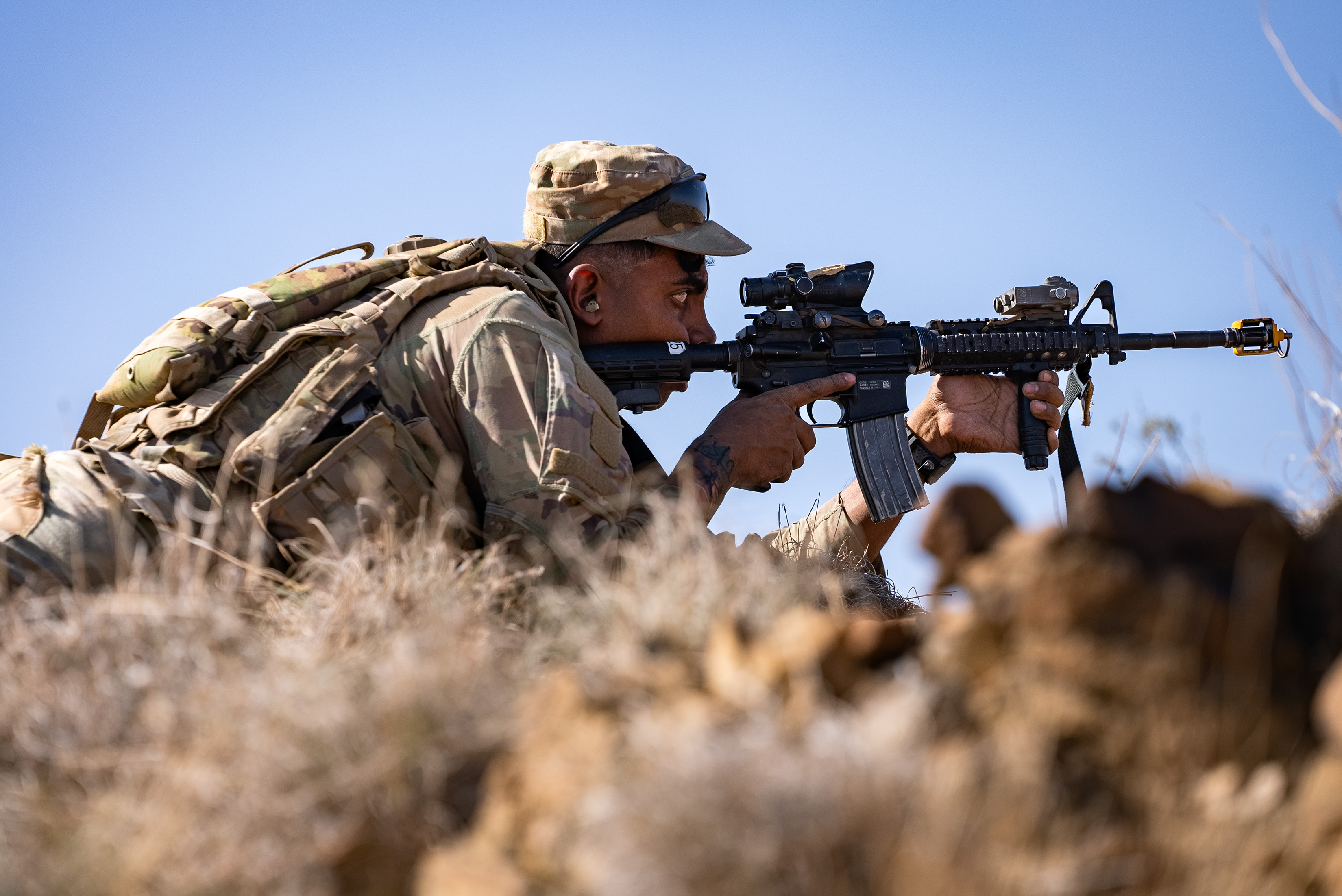 A soldier with Task Force Tomahawk aims over the crest of a hill while holding a defensive position during Exercise Wakri near Dikhill, Djibouti, Dec. 4, 2023. (Department of Defense photo by U.S. Air Force Staff Sgt. Dylan Gentile)