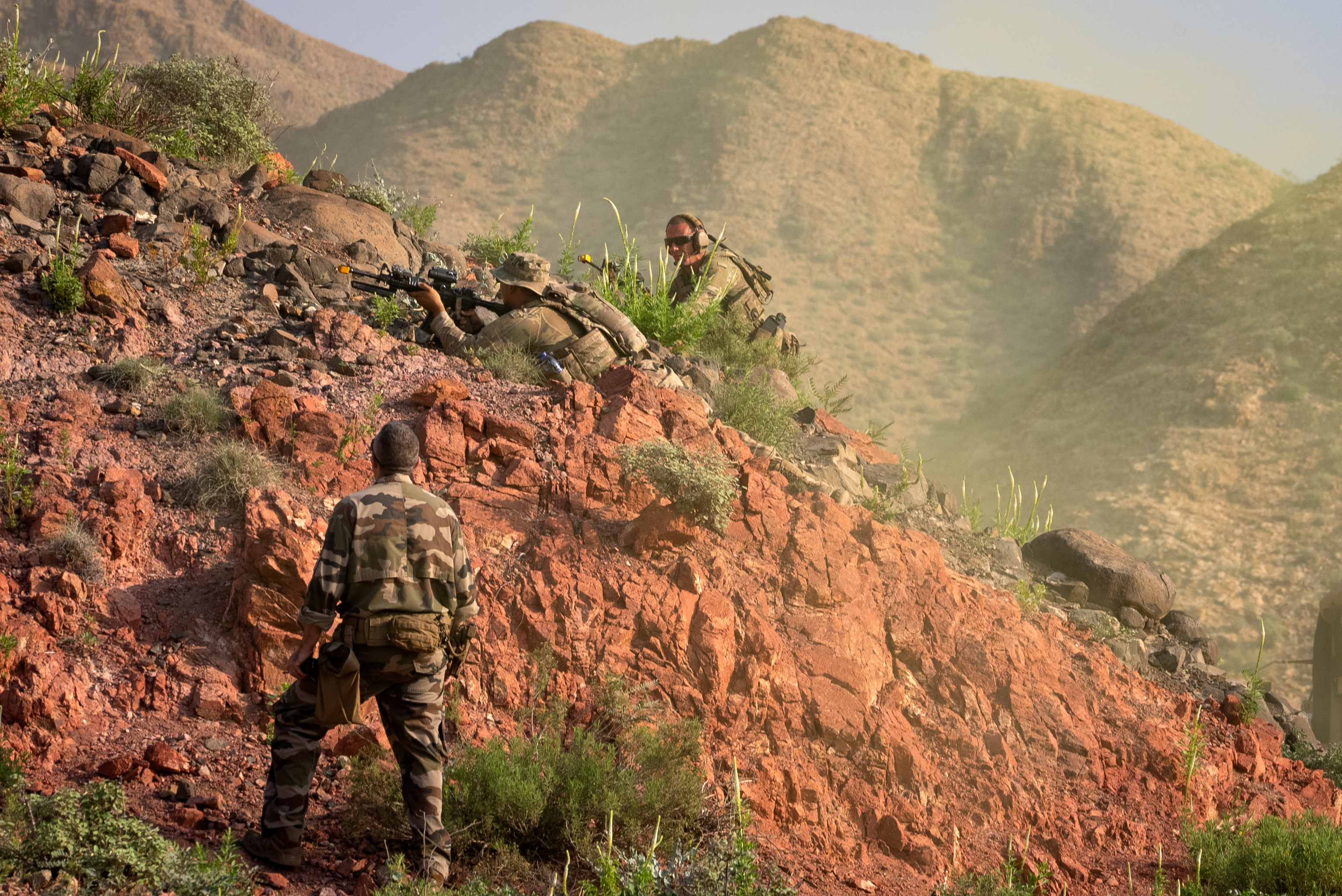 Task Force Tomahawk Soldiers return fire on a mountainside during Exercise Wakri near Ali Sabieh, Djibouti, Dec. 5, 2023. The French soldiers ambushed the Americans as they passed through a narrow mountain valley on their way towards their next waypoint. (Department of Defense photo by U.S. Air Force Staff Sgt. Dylan Gentile)