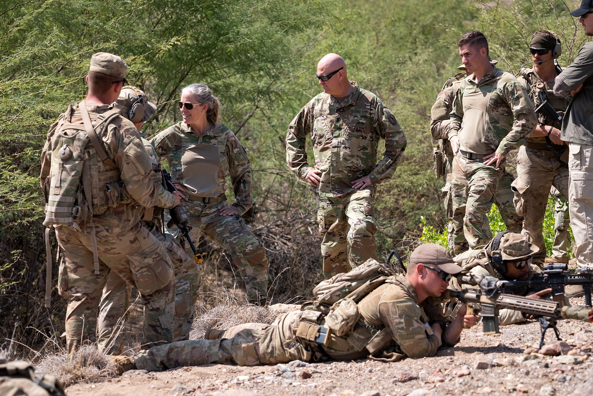 Maj. Gen. Jami Shawley stops to speak to Soldiers during Exercise Wakri near Ali Sabieh, Djibouti, Dec. 5, 2023. Shawley spoke with the service members about the exercise and the multinational training environment. (Department of Defense photo by U.S. Air Force Staff Sgt. Dylan Gentile)