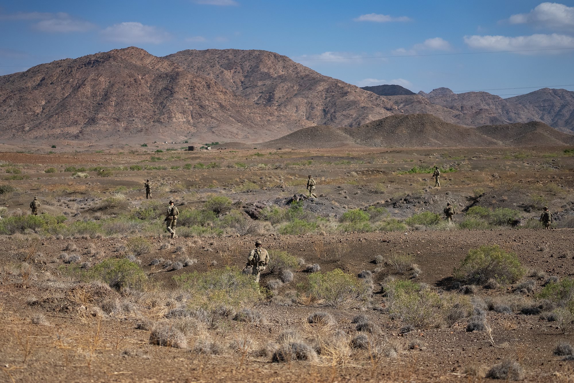 A Task Force Tomahawk platoon maneuvers across the desert during Exercise Wakri near Dikhill, Djibouti on Dec. 6, 2023. Land navigation was one of multiple practical skill sets that Soldiers applied throughout the exercise. (Department of Defense photo by U.S. Air Force Staff Sgt. Dylan Gentile)