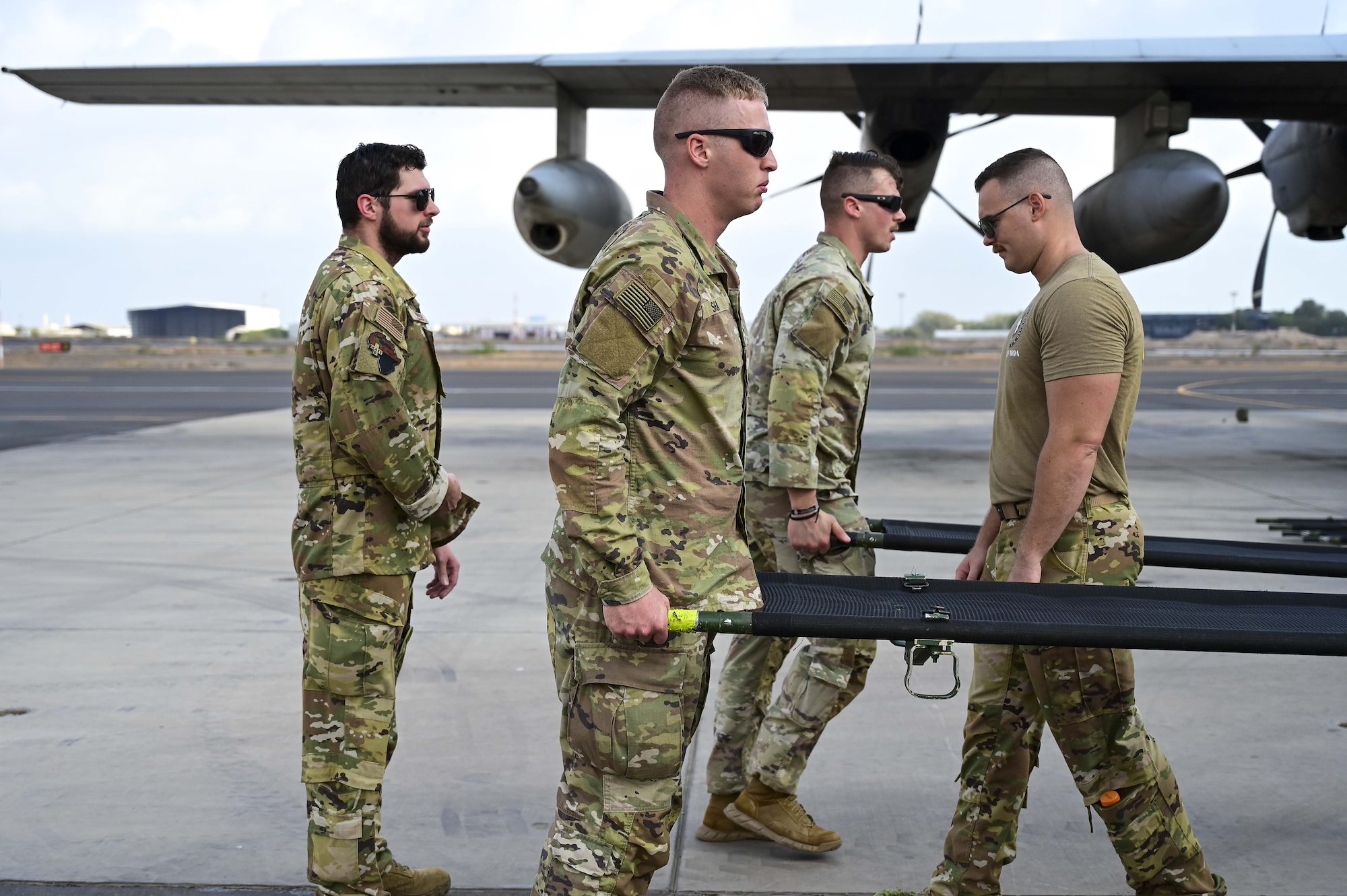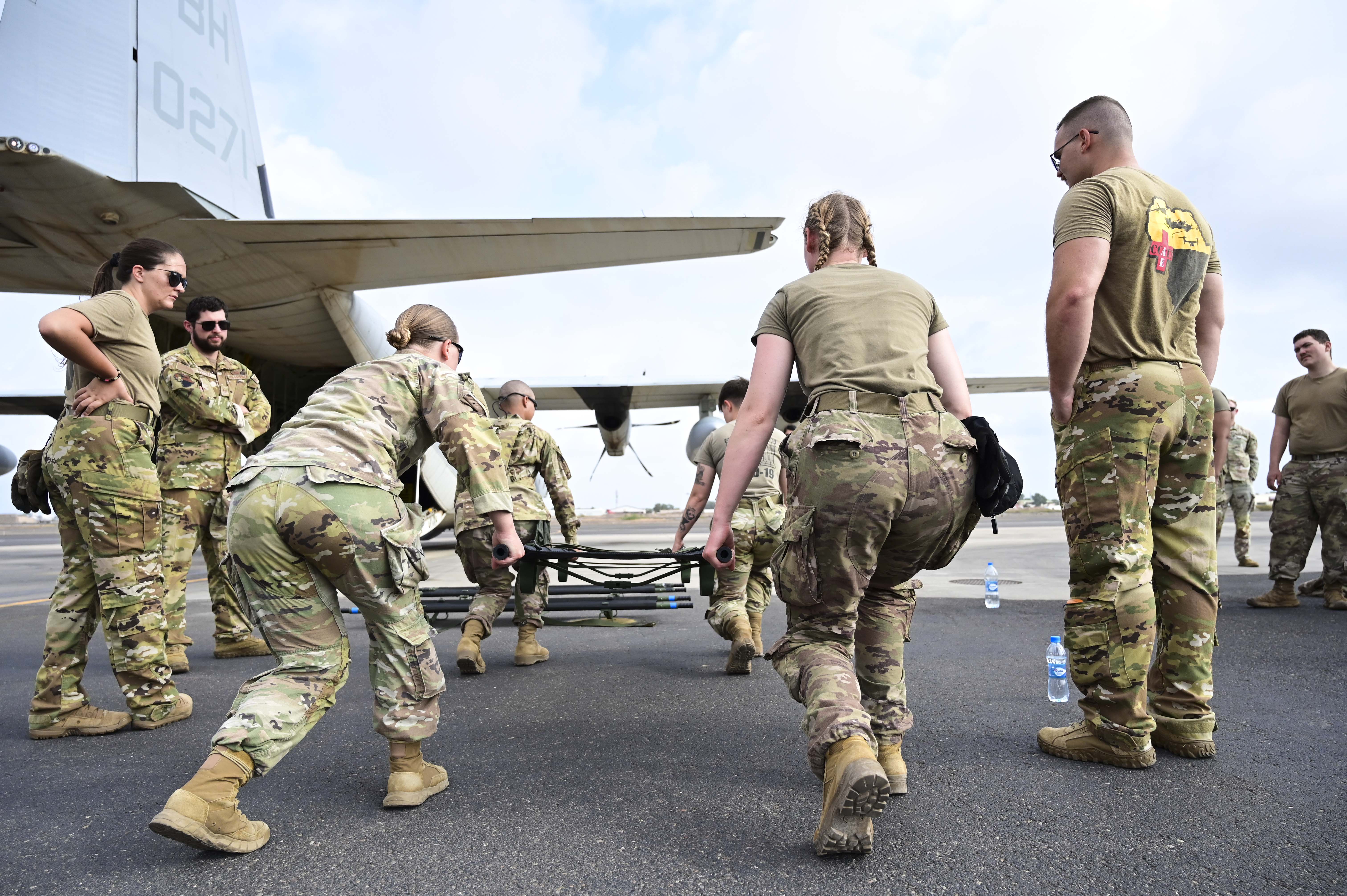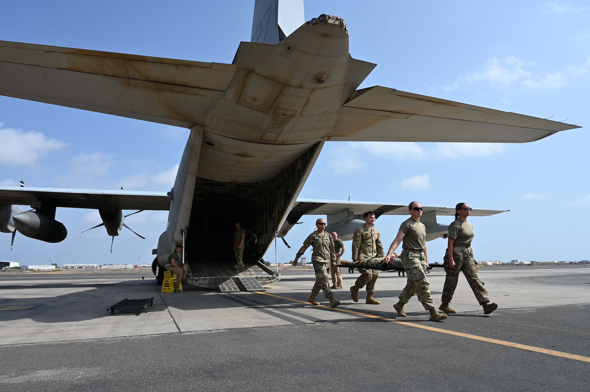 U.S. Army combat medics from Task Force Paxton, 56th Stryker Brigade Combat Team, Pennsylvania National Guard assembled on the tarmac to conduct joint medical evacuation cold-load training aboard a KC-130J aircraft at Camp Lemonnier, Djibouti, March 5, 2024.