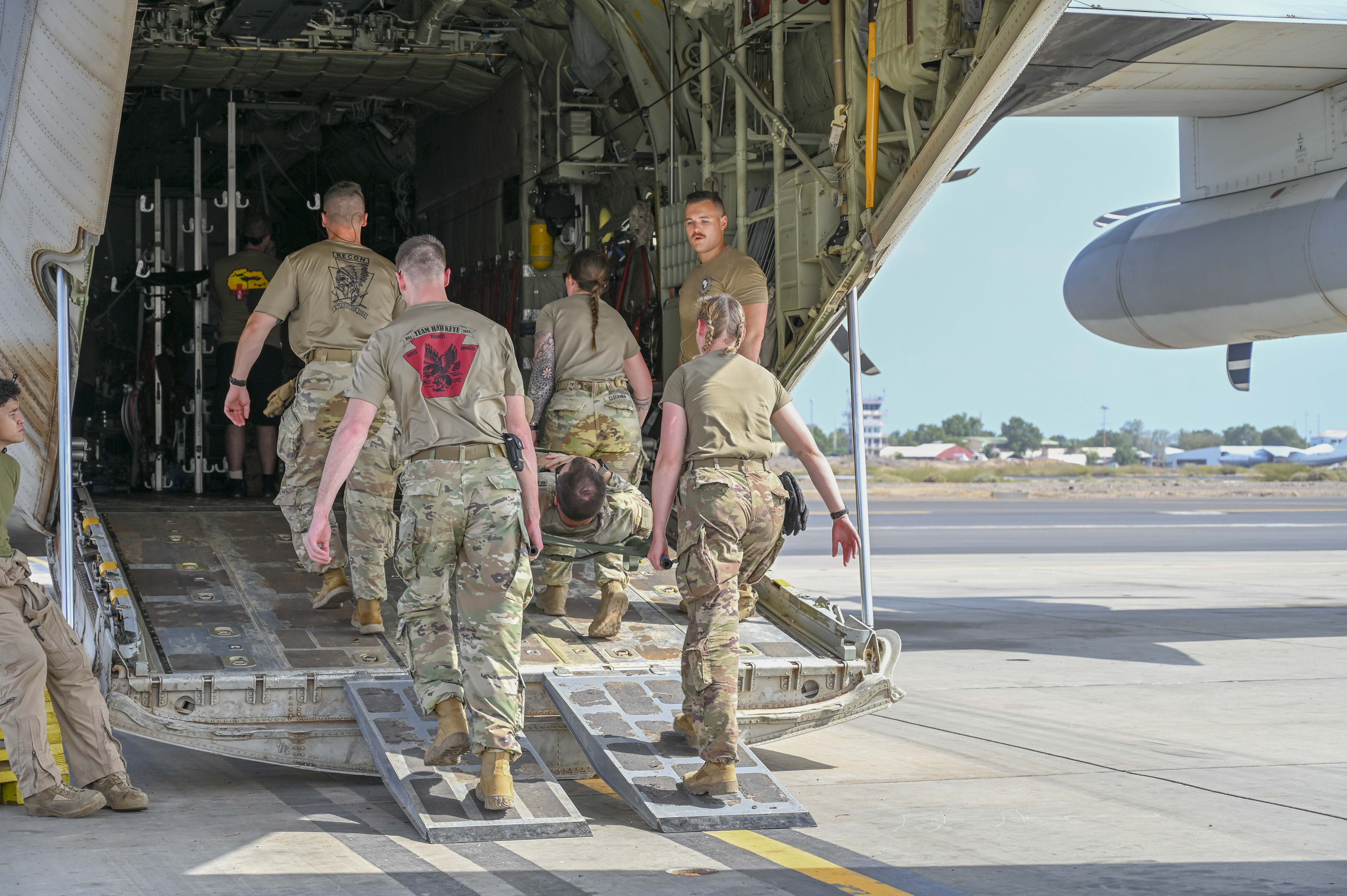 U.S. Army combat medics from Task Force Paxton, 56th Stryker Brigade Combat Team, Pennsylvania National Guard conduct joint medical evacuation cold-load training aboard a KC-130J aircraft at Camp Lemonnier, Djibouti, March 5, 2024. The purpose of the training is to ensure interoperability with key U.S. military assets to expedite patient transfers to and from an aircraft in the event life saving measures and medical evacuation are requested. (U.S. Army National Guard photo by Cpt. Amanda Mayer)