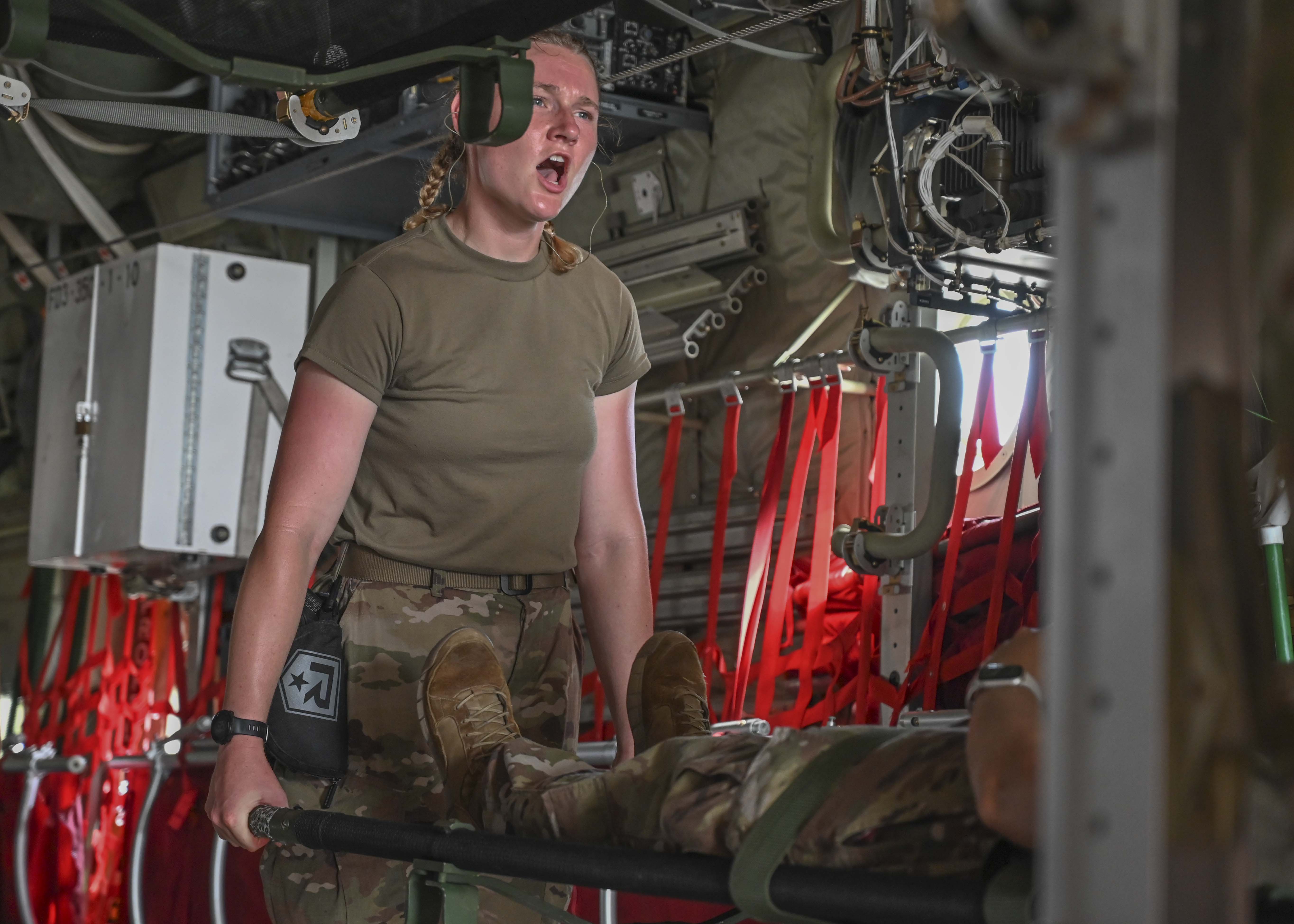 U.S. Army Spc. Kira Angstadt, combat medic, Task Force Paxton, Alpha Company, 2nd Squadron, 104th Cavalry Regiment, 56th Stryker Brigade Combat Team, Pennsylvania National Guard conducts joint medical evacuation cold-load training aboard a KC-130J aircraft at Camp Lemonnier, Djibouti, March 5, 2024. The purpose of the training is to ensure interoperability with key U.S. military assets to expedite patient transfers to and from an aircraft in the event life saving measures and medical evacuation are requested. (U.S. Army National Guard photo by Cpt. Amanda Mayer)