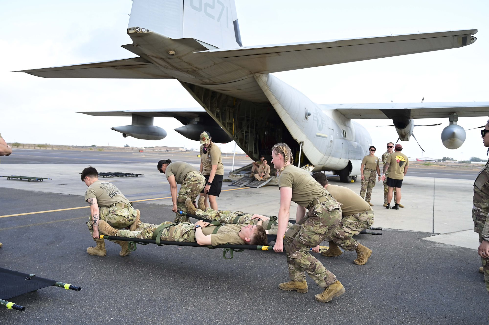 The Air Force Expeditionary Aeromedical Evacuation Flight and the KC-130J loadmasters from Marine Aerial Refueler Transport Squadron 252 facilitated the training with Task Force Paxton medics.