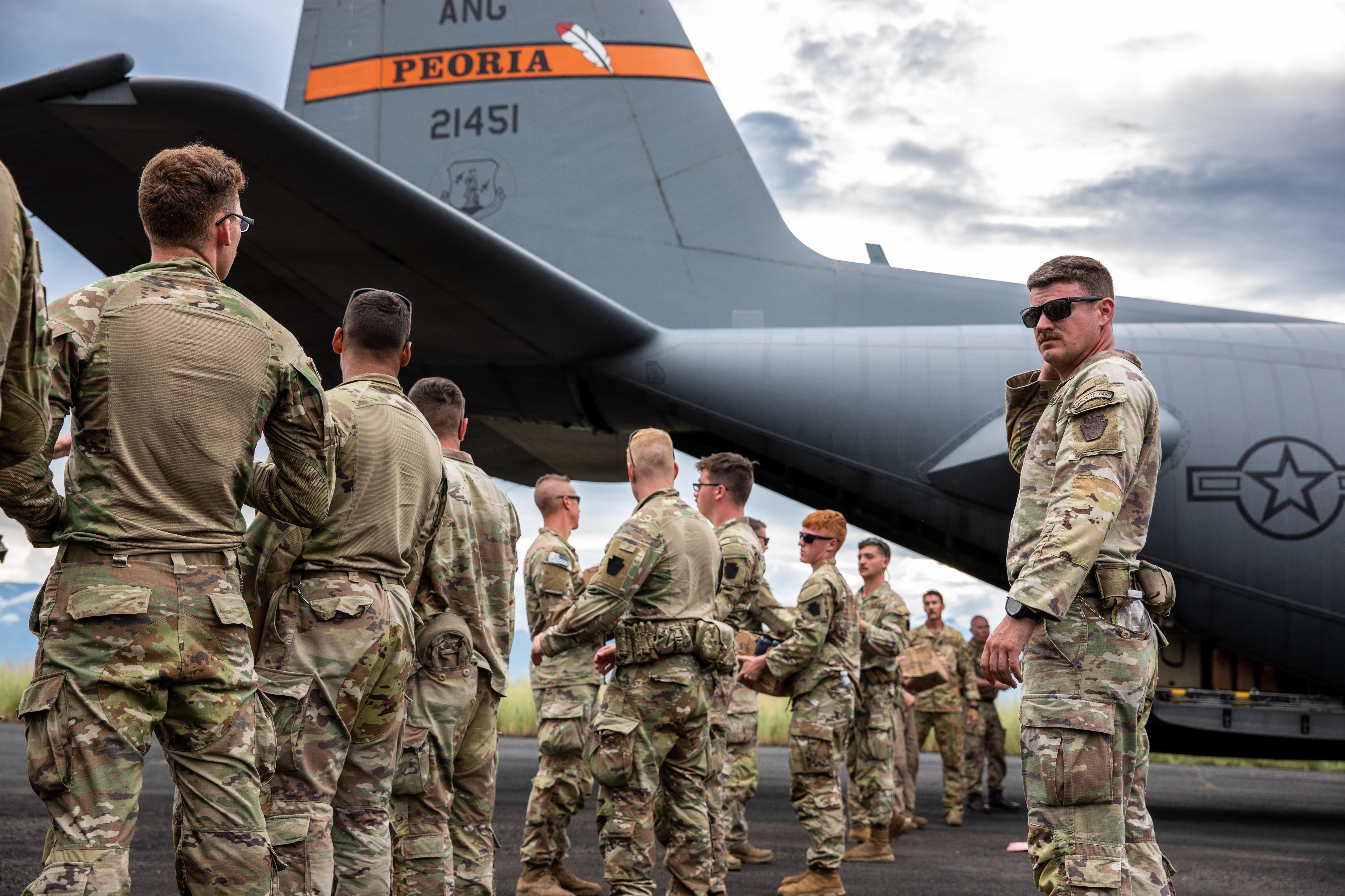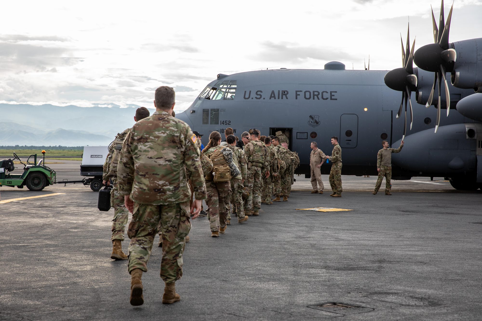 Members of the East Africa Response Force (EARF), assigned to Combined Joint Task Force – Horn of Africa (CJTF-HOA), arrive in Burundi, April 3, 2024. Visiting U.S. Soldiers joined their Burundi National Defence Force (BNDF) counterparts for several days of working together to enhance readiness for humanitarian assistance and disaster response. (U.S. Army photo by Sgt. Joshua DuRant)