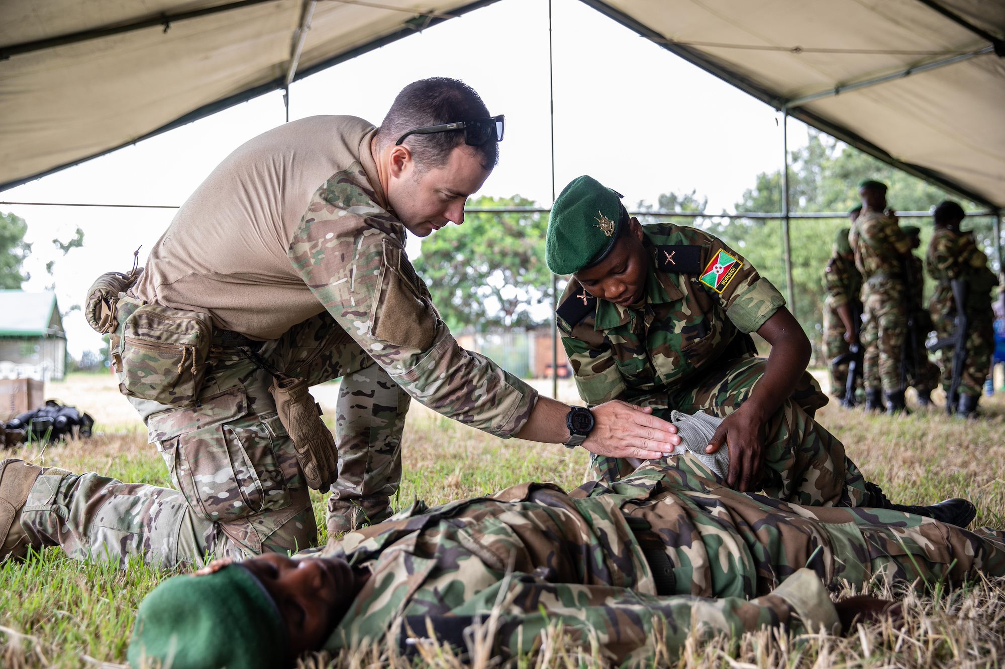 assigned to Combined Joint Task Force – Horn of Africa (CJTF-HOA), demonstrates proper application of a bandage to Burundi National Defence Force (BNDF) Soldiers, April 5, 2024, at Medubugu, Burundi.