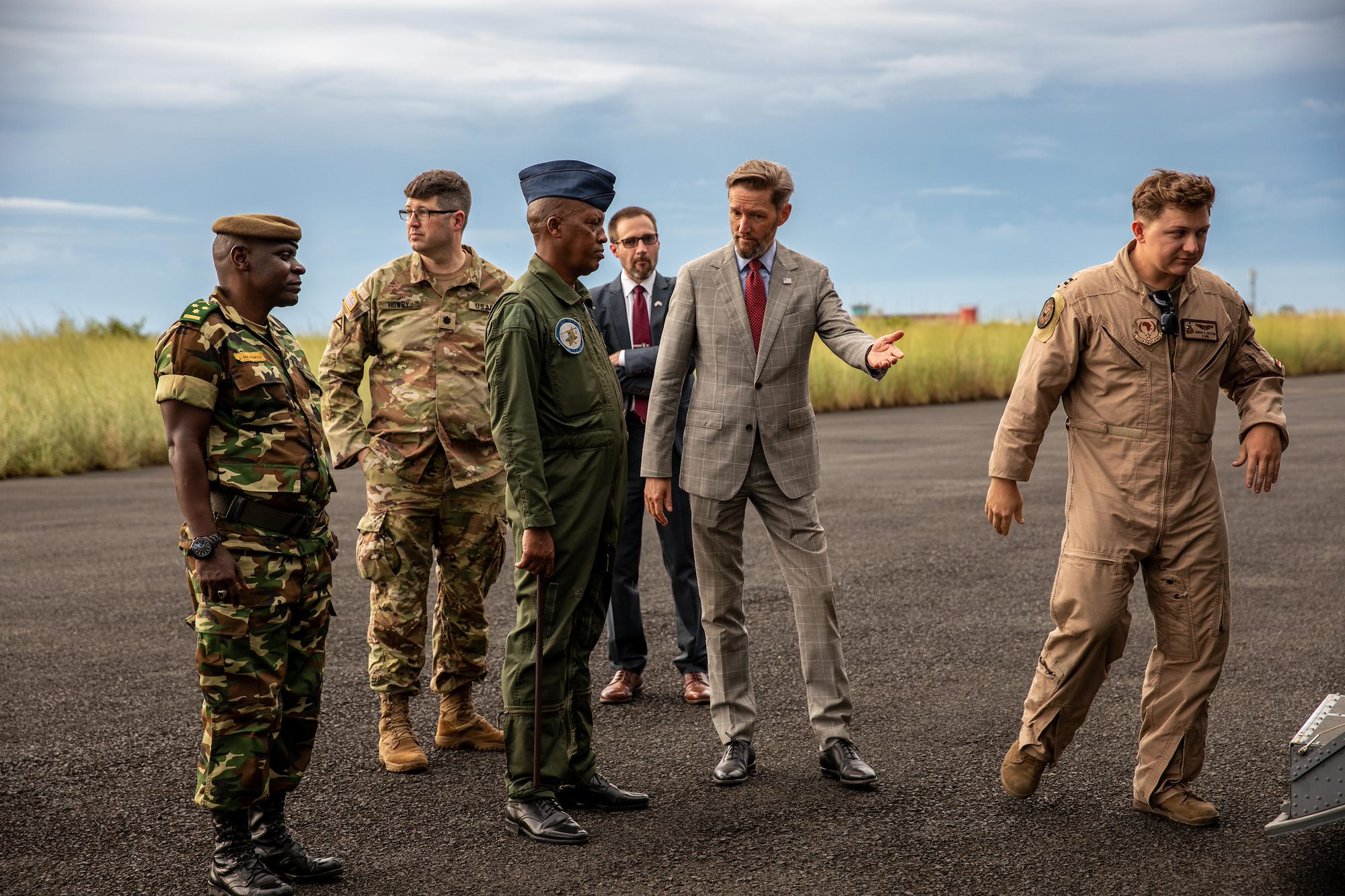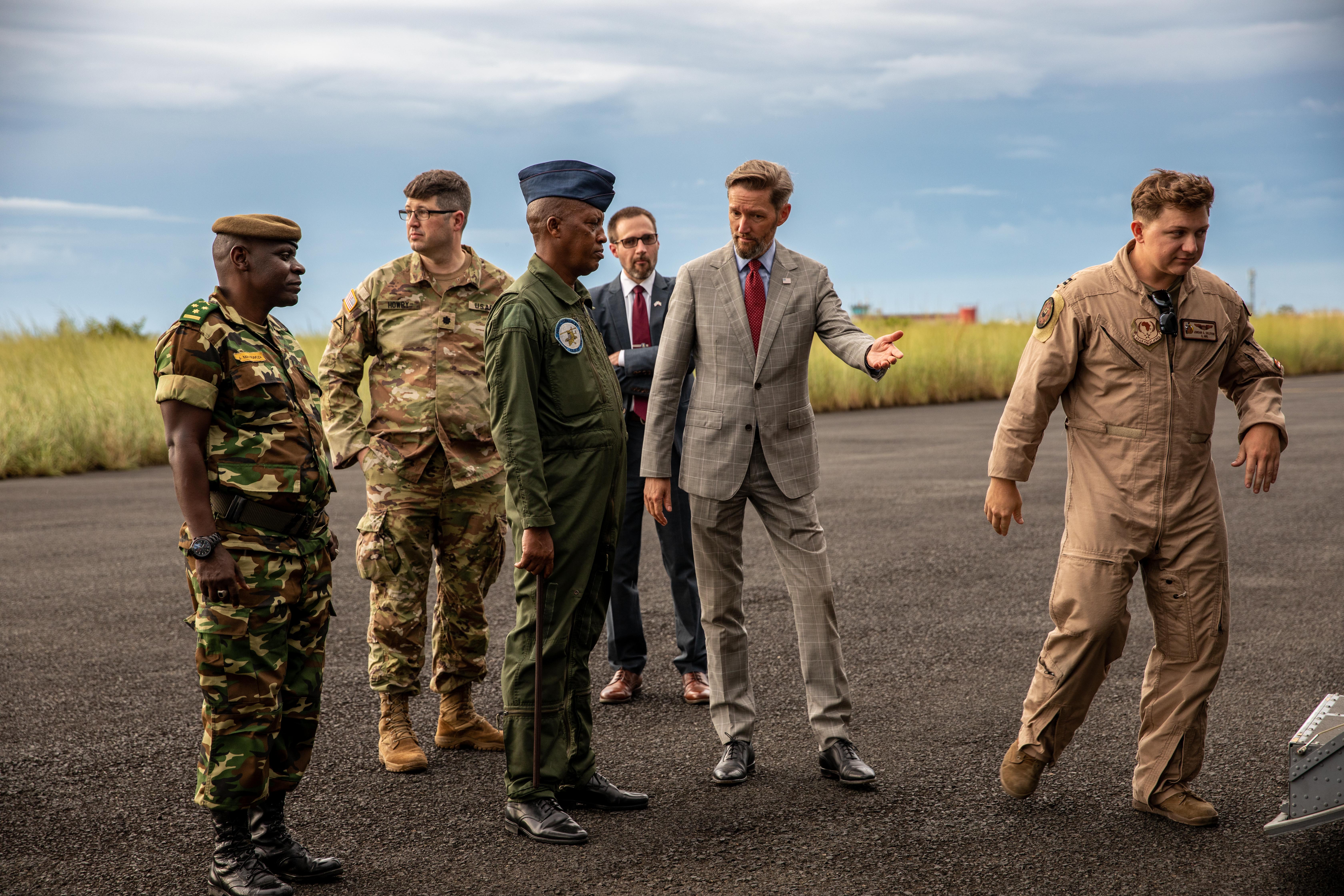 Keith Gilges, the Charge d’Affaires of Burundi, joins senior Burundian officials for a tour of the C-130 aircraft that brought visiting U.S. Army Soldiers of the East Africa Response Force to Burundi, April 3, 2024. The visiting U.S. Army Soldiers joined the Burundi National Defence Force to work together to enhance readiness for humanitarian assistance and disaster response. (U.S. Army photo by Sgt. Joshua DuRant)