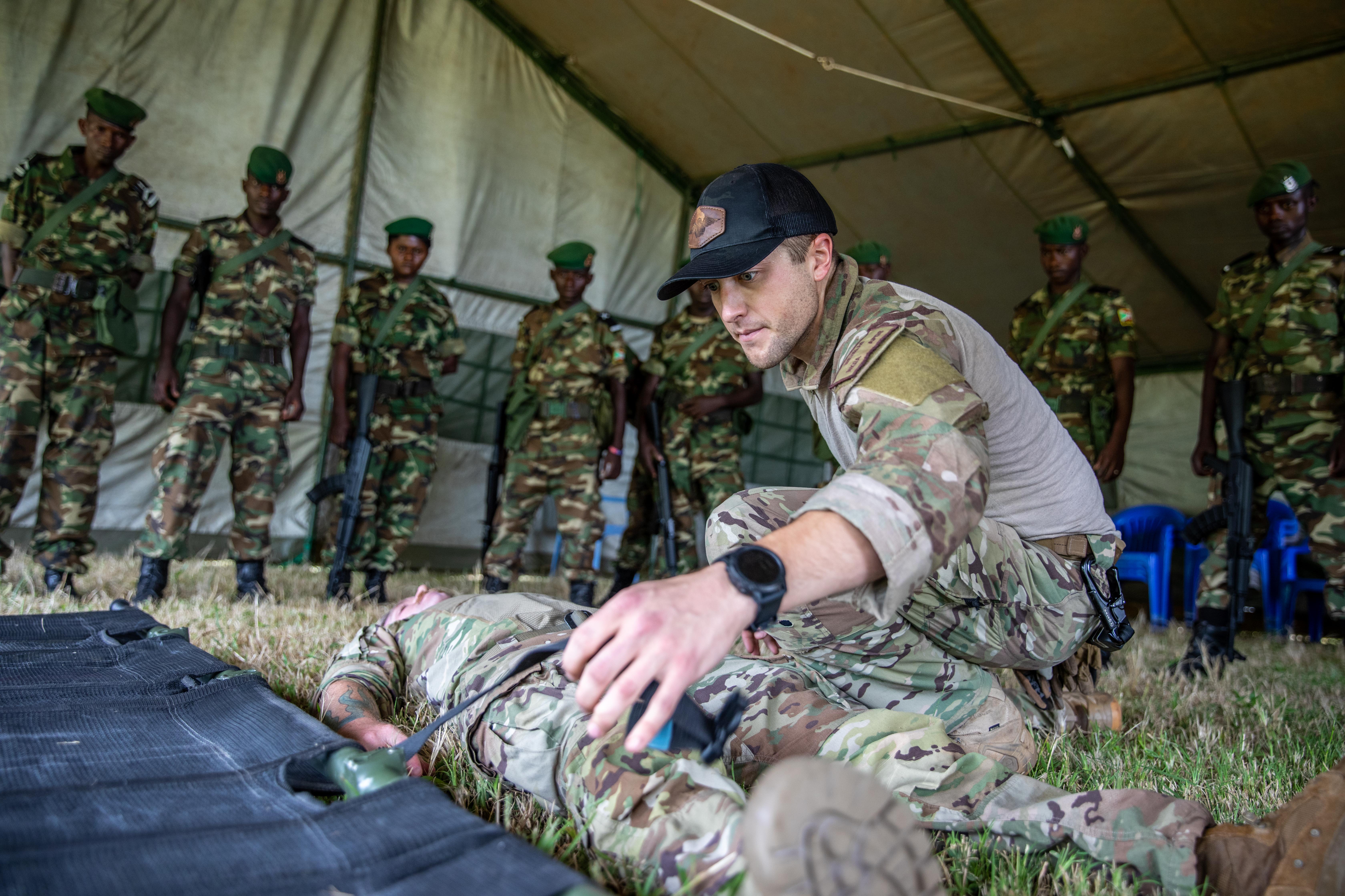 assigned to Combined Joint Task Force-Horn of Africa (CJTF-HOA), demonstrates proper application of a tourniquet to Burundi National Defence Force (BNDF) Soldiers, April 5, 2024, at Medubugu, Burundi.