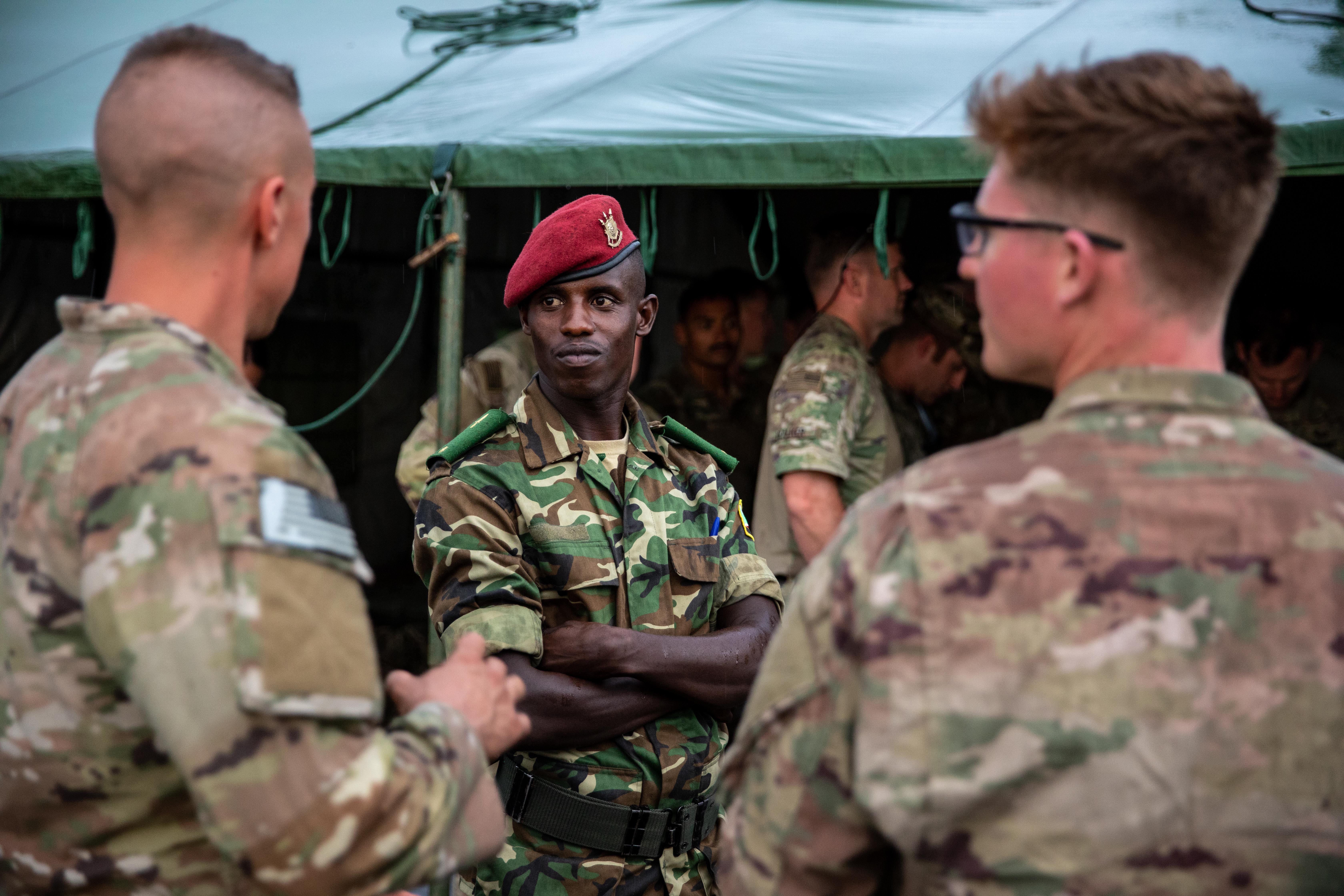 Members of the East Africa Response Force (EARF), assigned to Combined Joint Task Force – Horn of Africa (CJTF-HOA), speak with a Burundi National Defence Force (BNDF) Soldier after arriving in Burundi, April 3, 2024. Visiting U.S. Soldiers joined their BNDF counterparts for several days of working together to enhance readiness for humanitarian assistance and disaster response. (U.S. Army photo by Sgt. Joshua DuRant)