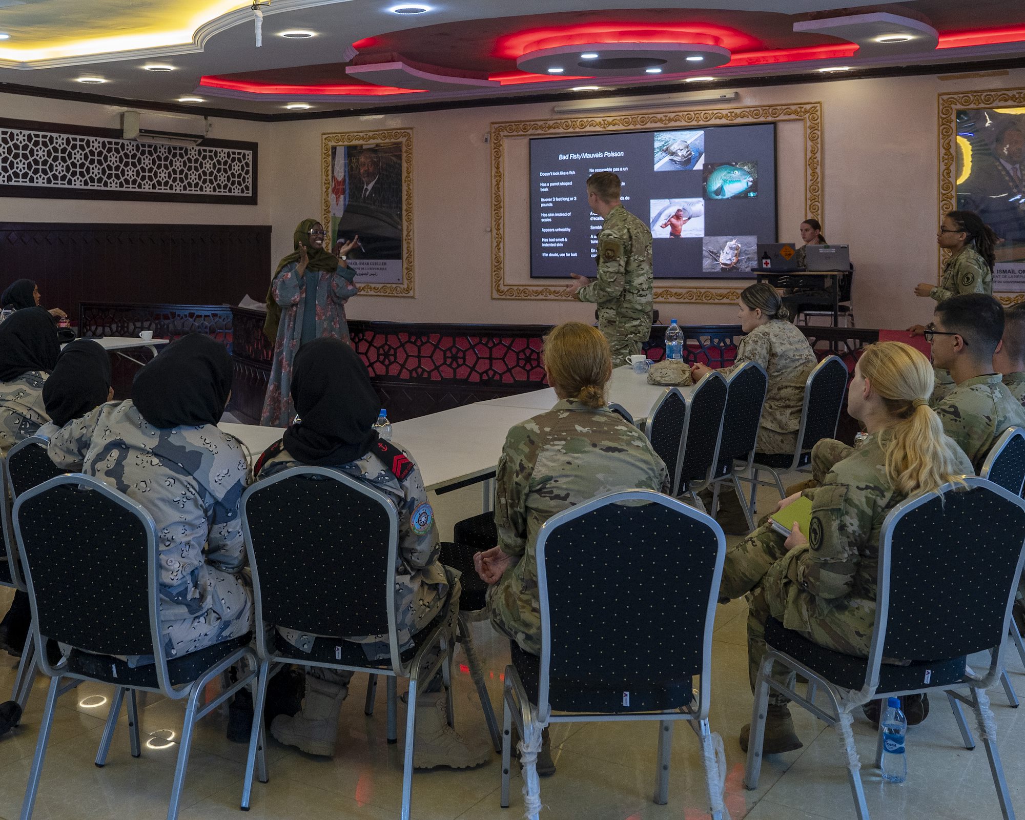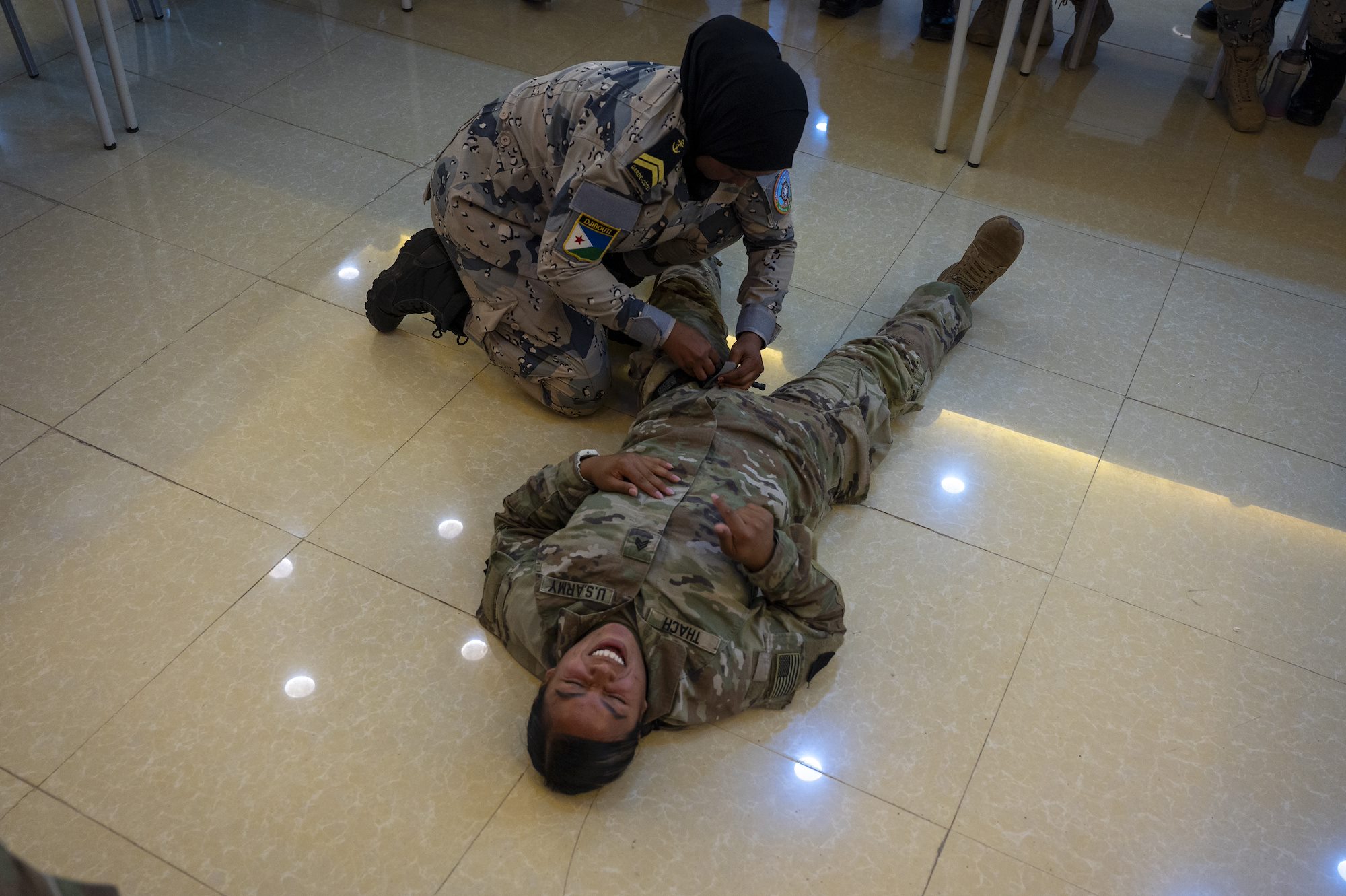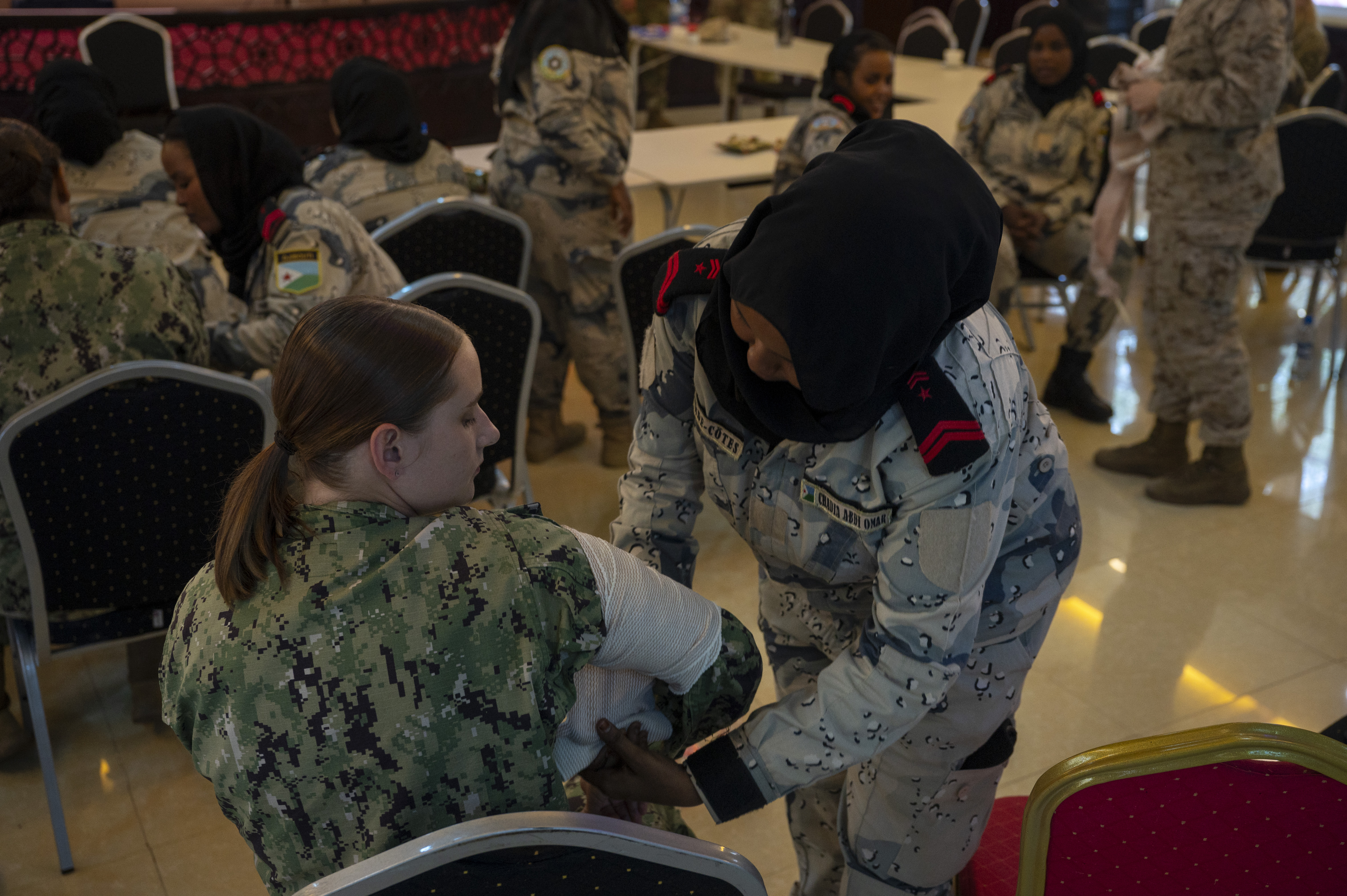 Sea Sisters unfolded over three days bringing together females in the United States military and their partners in the Djiboutian coast guard. Service members in the U.S. Army, Navy, Marines, and Air Force spent the second day discussing maritime survival tactics, practicing medical care, and strengthening relationships.