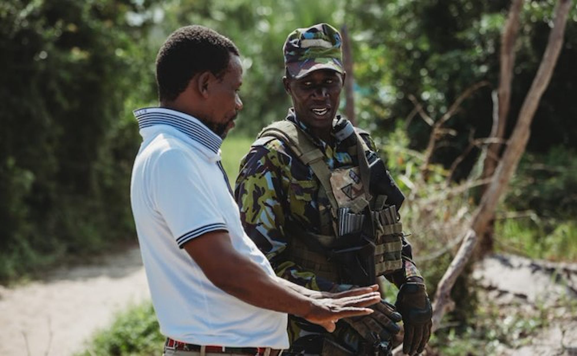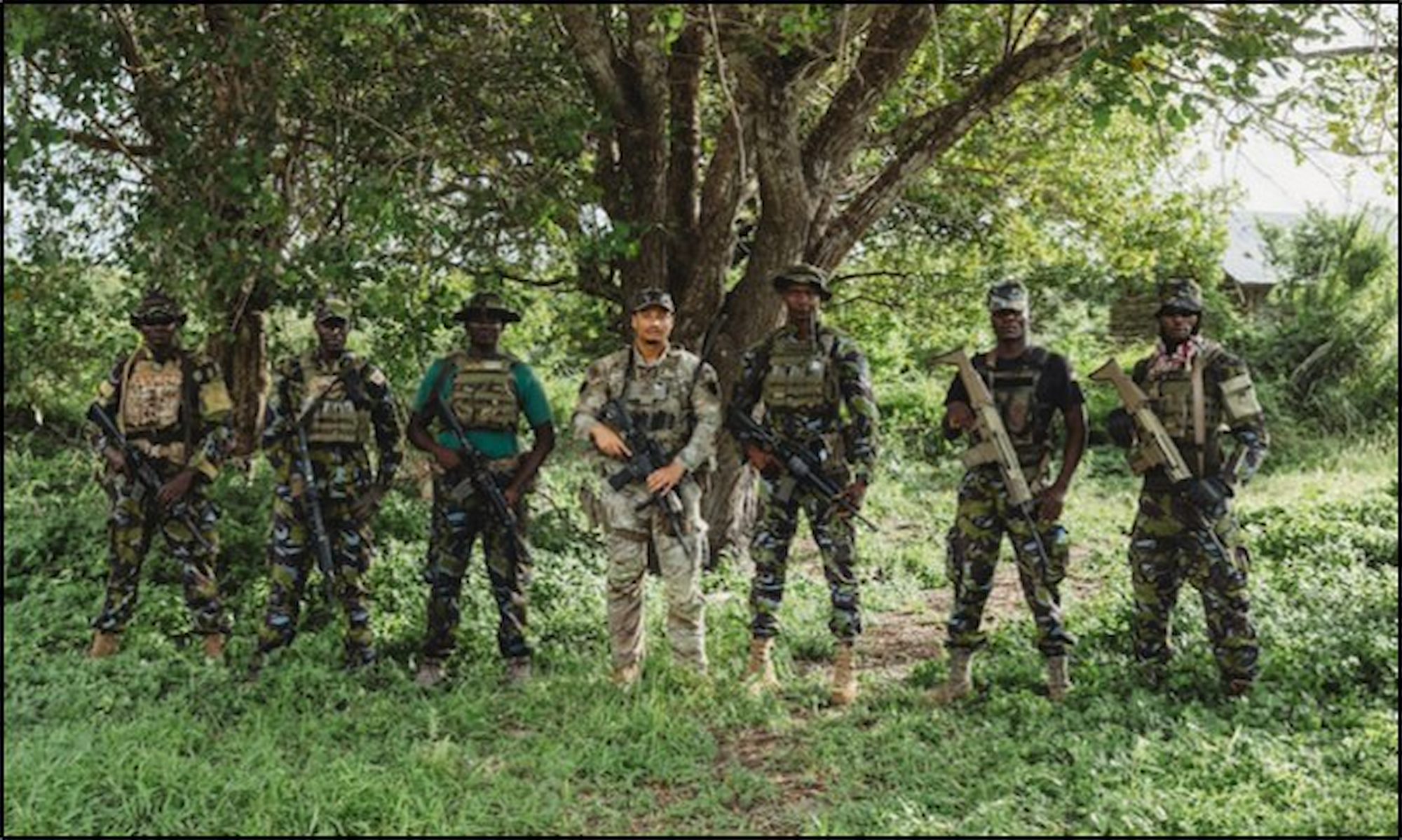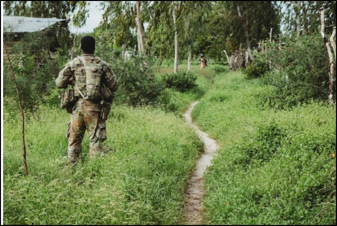 MBK (Manda Bay, Kenya) Task Force Paxton (TFPA) Security Forces (SECFOR) Blacksheep Co., 3rd Platoon, US Army Civil Affairs (CA), USAF Civil Engineers (CE), Kenyan Marines, and Local Village Elders conduct security patrols, Manda Bay, Kenya, May 28, 2024. SECFOR platoon from TFPA, Blacksheep Co, and Kenyan Marine squad provided 360 degree security around the objective to allow CE squad to continue work on an ongoing project. CE had previously installed support posts and built a platform for the water storage tank. On this patrol CE trimmed the support posts, framed in the roof with joists and rafters, installed the tin roof, and prepared the water collection tank for use. TFPA SECFOR provides security in conjunction with Kenyan Marines to facilitate the installation of a water collection point for the local village, strategically enhancing the relationship between all parties.