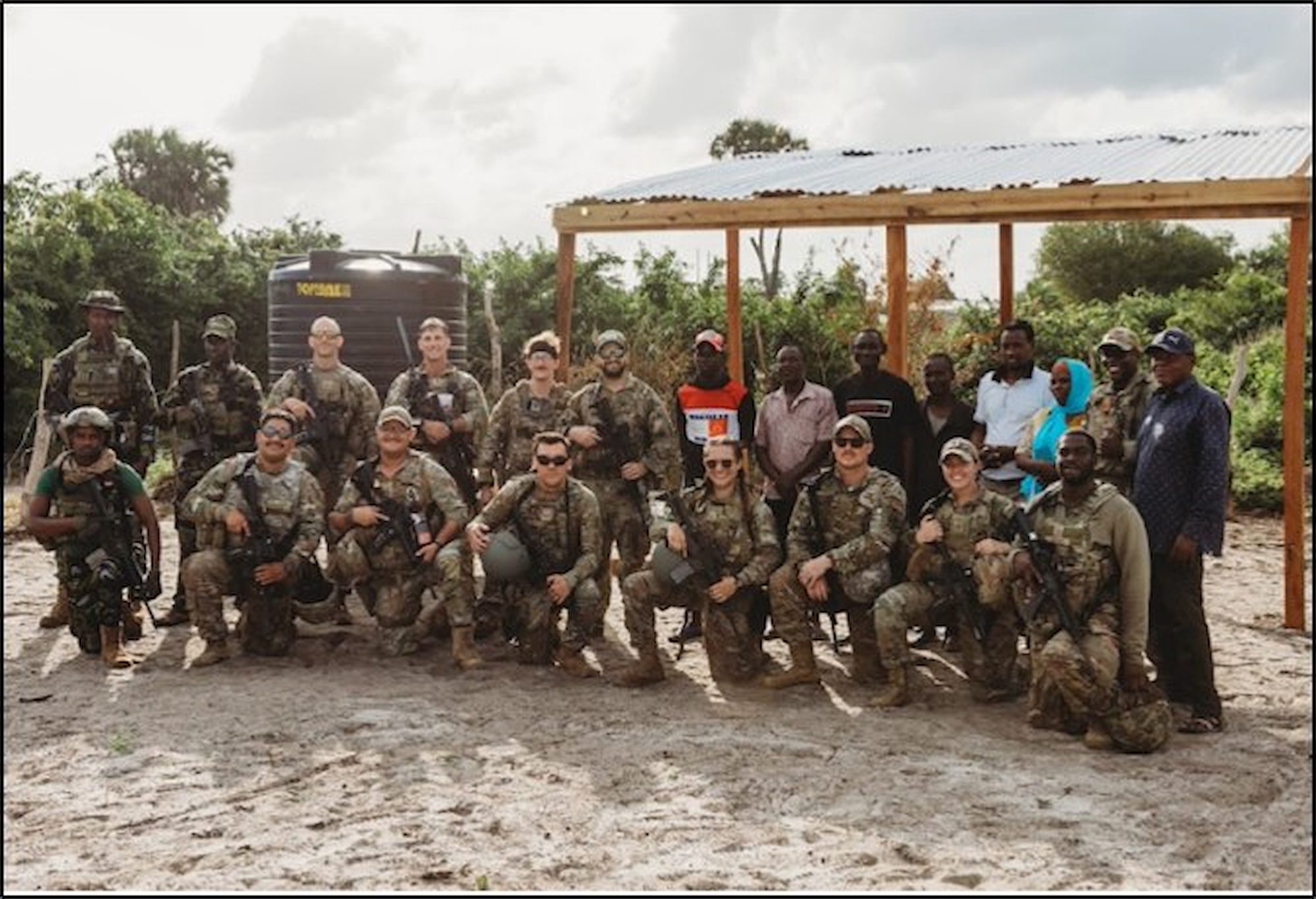 MBK (Manda Bay, Kenya) Task Force Paxton (TFPA) Security Forces (SECFOR) Blacksheep Co., 3rd Platoon, US Army Civil Affairs (CA), USAF Civil Engineers (CE), Kenyan Marines, and Local Village Elders conduct key leader engagements and joint patrols, Manda Bay, Kenya, May 28th, 2024. TFPA SECFOR provides security in conjunction with Kenyan Marines to facilitate the installation of a water collection point for the local village, strategically enhancing the relationship between all parties. SECFOR platoon from TFPA, Blacksheep Co, and Kenyan Marine squad provided 360 degree security around the objective to allow CE squad to continue work on an ongoing project. CE had previously installed support posts and built a platform for the water storage tank. On this patrol CE trimmed the support posts, framed in the roof with joists and rafters, installed the tin roof, and prepared the water collection tank for use. TFPA SECFOR provides security in conjunction with Kenyan Marines to facilitate the installation of a water collection point for the local village, strategically enhancing the relationship between all parties.