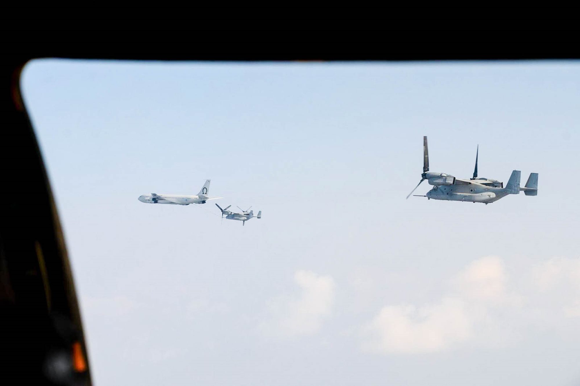 U.S. Marine Corps MV-22 Osprey tiltrotor aircraft, in support of Combined Joint Task Force - Horn of Africa (CJTF-HOA), refuels from a KC-707 over Africa during a readiness exercise over on Sept. 23, 2024. This exercise was a key component of CJTF-HOA’s mission to enhance crisis response capabilities and foster military cooperation with regional partners and U.S. embassies. More than 150 personnel participated, conducting joint training across 67,000 miles, including air refueling, logistical operations, and ground and medical exercises. These efforts showcased U.S. readiness to address security challenges while strengthening the strategic partnership between U.S. and Gabonese forces. (Courtesy Photo)