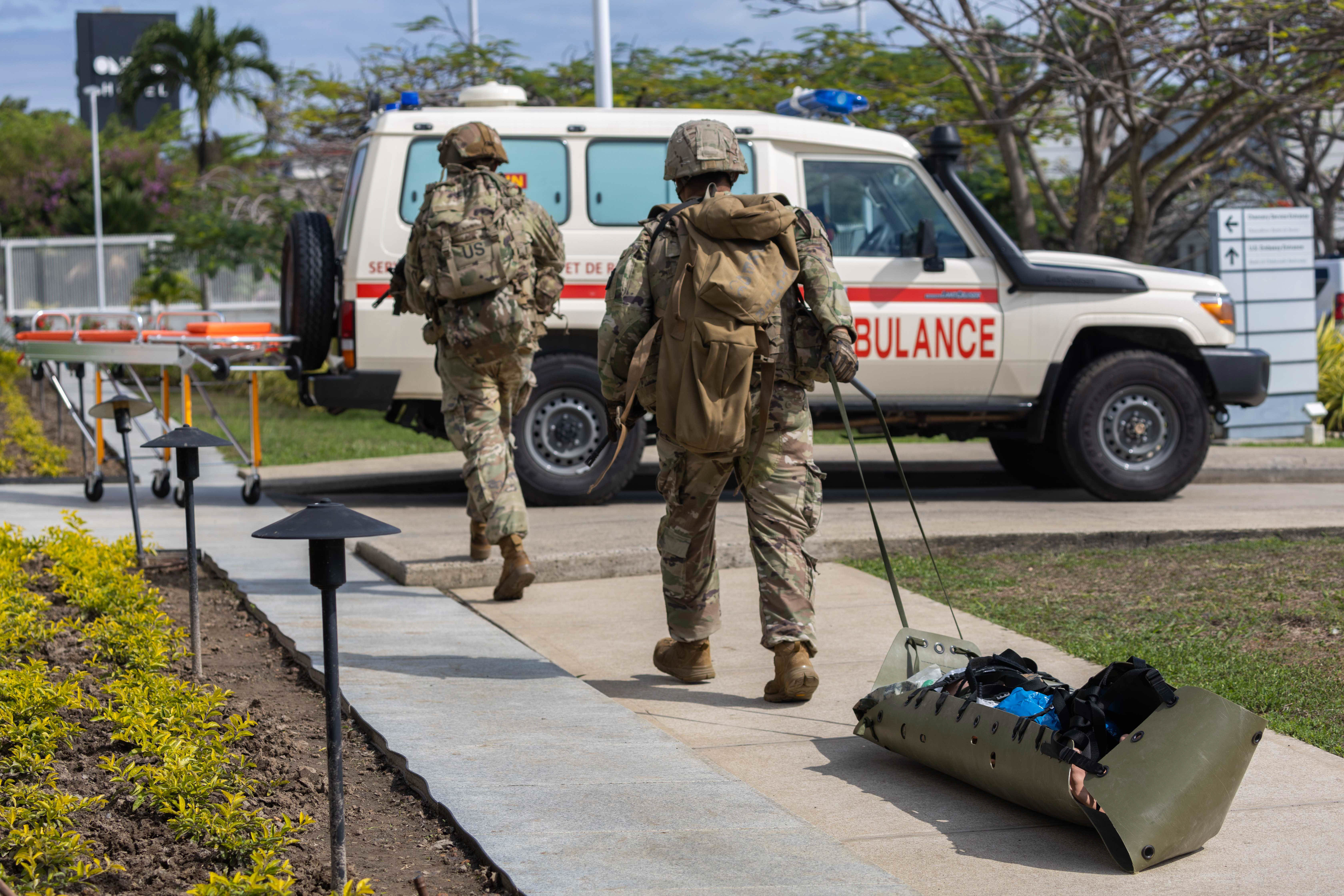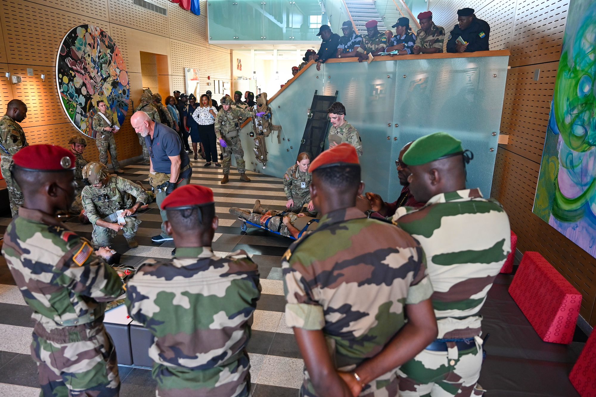 U.S. Armed Forces members from the East Africa Response Force, in support of Combined Joint Task Force - Horn of Africa (CJTF-HOA), perform a medical knowledge exchange with Gabonese forces in Libreville, Gabon, on Sept. 18, 2024. This exercise was a key component of CJTF-HOA’s mission to enhance crisis response capabilities and foster military cooperation with regional partners and U.S. embassies. More than 150 personnel participated, conducting joint training across 67,000 miles, including air refueling, logistical operations, and ground and medical exercises. These efforts showcased U.S. readiness to address security challenges while strengthening the strategic partnership between U.S. and Gabonese forces. (U.S. Army photo by Sgt. 1st Class Cambrin Bassett)