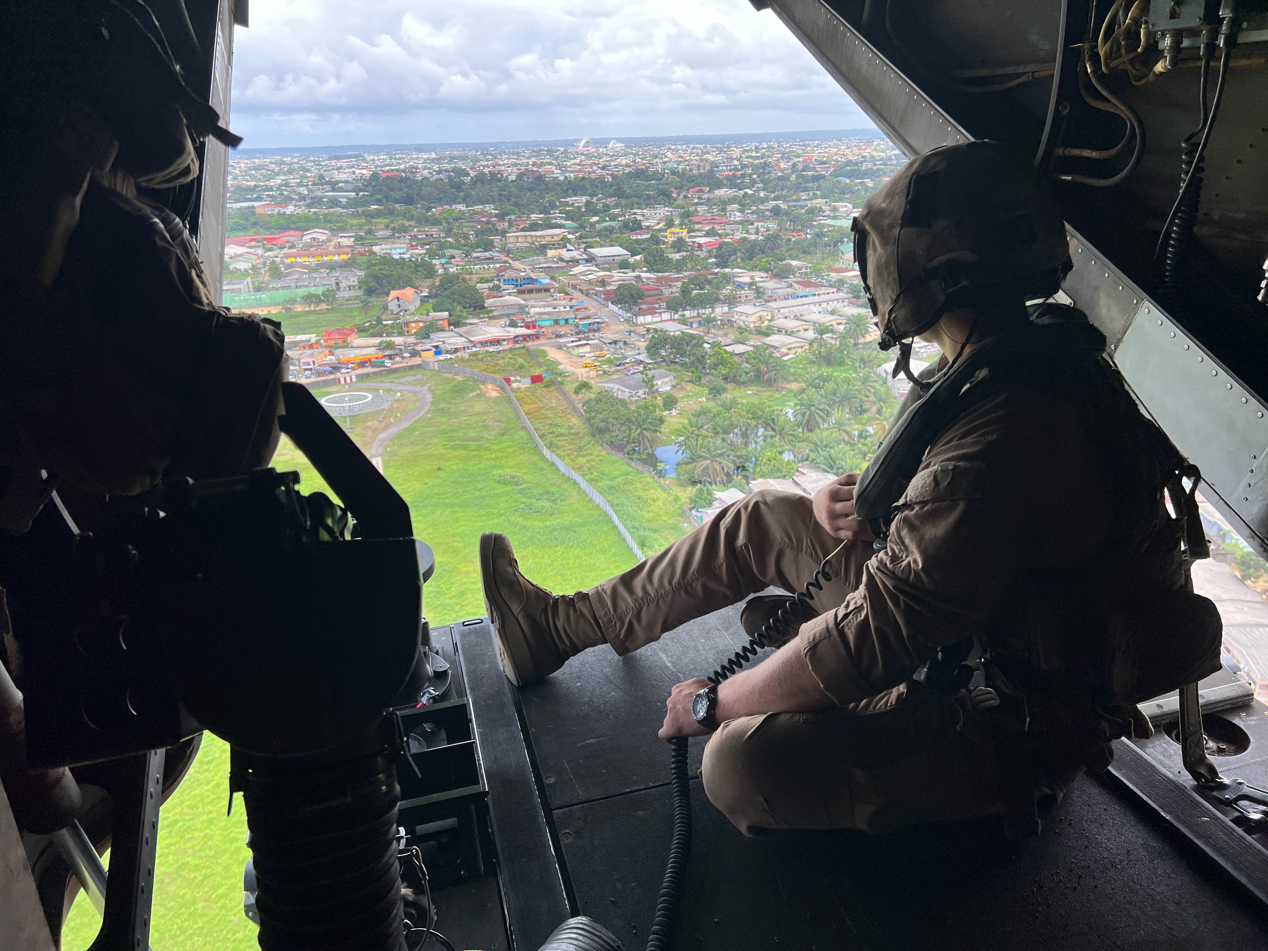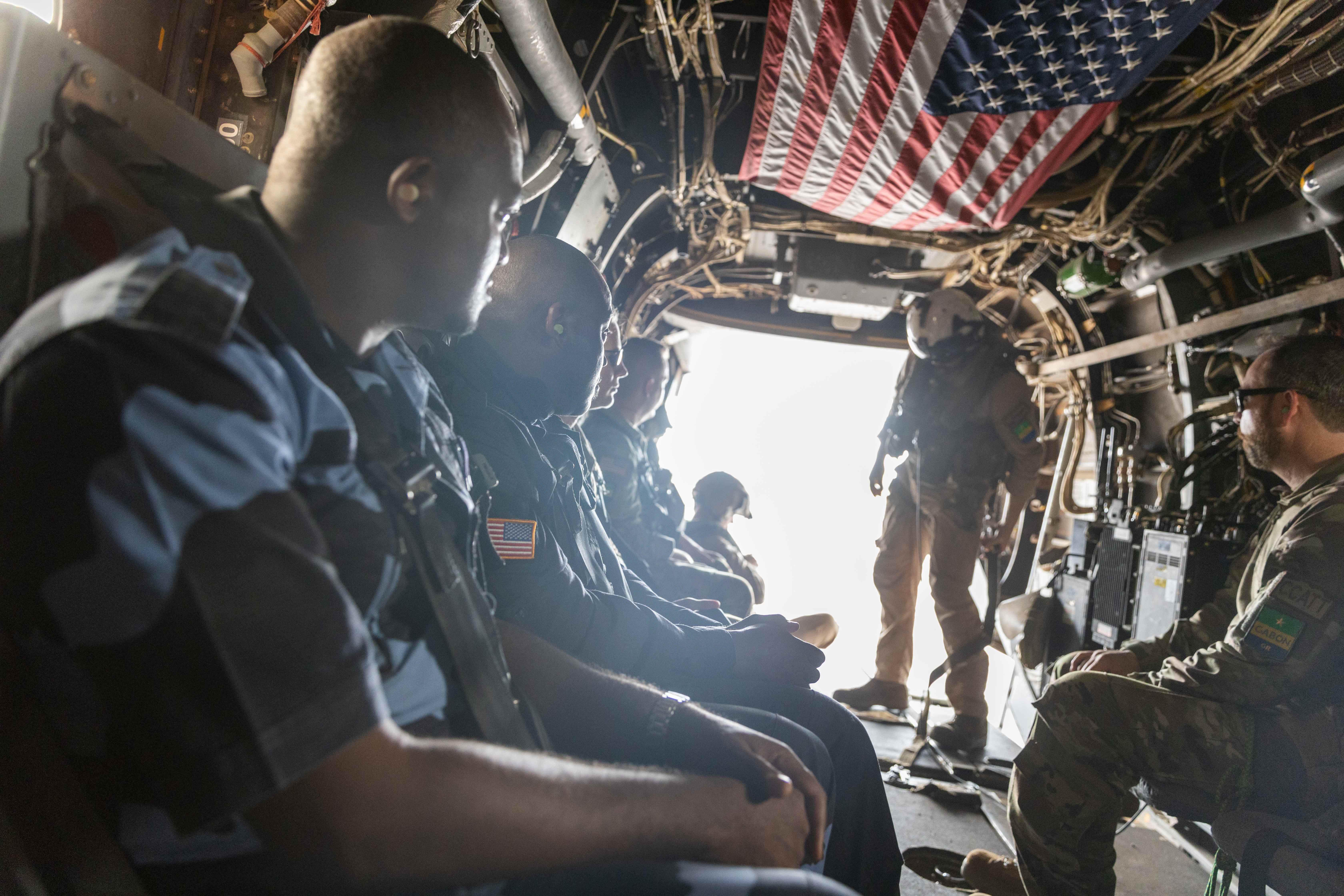 A U.S. Marine, in support of Combined Joint Task Force - Horn of Africa (CJTF-HOA), looks out the back of a U.S. Marine Corps MV-22 Osprey aircraft during a readiness exercise in Libreville, Gabon, on Sept. 19, 2024. This exercise was a key component of CJTF-HOA’s mission to enhance crisis response capabilities and foster military cooperation with regional partners and U.S. embassies. More than 150 personnel participated, conducting joint training across 67,000 miles, including air refueling, logistical operations, and ground and medical exercises. These efforts showcased U.S. readiness to address security challenges while strengthening the strategic partnership between U.S. and Gabonese forces. (U.S. Army photo by Sgt. 1st Class Cambrin Bassett)