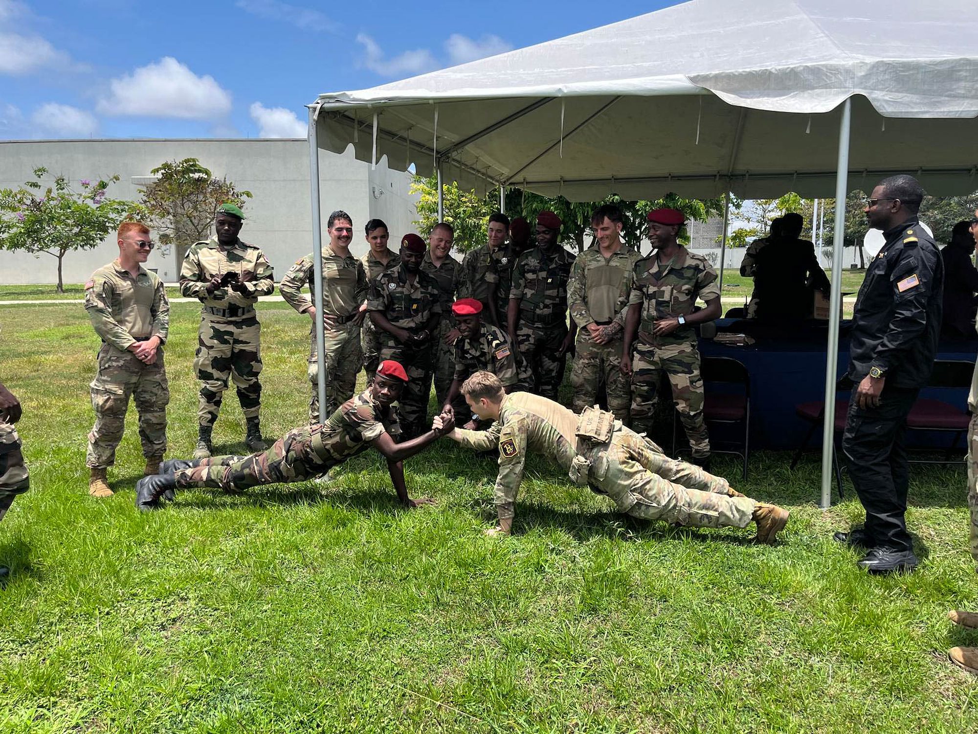 U.S. Armed forces members from the East Africa Response Force, in support of Combined Joint Task Force - Horn of Africa (CJTF-HOA), perform push-up handshakes with Gabonese forces in Libreville, Gabon, on Sept. 18, 2024. This exercise was a key component of CJTF-HOA’s mission to enhance crisis response capabilities and foster military cooperation with regional partners and U.S. embassies. More than 150 personnel participated, conducting joint training across 67,000 miles, including air refueling, logistical operations, and ground and medical exercises. These efforts showcased U.S. readiness to address security challenges while strengthening the strategic partnership between U.S. and Gabonese forces. (U.S. Army photo by Sgt. 1st Class Cambrin Bassett)