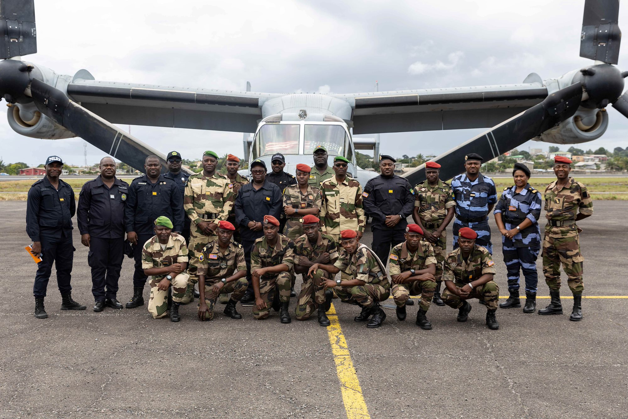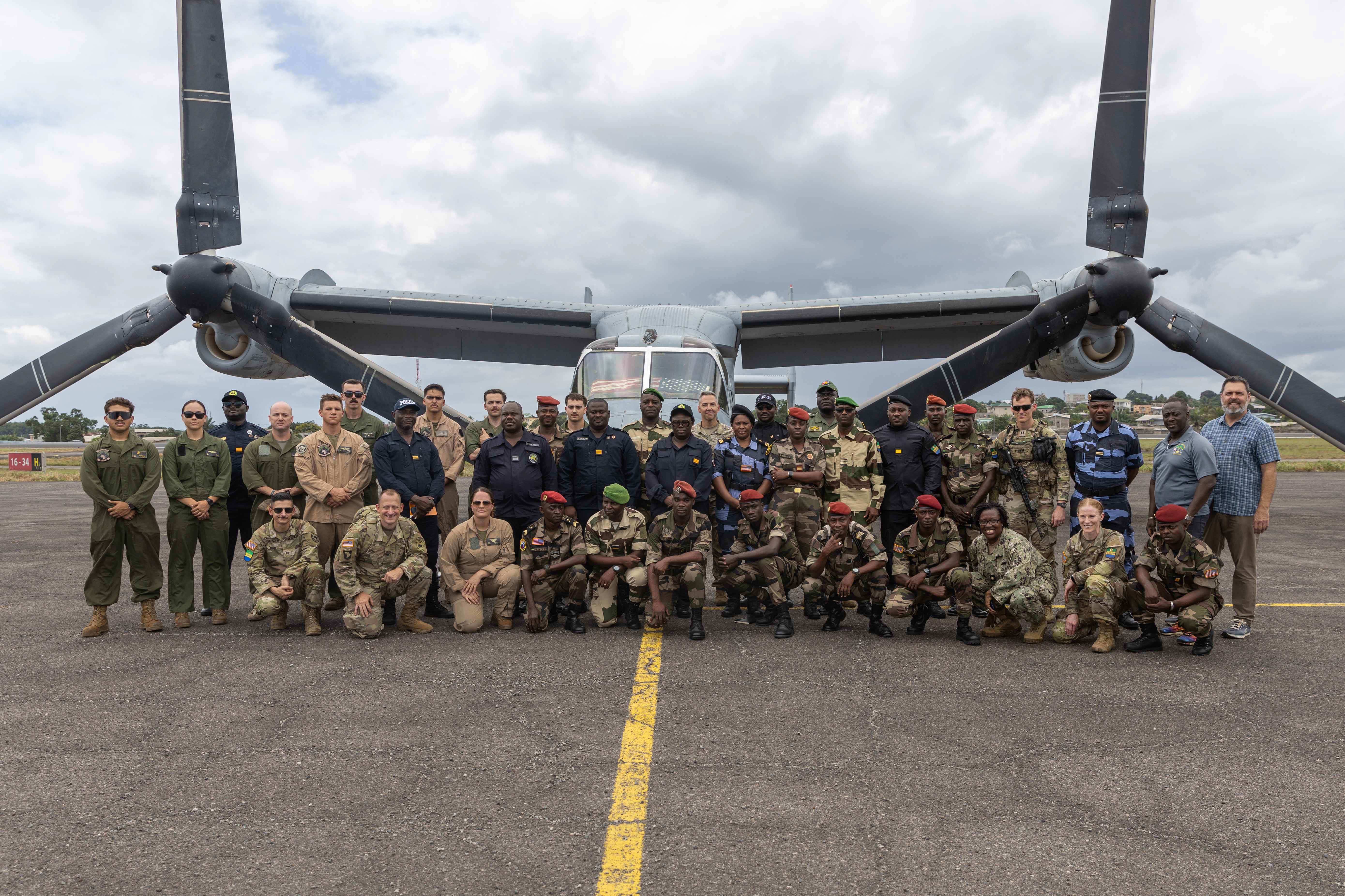 Members of the Gabonese forces pose for a group photo in front of a U.S. Marine Corps MV-22 Osprey aircraft during a Combined Joint Task Force - Horn of Africa (CJTF-HOA) readiness exercise in Libreville, Gabon, on Sept. 18, 2024. This exercise was a key component of CJTF-HOA’s mission to enhance crisis response capabilities and foster military cooperation with regional partners and U.S. embassies. More than 150 personnel participated, conducting joint training across 67,000 miles, including air refueling, logistical operations, and ground and medical exercises. These efforts showcased U.S. readiness to address security challenges while strengthening the strategic partnership between U.S. and Gabonese forces. (U.S. Army photo by Cpl. Mark Davis)