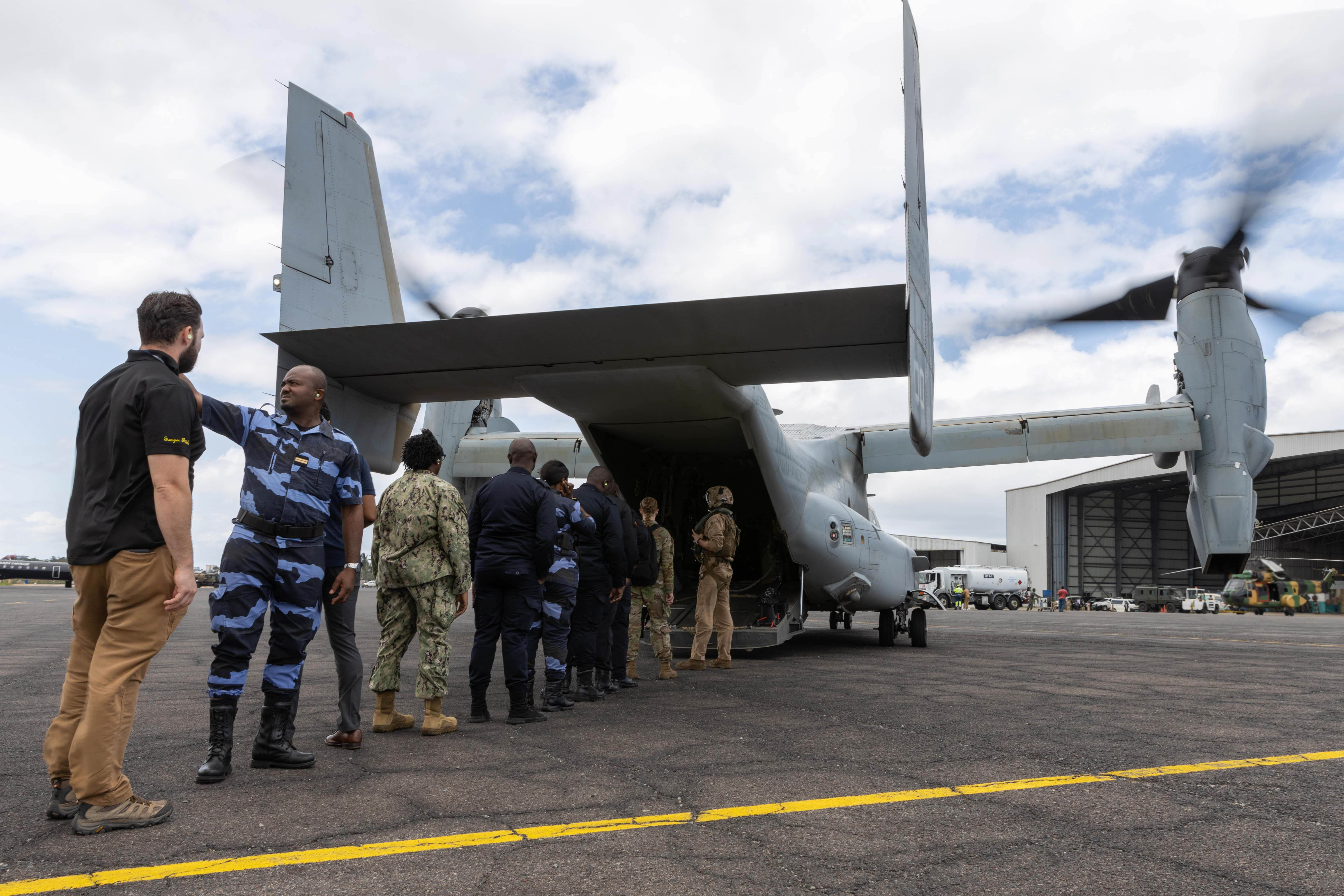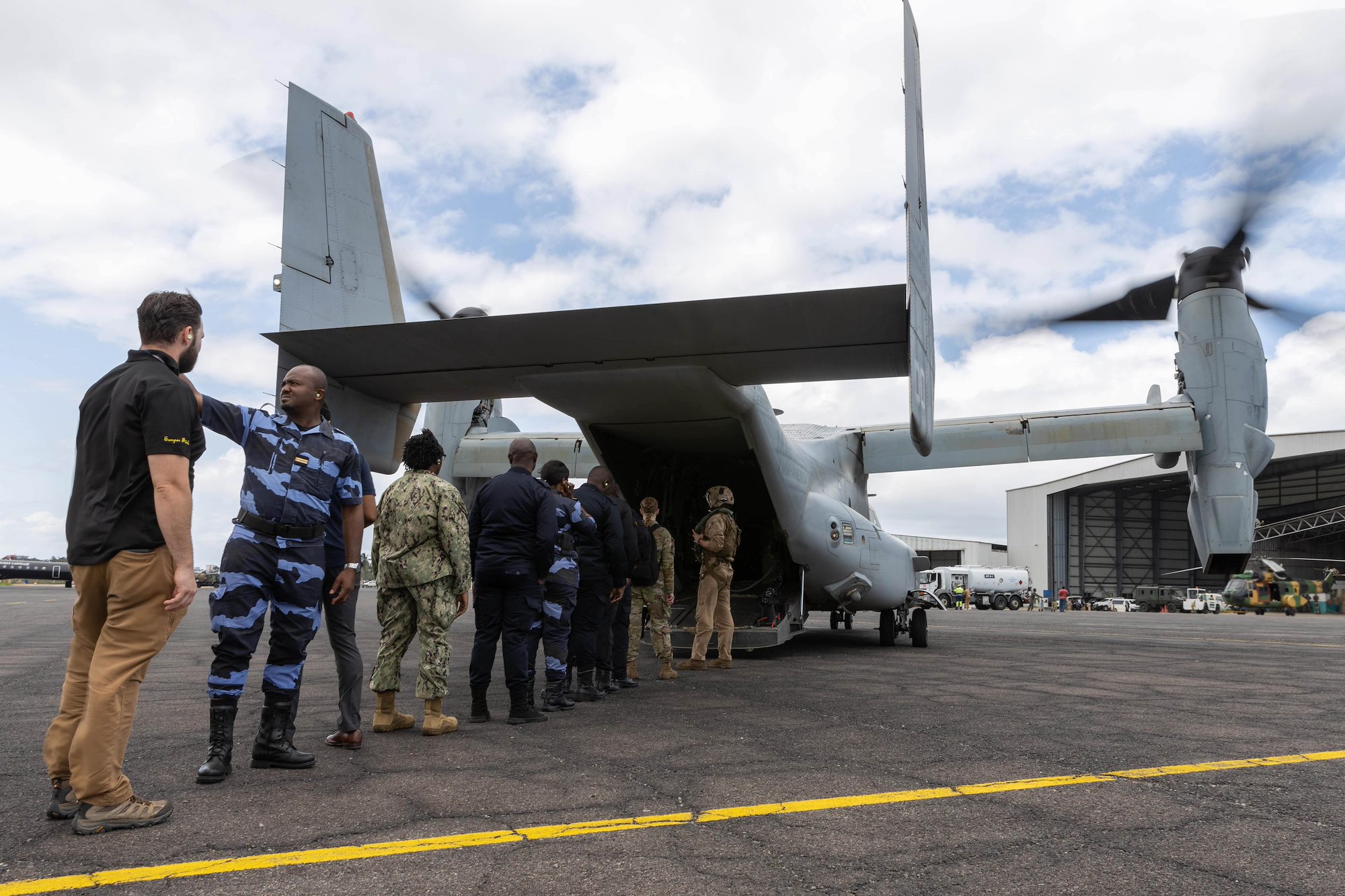 Members of the Gabonese forces and U.S. Armed Forces board a U.S. Marine Corps MV-22 Osprey aircraft during a Combined Joint Task Force - Horn of Africa (CJTF-HOA) readiness exercise in Libreville, Gabon, on Sept. 18, 2024. This exercise was a key component of CJTF-HOA’s mission to enhance crisis response capabilities and foster military cooperation with regional partners and U.S. embassies. More than 150 personnel participated, conducting joint training across 67,000 miles, including air refueling, logistical operations, and ground and medical exercises. These efforts showcased U.S. readiness to address security challenges while strengthening the strategic partnership between U.S. and Gabonese forces. (U.S. Army photo by Cpl. Mark Davis)