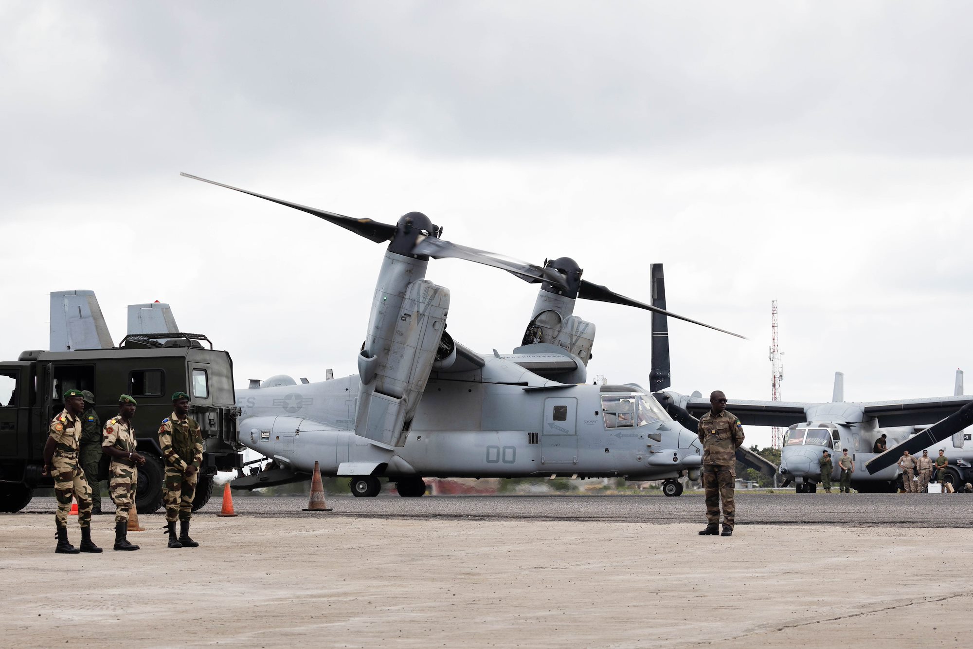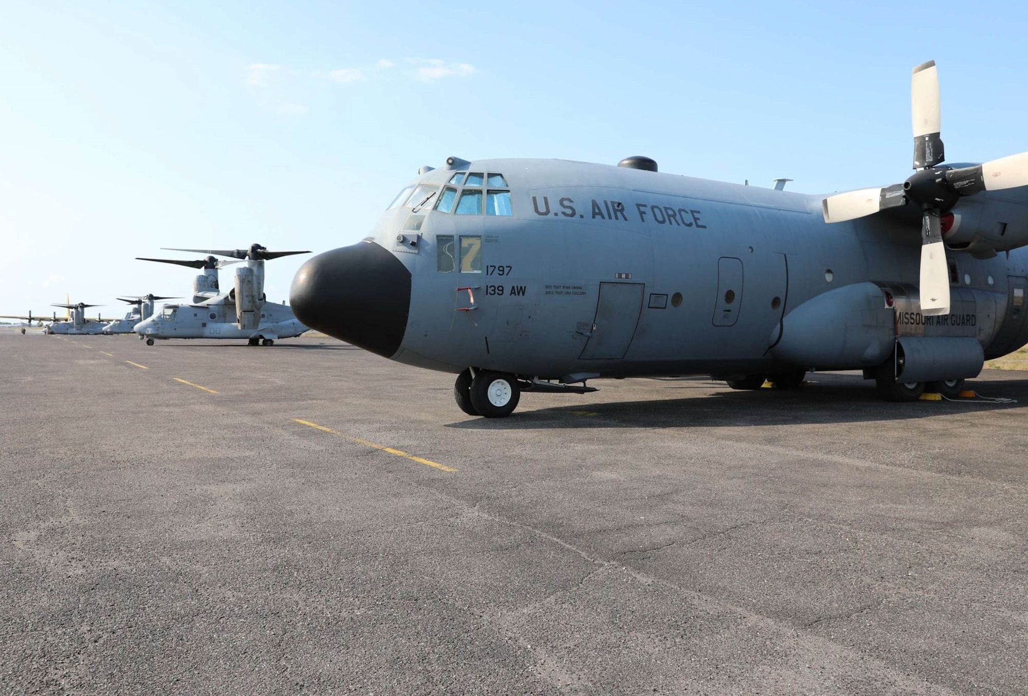 U.S. Air Force C-130 Hercules aircraft and U.S. Marine MV-22 Osprey aircraft, in support of Combined Joint Task Force - Horn of Africa (CJTF-HOA), along with soldiers from the East Africa Response Force, arrive in Libreville, Gabon, on Sept. 16, 2024, alongside Gabonese forces. This exercise was a key component of CJTF-HOA’s mission to enhance crisis response capabilities and foster military cooperation with regional partners and U.S. embassies. More than 150 personnel participated, conducting joint training across 67,000 miles, including air refueling, logistical operations, and ground and medical exercises. These efforts showcased U.S. readiness to address security challenges while strengthening the strategic partnership between U.S. and Gabonese forces. (U.S. Army photo by Cpl. Mark Davis)