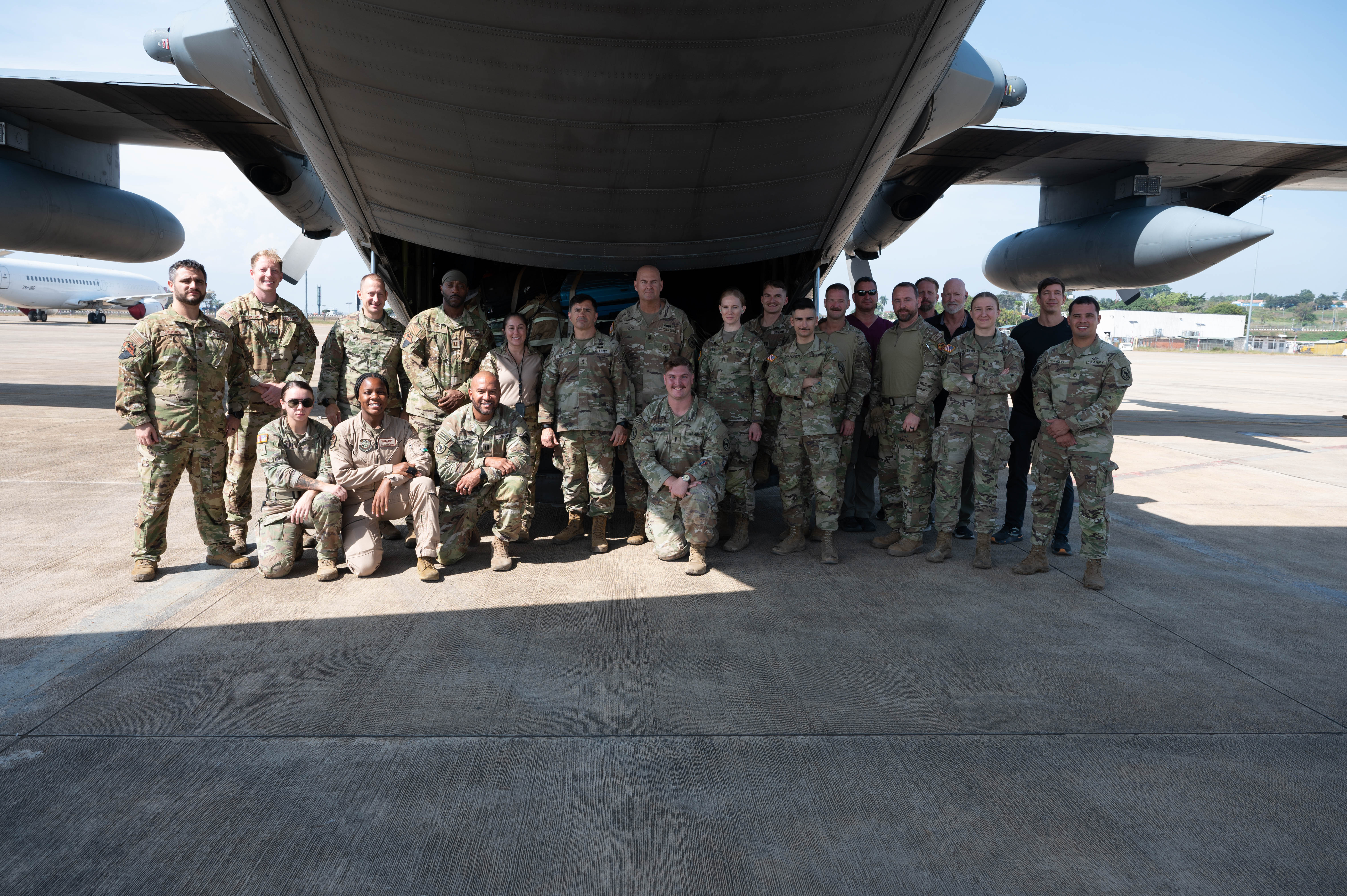 U.S. Army Maj. Gen. Brian Cashman (center), commander of Combined Joint Task Force – Horn of Africa (CJTF-HOA), and U.S. Coast Guard Master Chief Michael Koch (back row, center), Senior Enlisted Leader of CJTF-HOA, pose with a group of U.S. Armed Forces during an exercise in Libreville, Gabon, on Sept. 15, 2024. This exercise was a key component of CJTF-HOA’s mission to enhance crisis response capabilities and foster military cooperation with regional partners and U.S. Embassies. More than 150 personnel participated, conducting joint training across 67,000 miles, including air refueling, logistical operations, and ground and medical exercises. These efforts showcased U.S. readiness to address security challenges while strengthening the strategic partnership between U.S. and Gabonese forces. (U.S. Army photo by Cpl. Mark Davis)