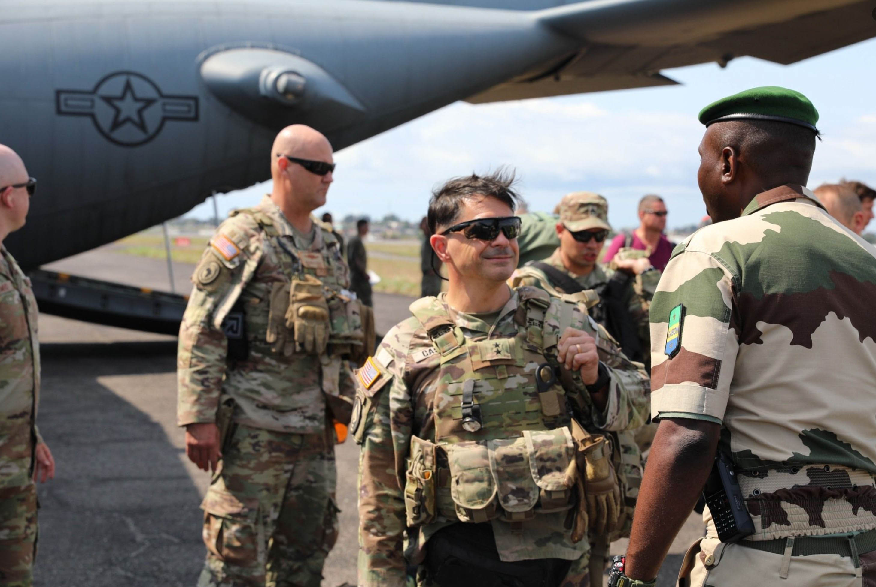 U.S. Army Maj. Gen. Brian Cashman, commander of Combined Joint Task Force – Horn of Africa (CJTF-HOA), meets with a member of the Gabonese forces during an exercise in Libreville, Gabon, on Sept. 16, 2024. This exercise was a key component of CJTF-HOA’s mission to enhance crisis response capabilities and foster military cooperation with regional partners and U.S. Embassies. More than 150 personnel participated, conducting joint training across 67,000 miles, including air refueling, logistical operations, and ground and medical exercises. These efforts showcased U.S. readiness to address security challenges while strengthening the strategic partnership between U.S. and Gabonese forces. (Courtesy photo)