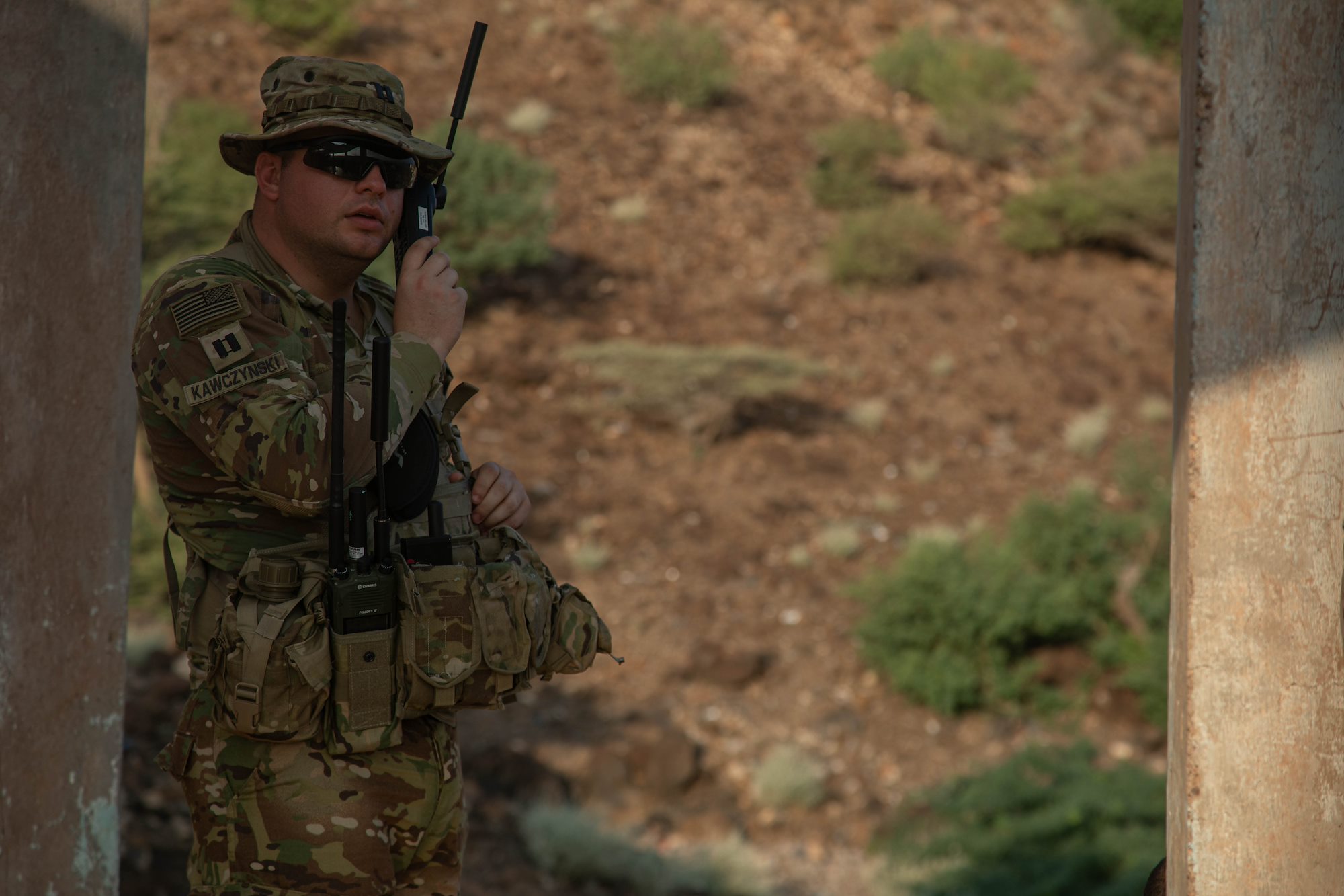 U.S. Army Capt. Kawczynski, exercise planner for CJ-7, Combined Joint Task Force – Horn of Africa, listens to the radio from operating forces at Arta, Djibouti, on Nov. 26, 2024. The semiannual exercise brought together forces from the United States, Djibouti, Spain, Japan, and France to enhance communication and interoperability among international partners. It included complex personnel recovery scenarios across land, sea, and air domains, testing coordination and operational readiness while strengthening regional security and stability. (U.S. Army photo by Pfc. James Webster)