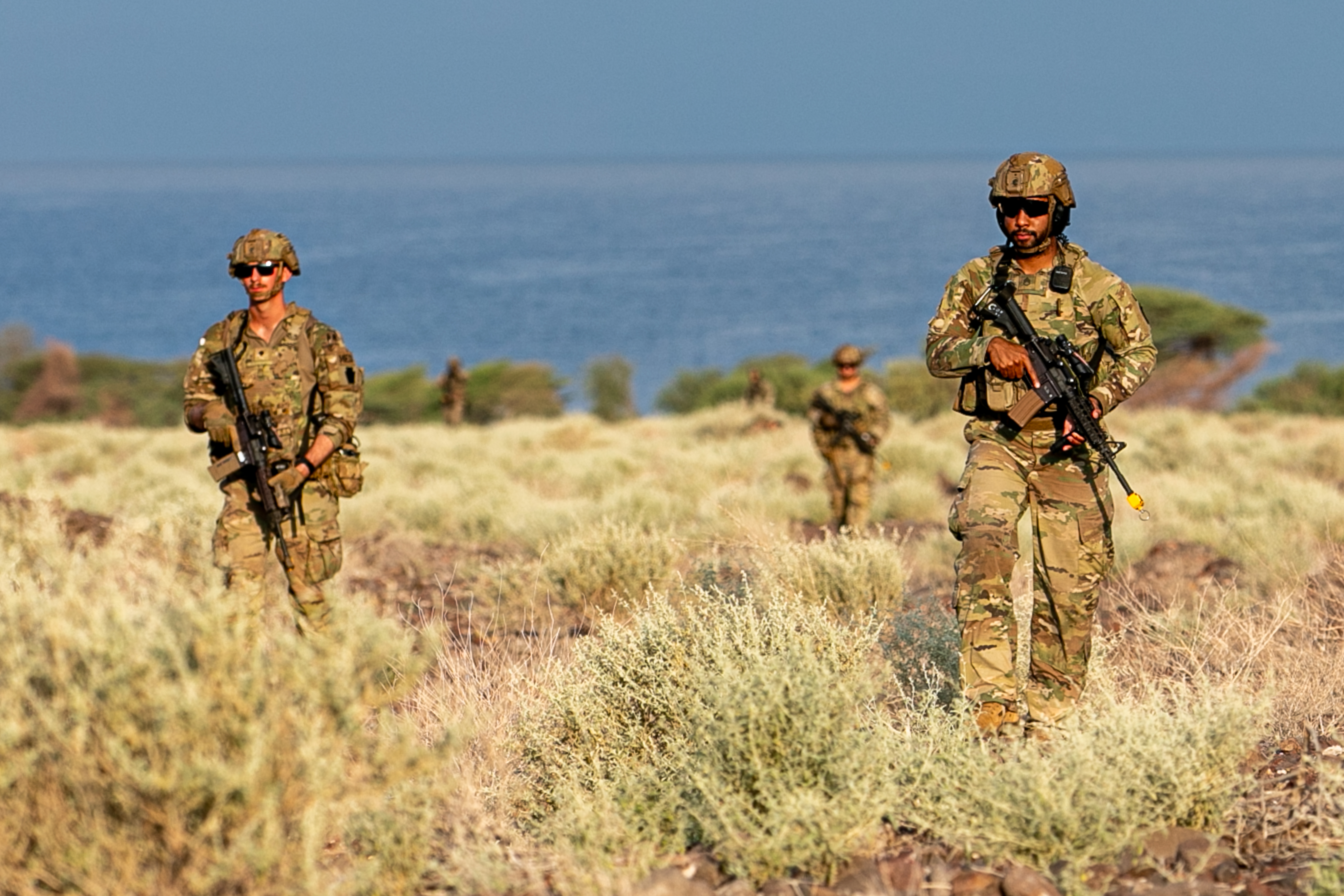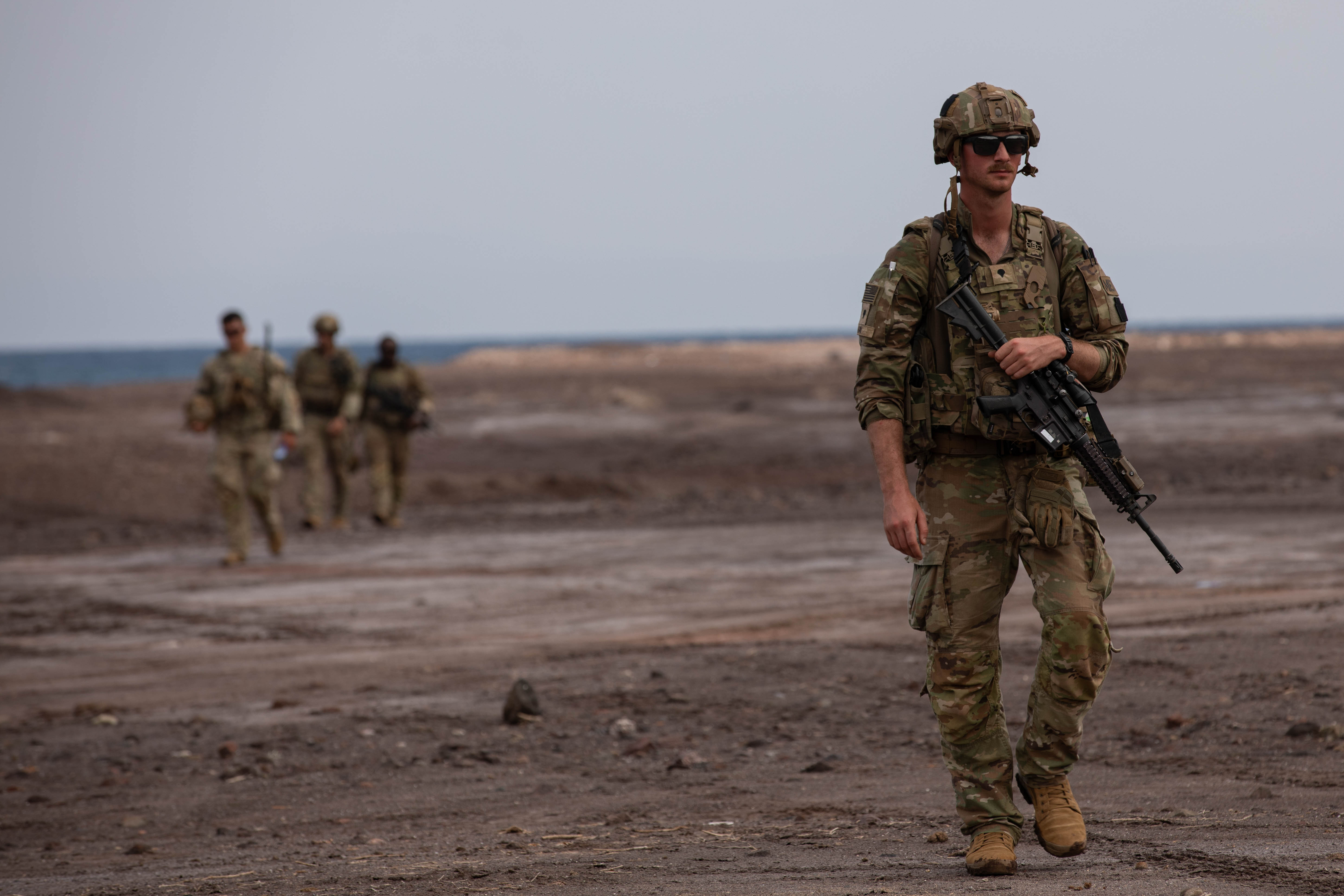 A U.S. Army Soldier with the East Africa Response Force, Task Force Associator, Combined Joint Task Force – Horn of Africa, walks on Arta beach with fellow soldiers, at Arta, Djibouti, on Nov. 26, 2024. The semiannual exercise brought together U.S., Djiboutian, Spanish, Japanese, and French forces to enhance communication and interoperability among international partners. It simulated complex personnel recovery scenarios across land, sea, and air domains, testing coordination and operational readiness while strengthening regional security and stability. (U.S. Army photo by Pfc. James Webster)