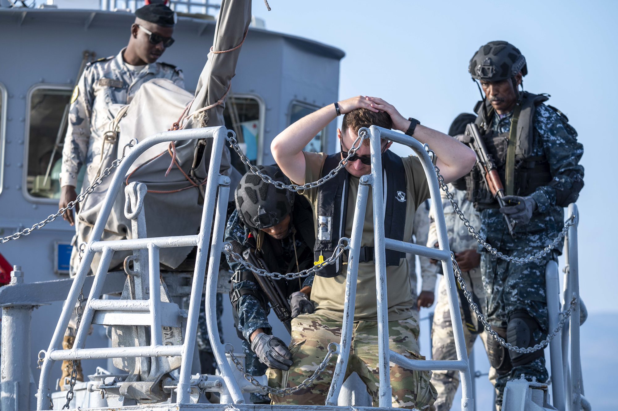 Members of the Djiboutian militaries secure the simulated pirate ship during the Combined Joint Task Force – Horn of Africa’s Bull Shark 25-1 exercise at Arta, Djibouti, on Nov. 26, 2024. The semiannual exercise brought together U.S., Djiboutian, Spanish, Japanese, and French forces to enhance communication and interoperability among international partners. It simulated complex personnel recovery scenarios across land, sea, and air domains, testing coordination and operational readiness while strengthening regional security and stability. (U.S. Air National Guard Photo by Tech. Sgt. George Keck)