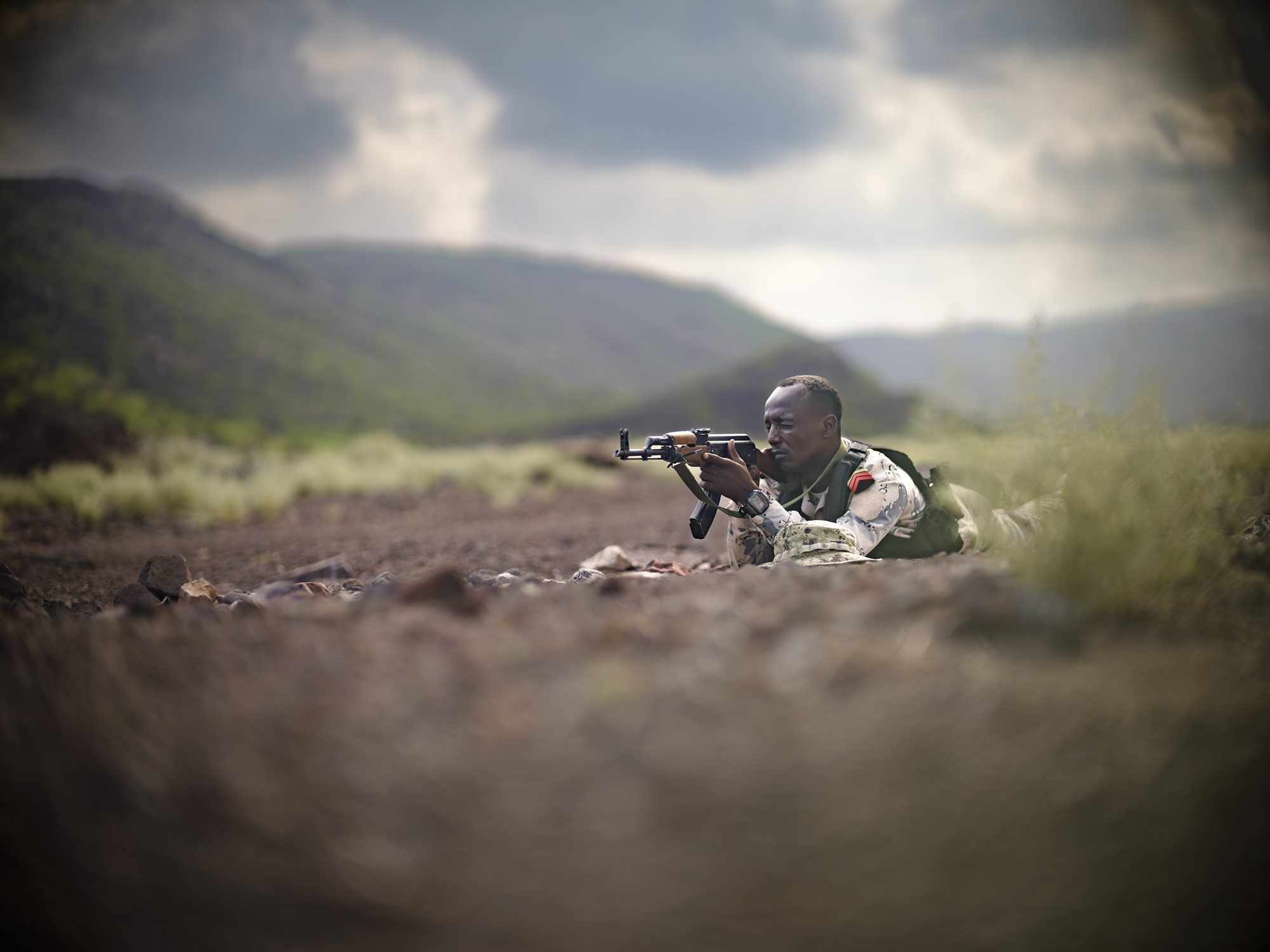 A member of the Djibouti Armed Forces participates in the Combined Joint Task Force – Horn of Africa’s Bull Shark 25-1 exercise at Arta, Djibouti, on Nov. 26, 2024. The semiannual exercise brought together U.S., Djiboutian, Spanish, Japanese, and French forces to enhance communication and interoperability among international partners. It simulated complex personnel recovery scenarios across land, sea, and air domains, testing coordination and operational readiness while strengthening regional security and stability. (U.S. Army photo by Pfc. James Webster)