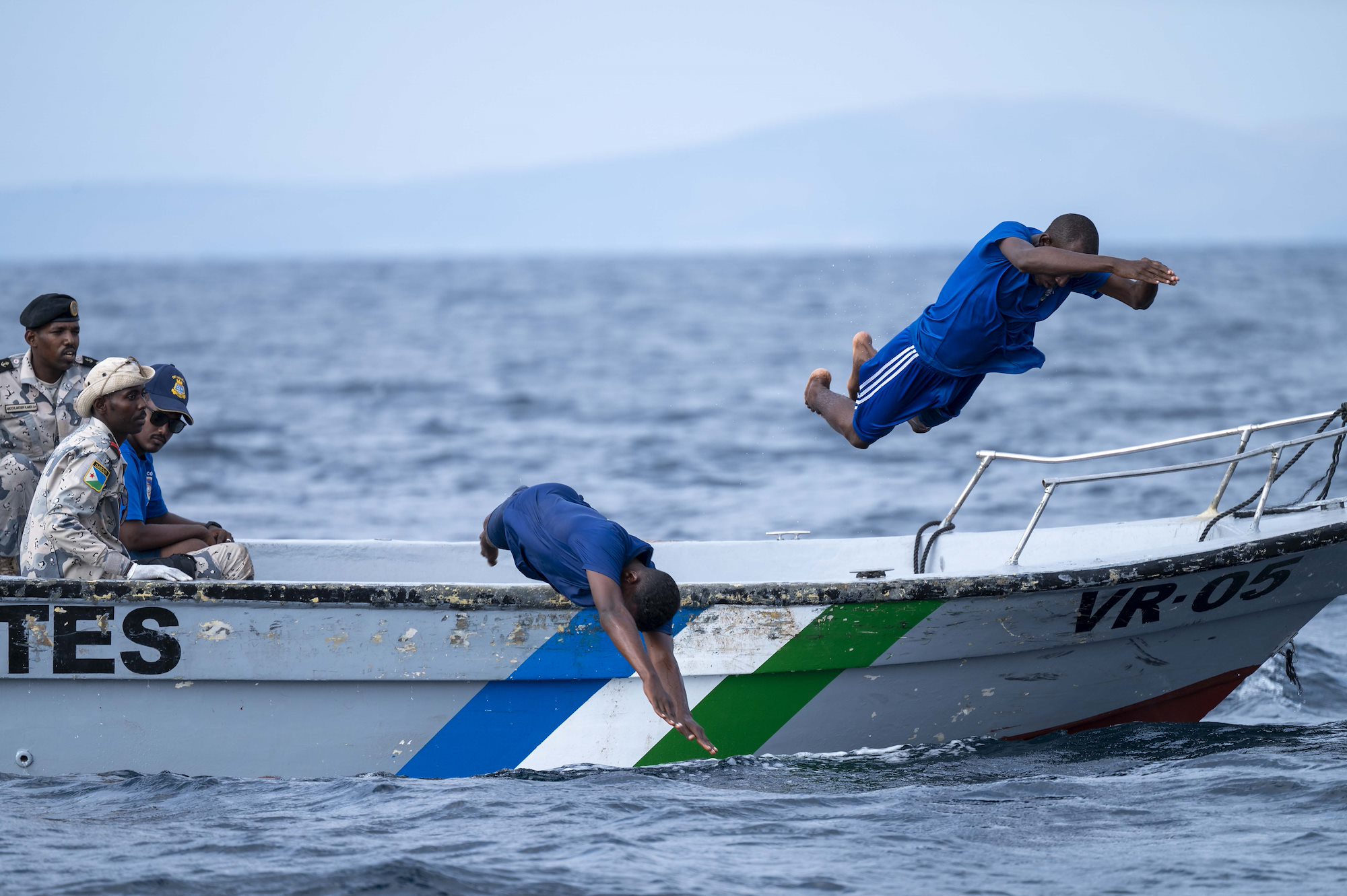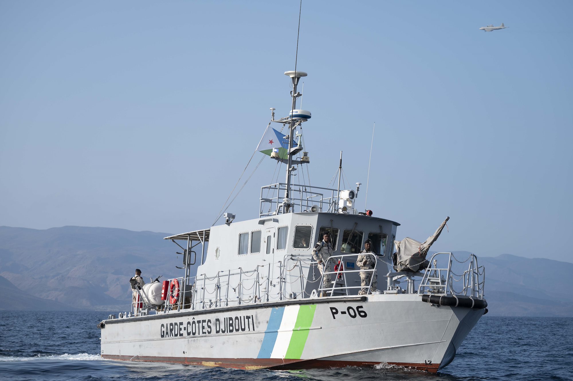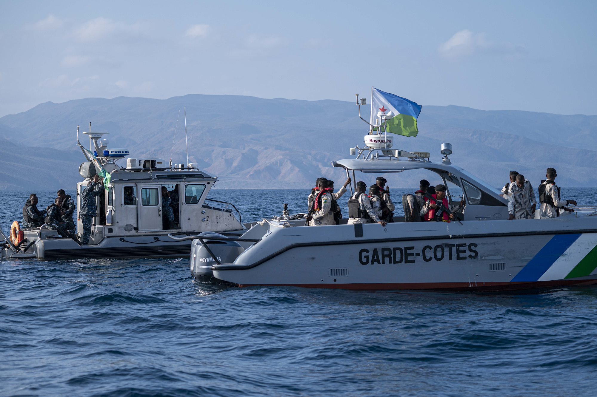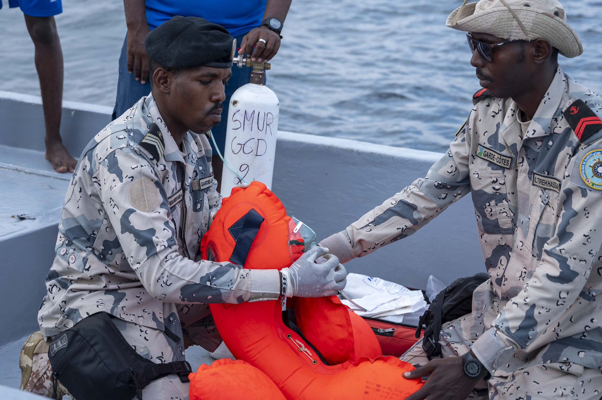 Service members from the Djiboutian Coast Guard practice search and rescue during Exercise Bull Shark on Nov. 26, 2024, in the Gulf of Tadjoura, Djibouti. The semiannual exercise brought together U.S., Djiboutian, Spanish, Japanese, and French forces to enhance communication and interoperability among international partners. It simulated complex personnel recovery scenarios across land, sea, and air domains, testing coordination and operational readiness while strengthening regional security and stability. (U.S. Army National Guard photo by Sgt. Lark Sine)