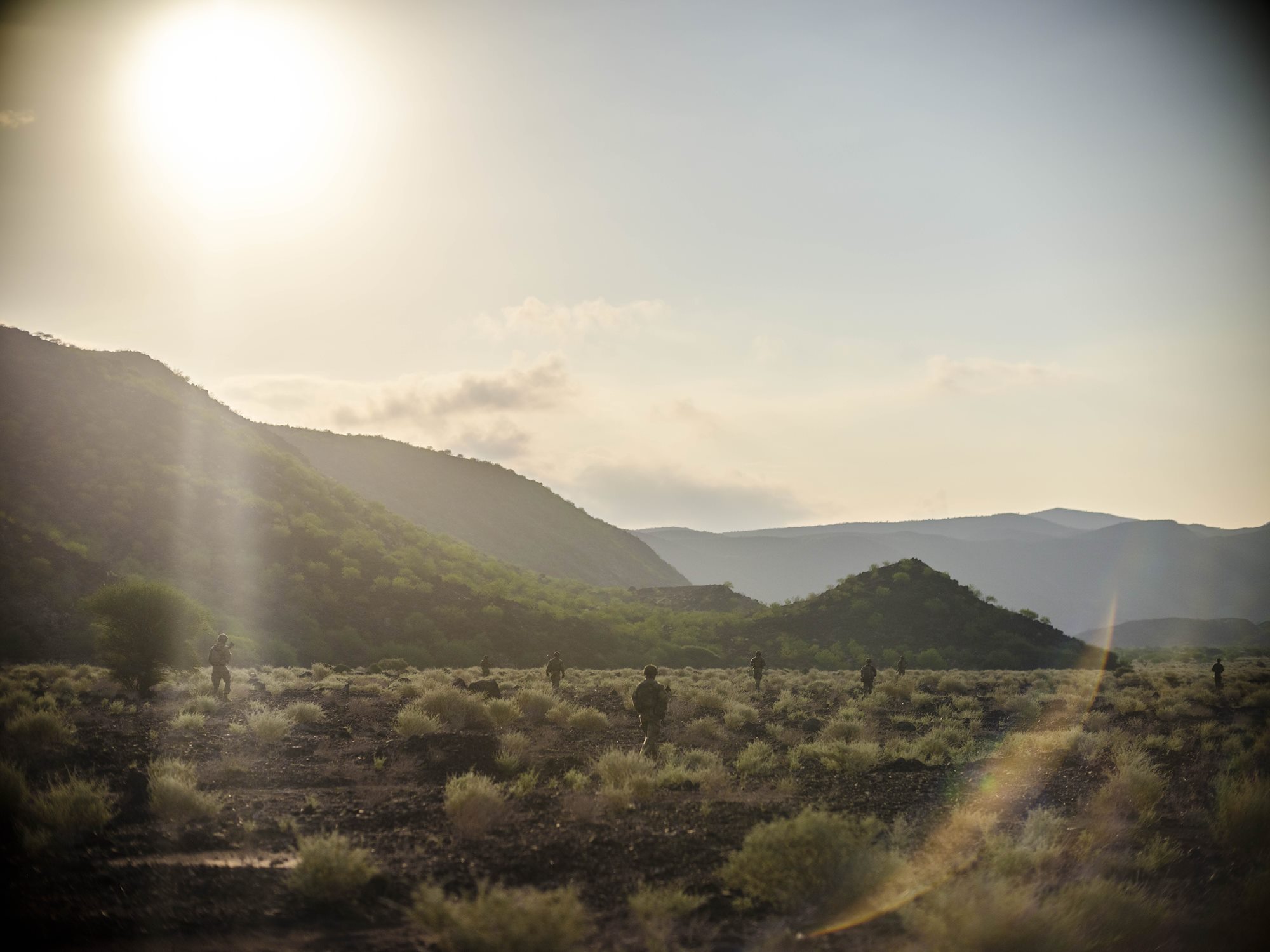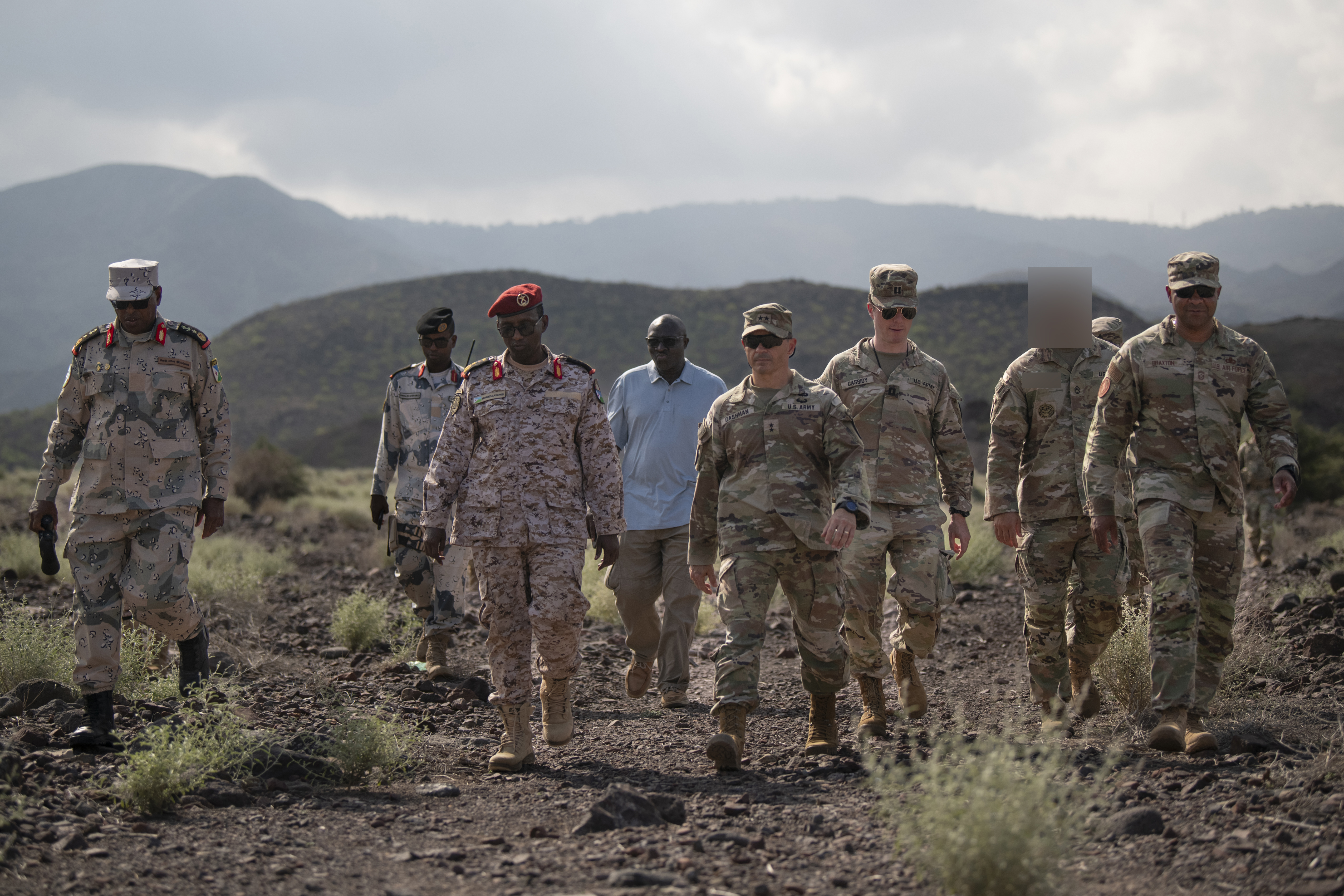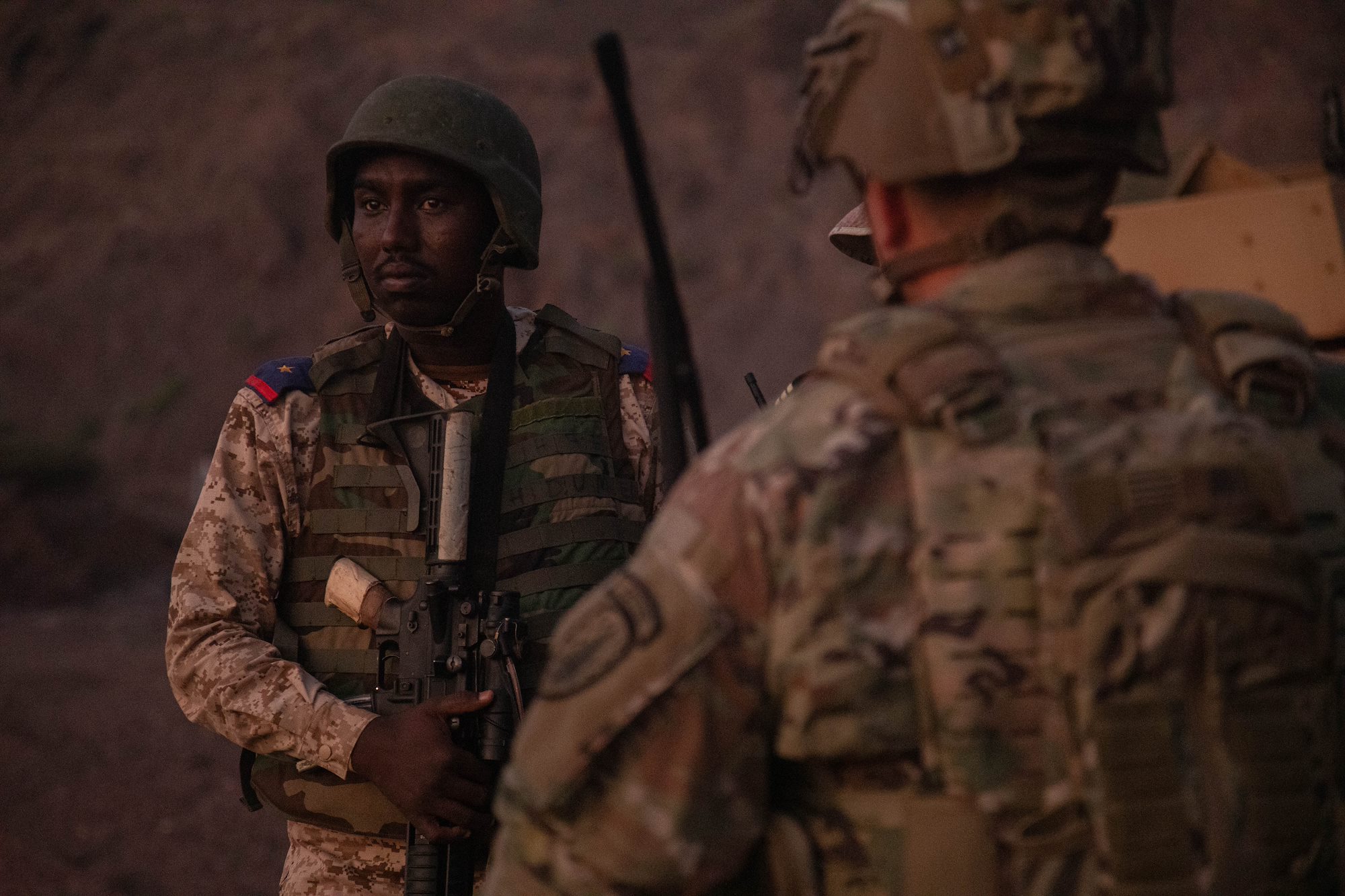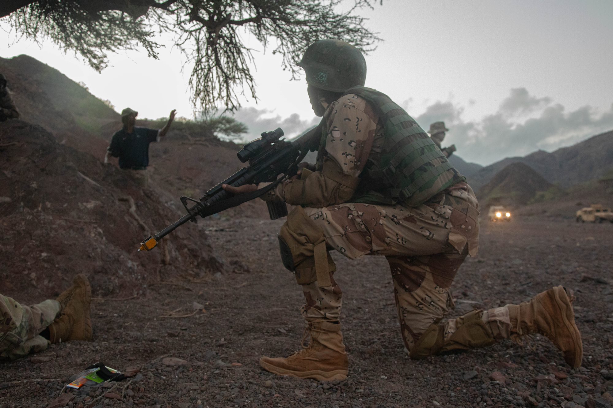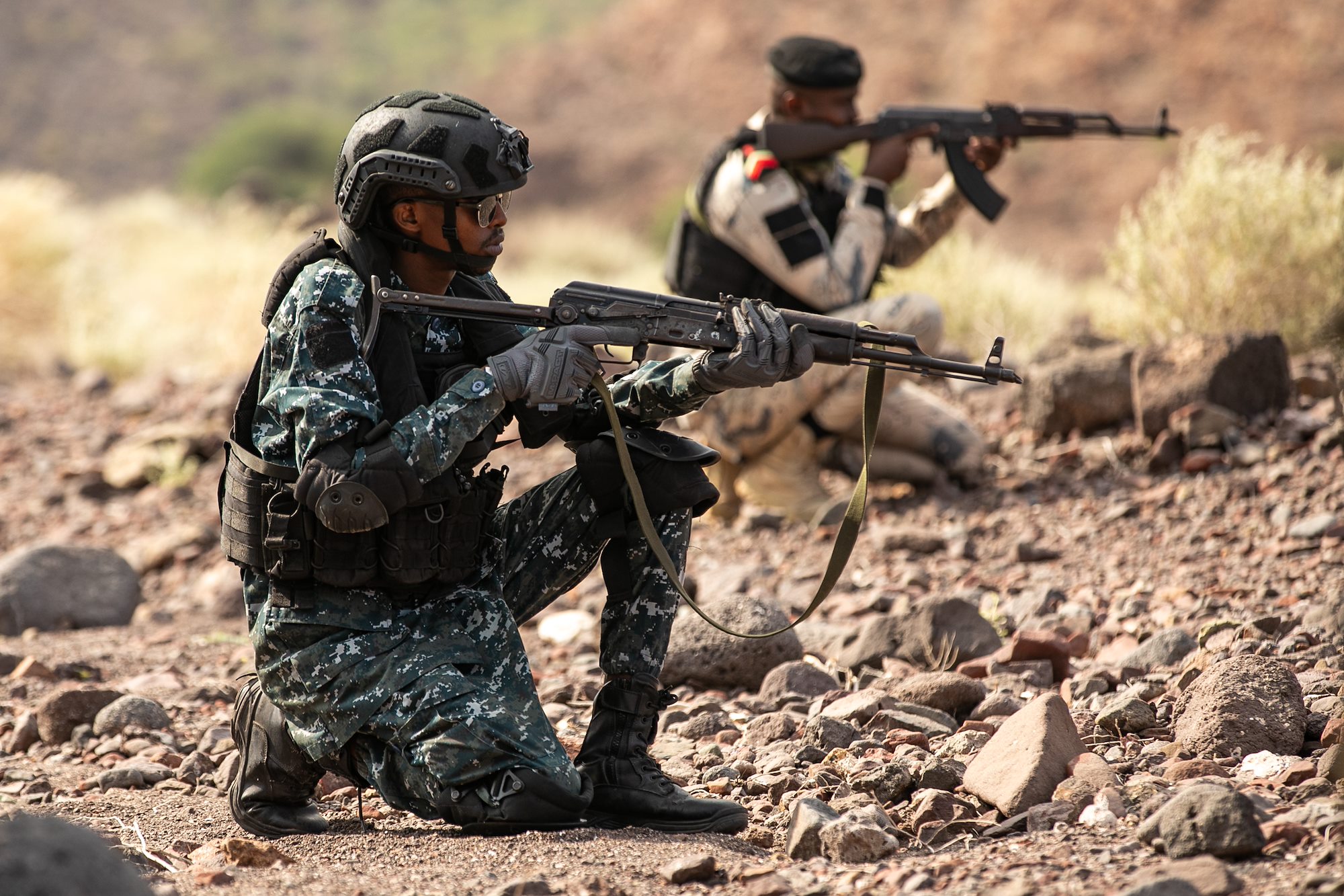 Members of the Djibouti Armed Forces conduct security during the Combined Joint Task Force – Horn of Africa’s Bull Shark 25-1 exercise at Arta, Djibouti, on Nov. 26, 2024. The semiannual exercise brought together U.S., Djiboutian, Spanish, Japanese, and French forces to enhance communication and interoperability among international partners. It simulated complex personnel recovery scenarios across land, sea, and air domains, testing coordination and operational readiness while strengthening regional security and stability. (U.S. Army photo by Sgt. Michael Knight)