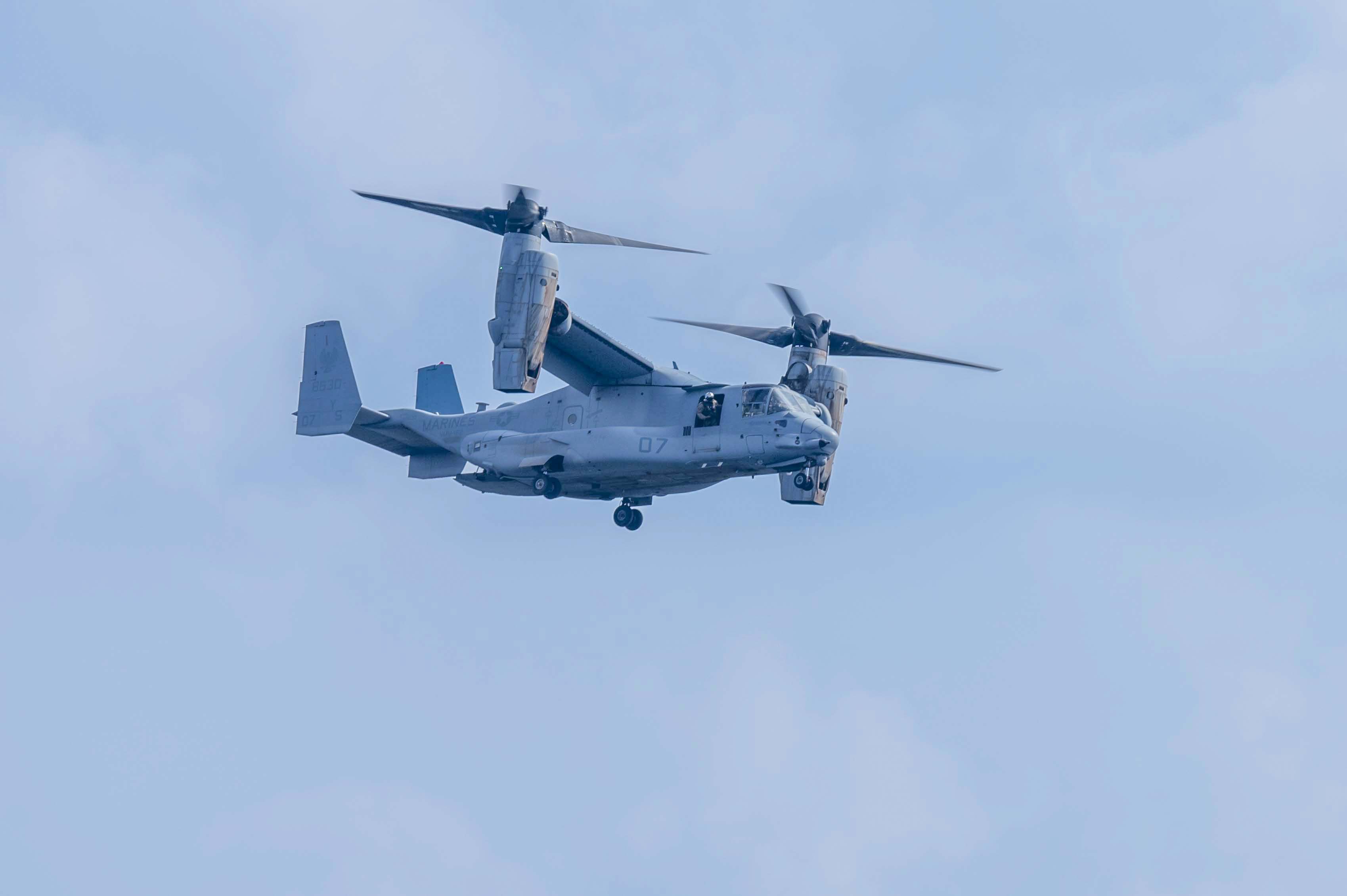 An MV-22 Osprey tiltrotor aircraft flies above the Gulf of Tadjoura during Exercise Bull Shark on Nov. 26, 2024, in Djibouti. The semiannual exercise brought together U.S., Djiboutian, Spanish, Japanese, and French forces to enhance communication and interoperability among international partners. It simulated complex personnel recovery scenarios across land, sea, and air domains, testing coordination and operational readiness while strengthening regional security and stability. (U.S. Army National Guard photo by Sgt. Lark Sine)