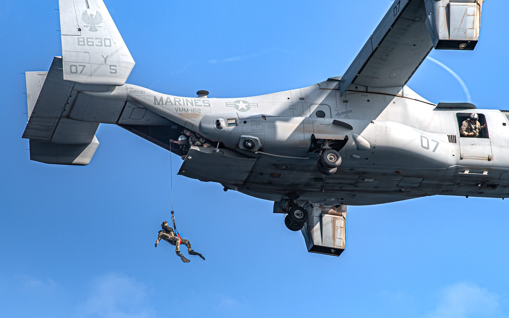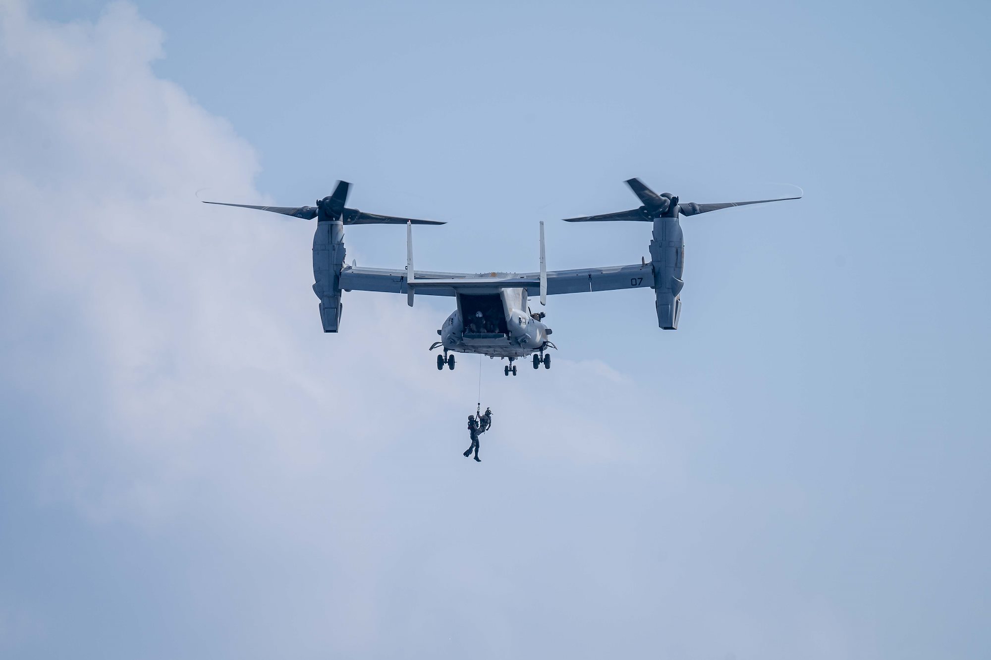 A U.S. Air Force pararescueman assigned to the 82nd Expeditionary Rescue Squadron (ERQS) repels down from a MV-22 Osprey to recover personnel in the water during exercise Bull Shark in Djibouti on November 26, 2024. The exercise simulated multiple personnel recovery scenarios in water allowing for the coordination of land, sea, and air components from multiple U.S. military branches, the Spanish Navy, and the Djiboutian Coast Guard. (U.S. Air Force photo by Staff Sgt. Jana Somero)