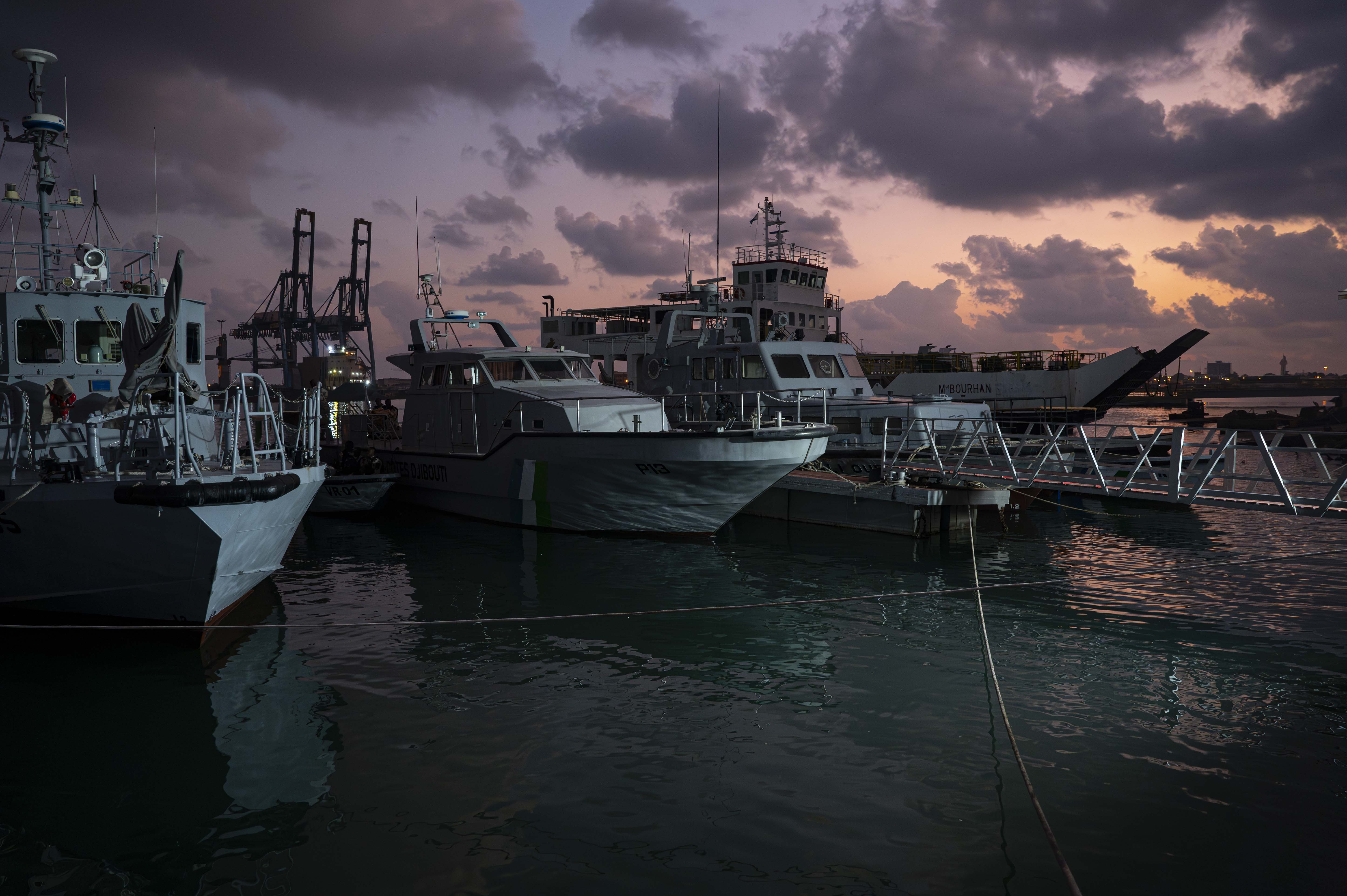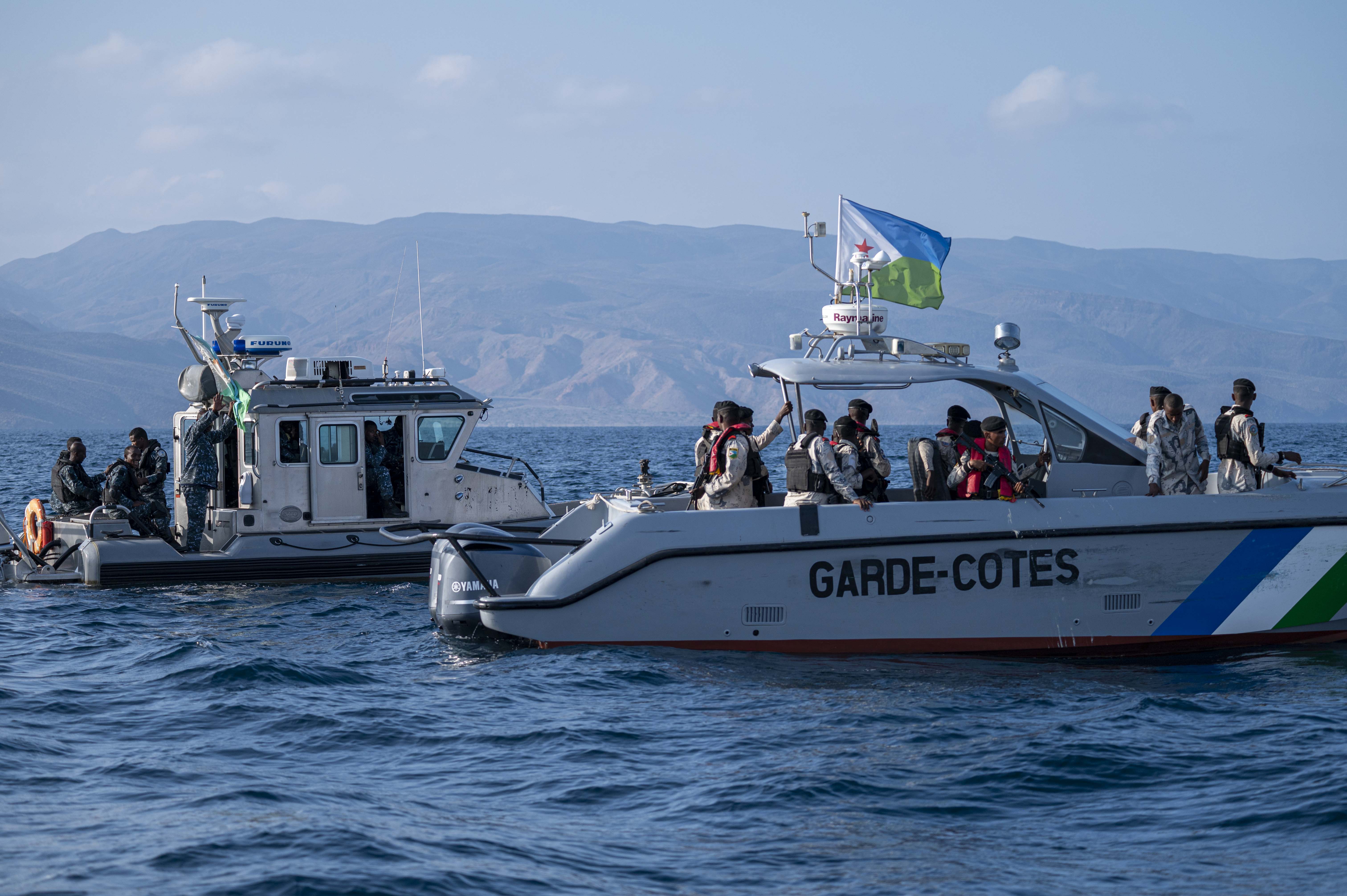 U.S. Navy and Djiboutian Coast Guard vessels work together during exercise Bull Shark in Djibouti on November 26, 2024. The exercise simulated multiple personnel recovery scenarios in water allowing for the coordination of land, sea, and air components from multiple U.S. military branches, the Spanish Navy, and the Djiboutian Coast Guard. (U.S. Air Force photo by Staff Sgt. Jana Somero)