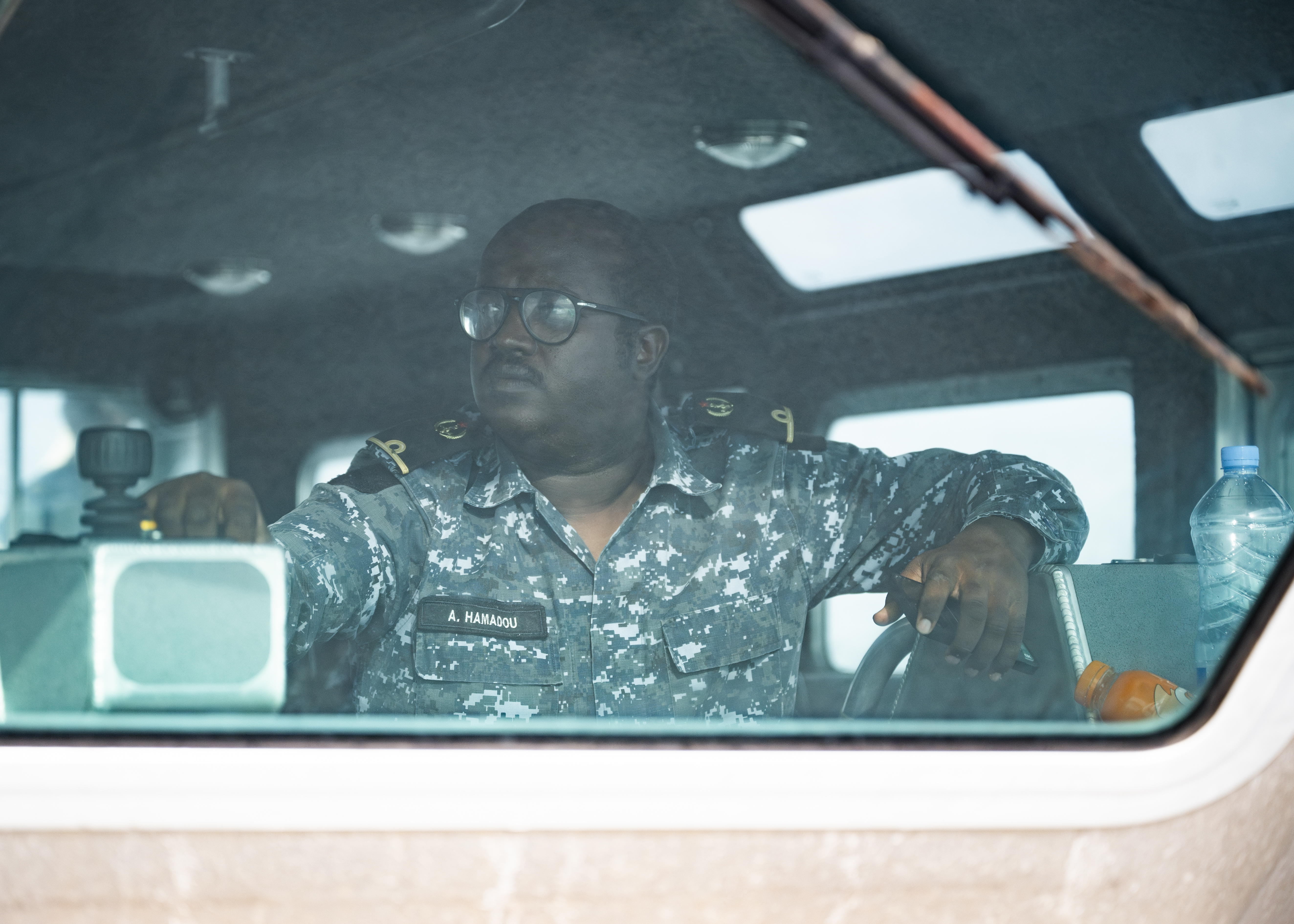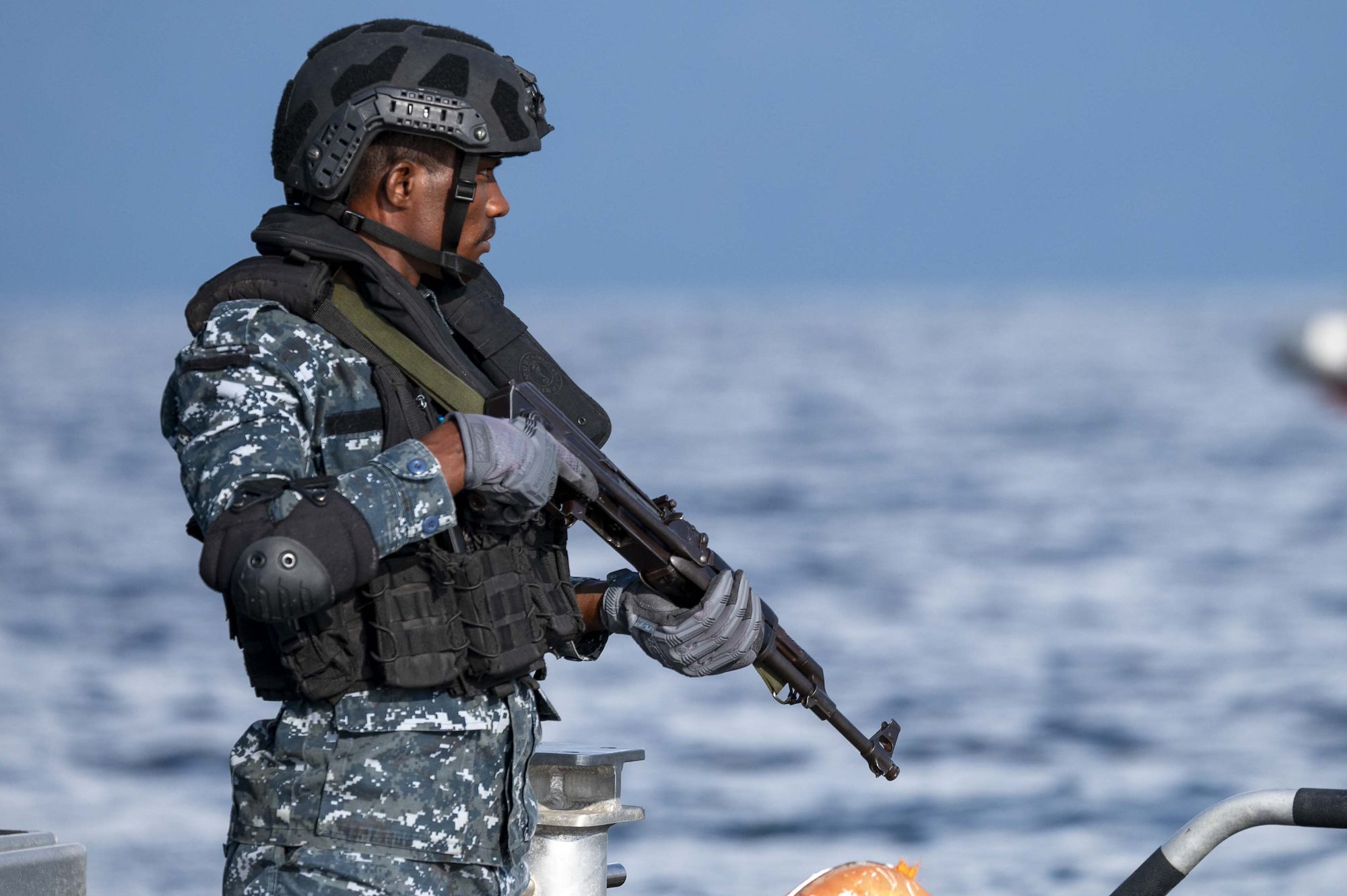 A Djiboutian Navy service member practices security operations during Exercise Bull Shark on Nov. 26, 2024, in the Gulf of Tadjoura, Djibouti. The semiannual exercise brought together U.S., Djiboutian, Spanish, Japanese, and French forces to enhance communication and interoperability among international partners. It simulated complex personnel recovery scenarios across land, sea, and air domains, testing coordination and operational readiness while strengthening regional security and stability. (U.S. Army National Guard photo by Sgt. Lark Sine)