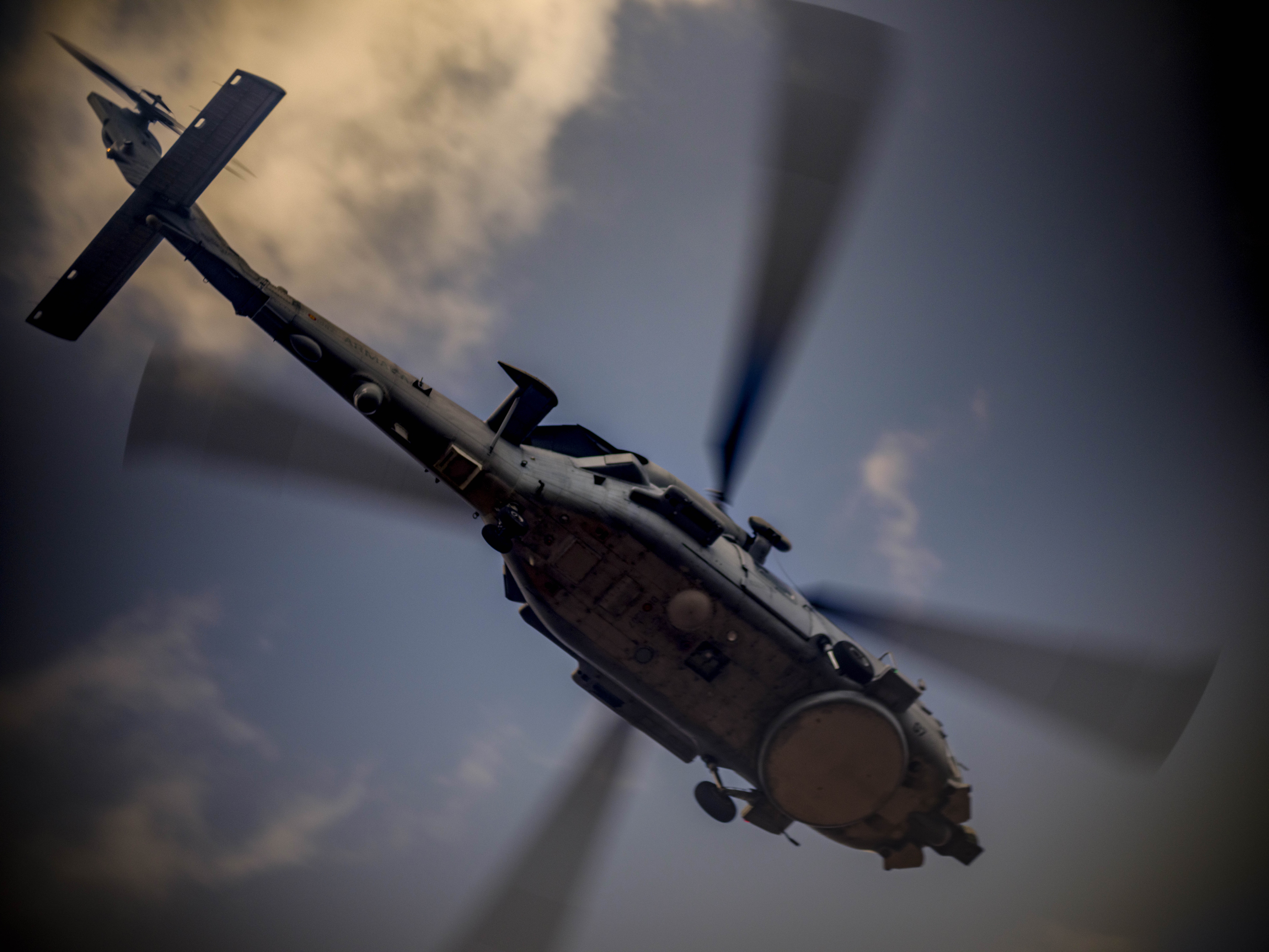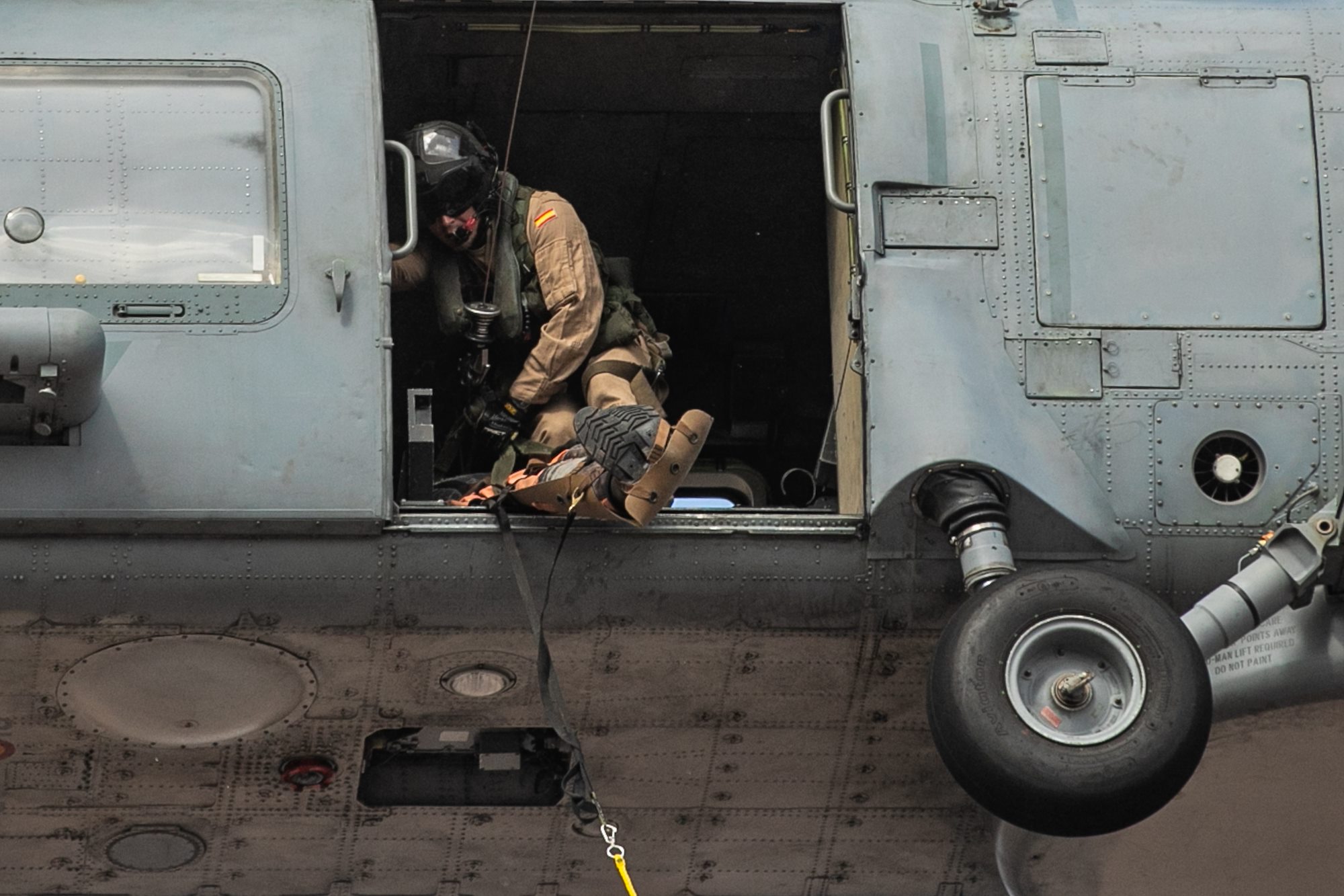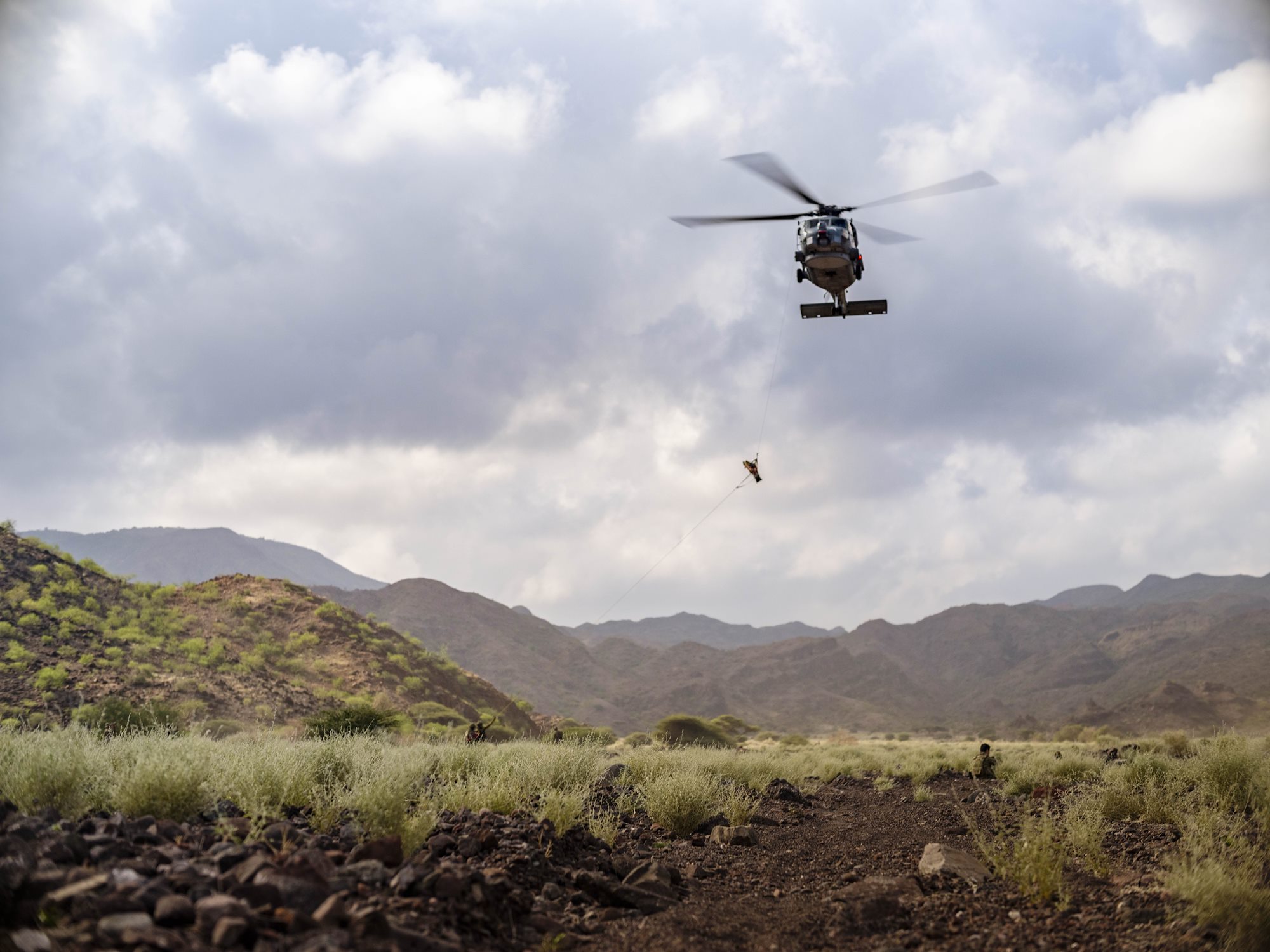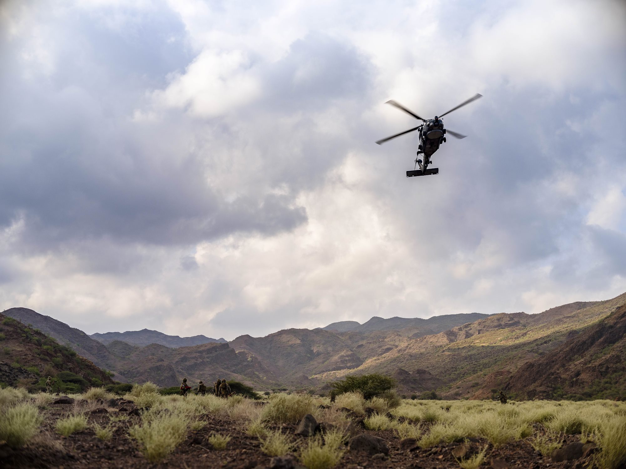 An MH-60R Seahawk with the Spanish forces conducts a casualty extraction during the Bull Shark 25-1 exercise at Arta, Djibouti, on Nov. 26, 2024. The semiannual exercise brought together U.S., Djiboutian, Spanish, Japanese, and French forces to enhance communication and interoperability among international partners. It simulated complex personnel recovery scenarios across land, sea, and air domains, testing coordination and operational readiness while strengthening regional security and stability. (U.S. Air Force photo by Master Sgt. Jon Alderman)