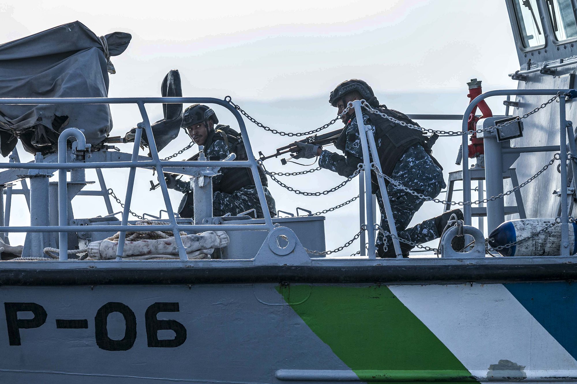 Djiboutian Navy service members practice security operations during Exercise Bull Shark on Nov. 26, 2024, in the Gulf of Tadjoura, Djibouti. The semiannual exercise brought together U.S., Djiboutian, Spanish, Japanese, and French forces to enhance communication and interoperability among international partners. It simulated complex personnel recovery scenarios across land, sea, and air domains, testing coordination and operational readiness while strengthening regional security and stability. (U.S. Army National Guard photo by Sgt. Lark Sine)