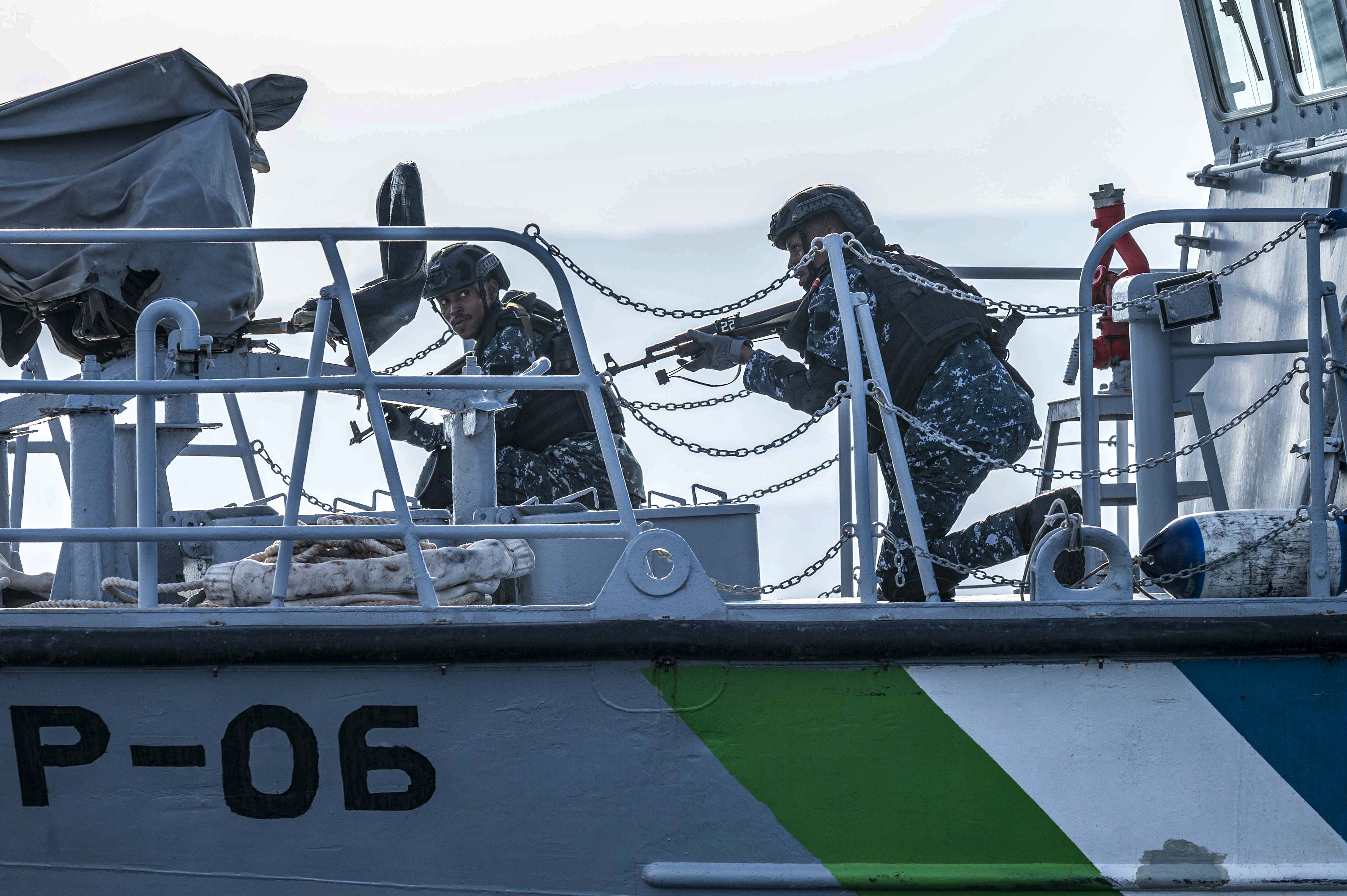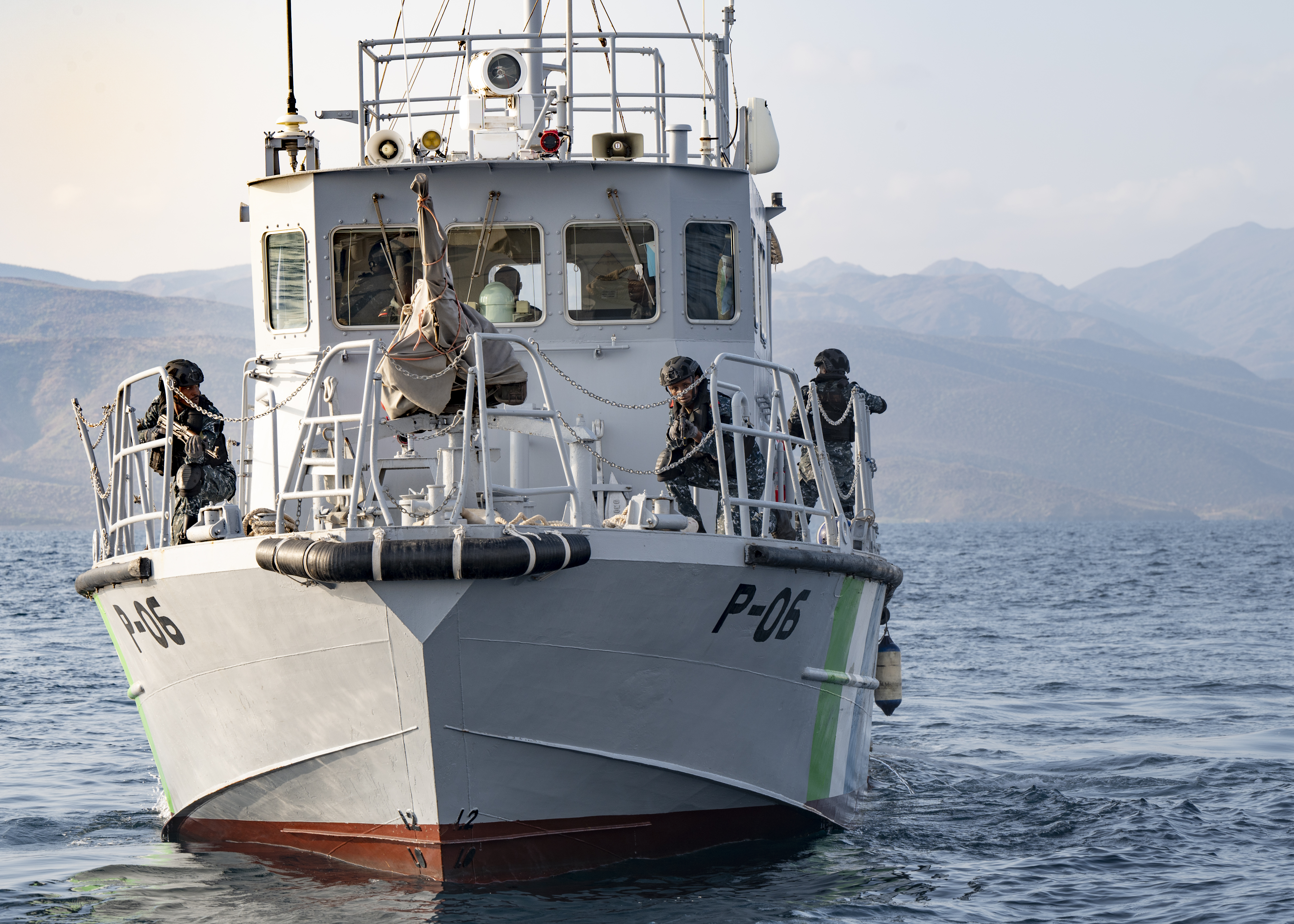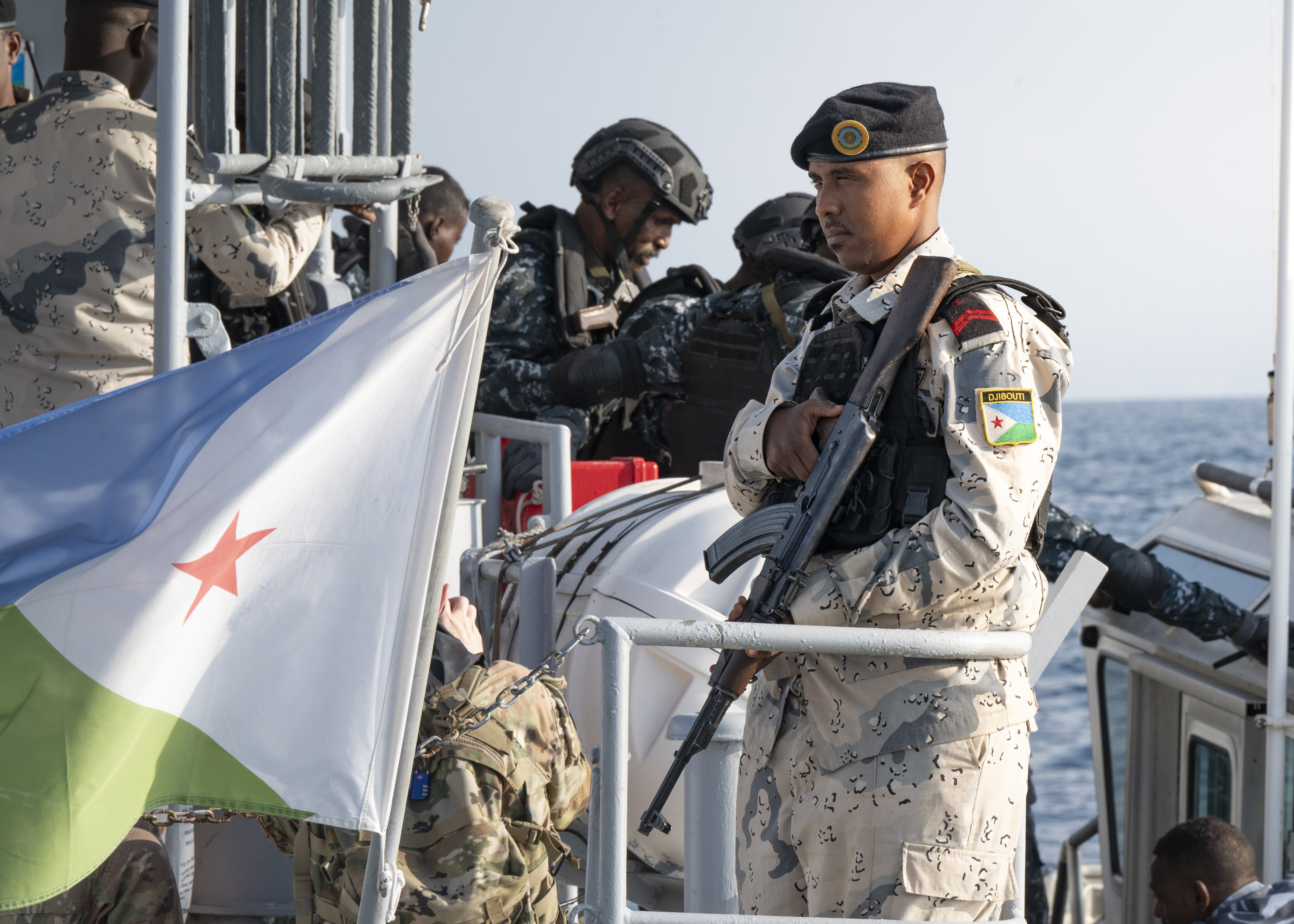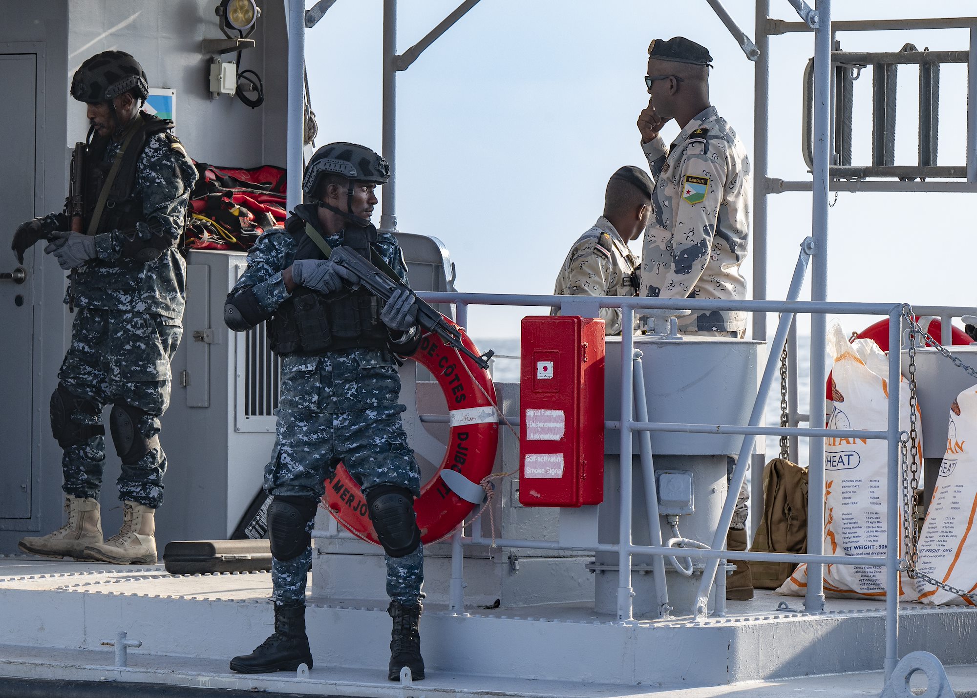 Members of the Djiboutian Navy secure the simulated pirate ship during the Combined Joint Task Force – Horn of Africa’s Bull Shark 25-1 exercise at Arta, Djibouti, on Nov. 26, 2024. The semiannual exercise brought together U.S., Djiboutian, Spanish, Japanese, and French forces to enhance communication and interoperability among international partners. It simulated complex personnel recovery scenarios across land, sea, and air domains, testing coordination and operational readiness while strengthening regional security and stability. (U.S. Air National Guard Photo by Tech. Sgt. George Keck)