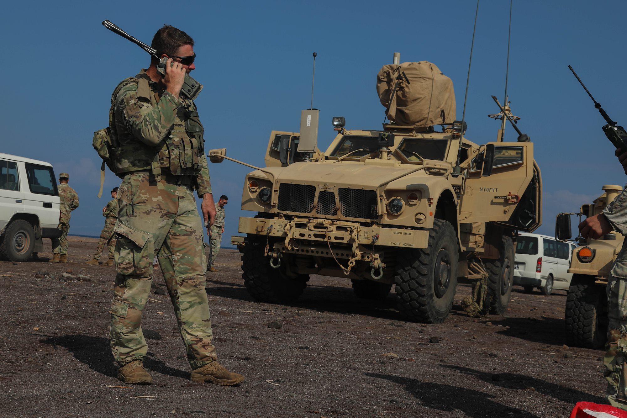 U.S. Army Staff Sgt. Drew Bachtle, assigned with the East Africa Response Force, Task Force Associator, Combined Joint Task Force – Horn of Africa, listens to radio from operating forces at Arta, Djibouti, on Nov. 25, 2024. The semiannual exercise brought together U.S., Djiboutian, Spanish, Japanese, and French forces to enhance communication and interoperability among international partners. It simulated complex personnel recovery scenarios across land, sea, and air domains, testing coordination and operational readiness while strengthening regional security and stability. (U.S. Army photo by Pfc. James Webster)