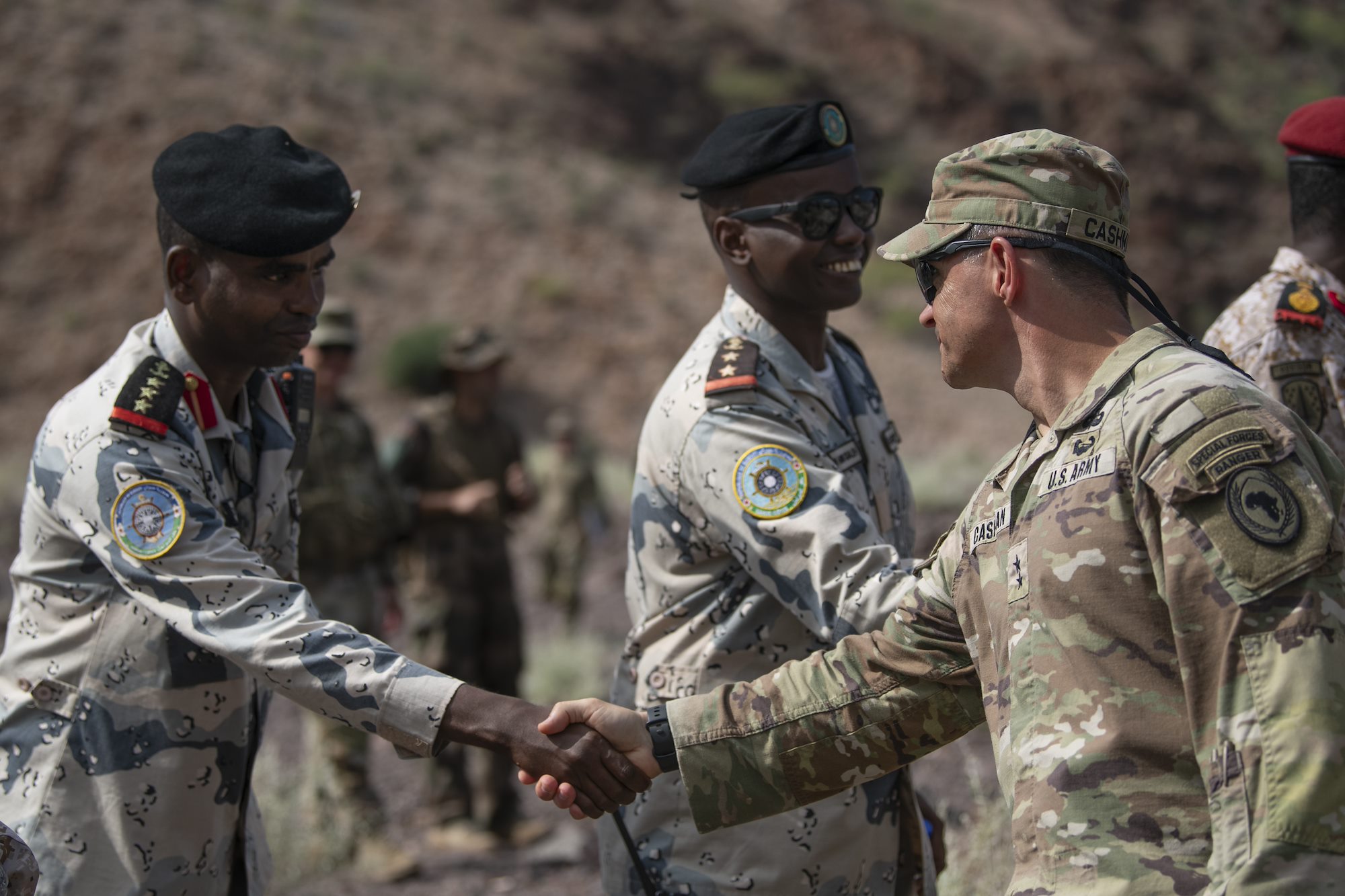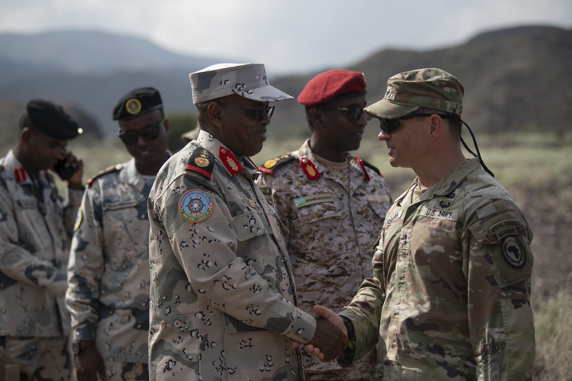 Lt. Col. Mohamed Adawa Mohamed, deputy commander of the Djiboutian Coast Guard, and U.S. Army Maj. Gen. Brian Cashman, commander of Combined Joint Task Force-Horn of Africa, greet one another during the Bull Shark 25-1 exercise at Arta, Djibouti, on Nov. 26, 2024. The semiannual exercise brought together U.S., Djiboutian, Spanish, Japanese, and French forces to enhance communication and interoperability among international partners. It simulated complex personnel recovery scenarios across land, sea, and air domains, testing coordination and operational readiness while strengthening regional security and stability. (U.S. Air National Guard photo by Tech. Sgt. Kathleen LaCorte)