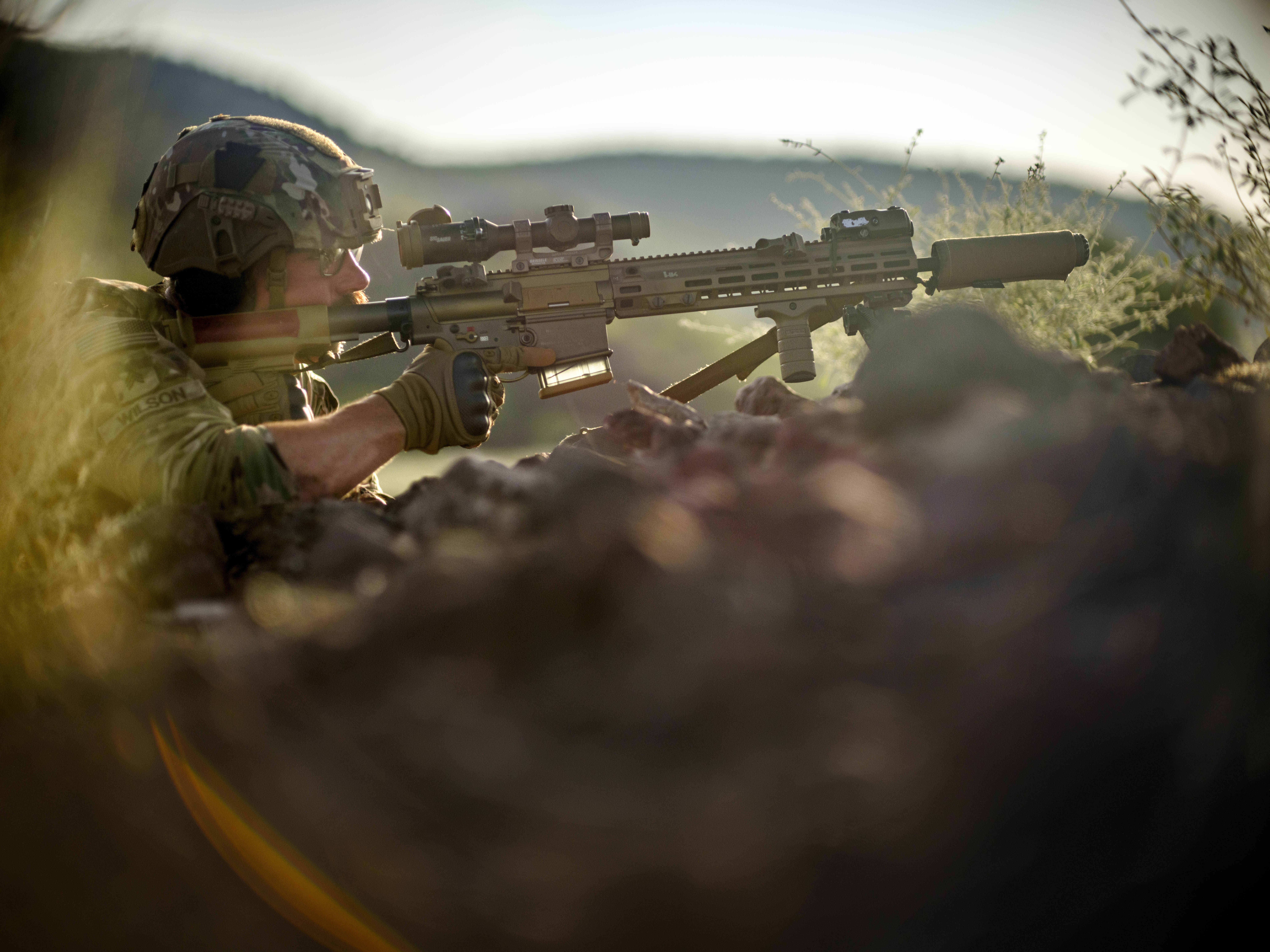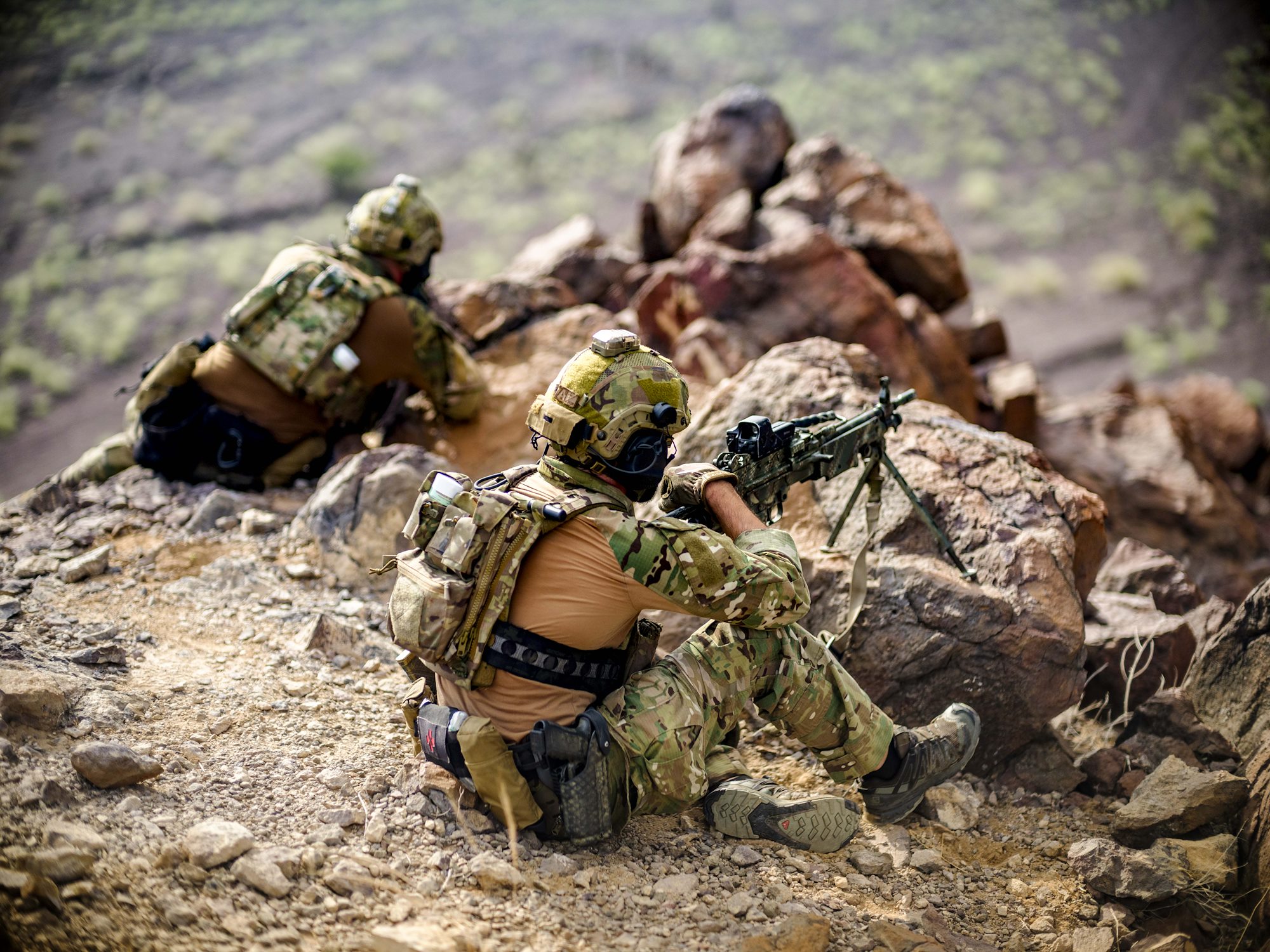 Spanish Special Operations Maritime Task Unit (SOMTU) forces provide security from a high point during the Bull Shark 25-1 exercise at Arta, Djibouti, on Nov. 26, 2024. The semiannual exercise brought together forces from the United States, Djibouti, Spain, Japan, and France to enhance communication and interoperability among international partners. It simulated complex personnel recovery scenarios across land, sea, and air domains, testing coordination and operational readiness while strengthening regional security and stability. (U.S. Air Force photo by Master Sgt. Jon Alderman)