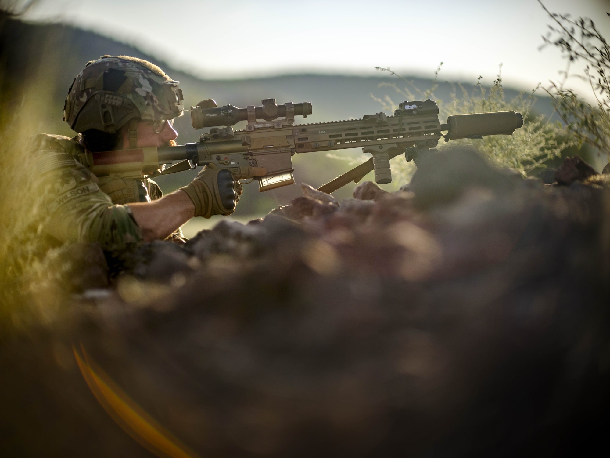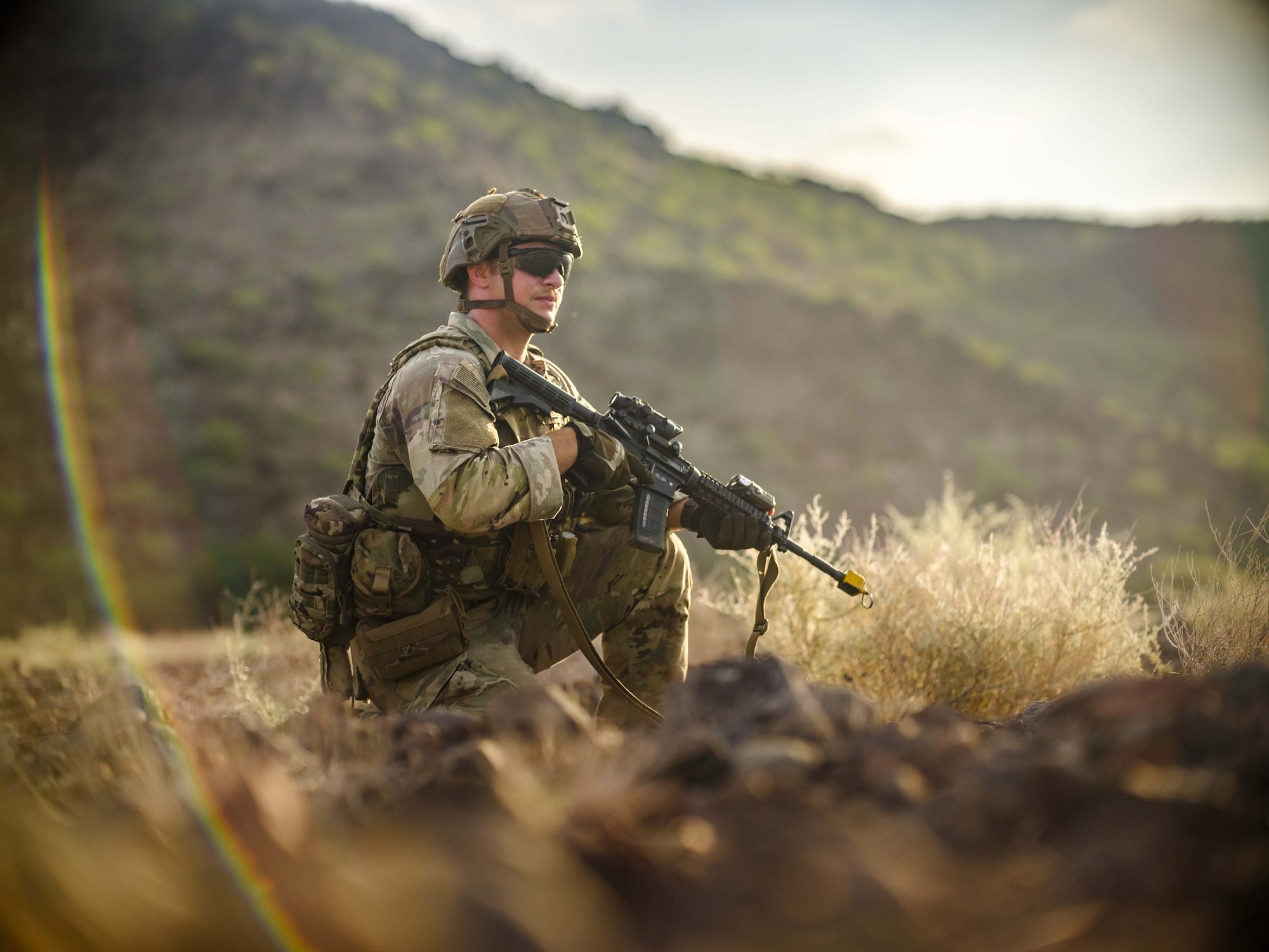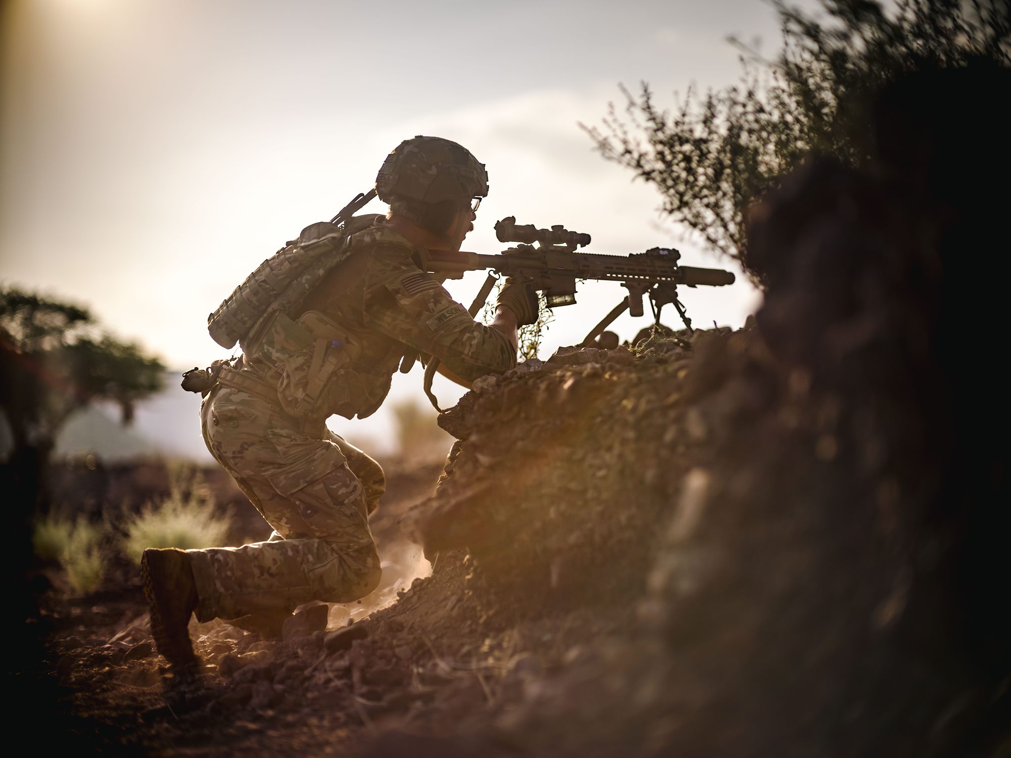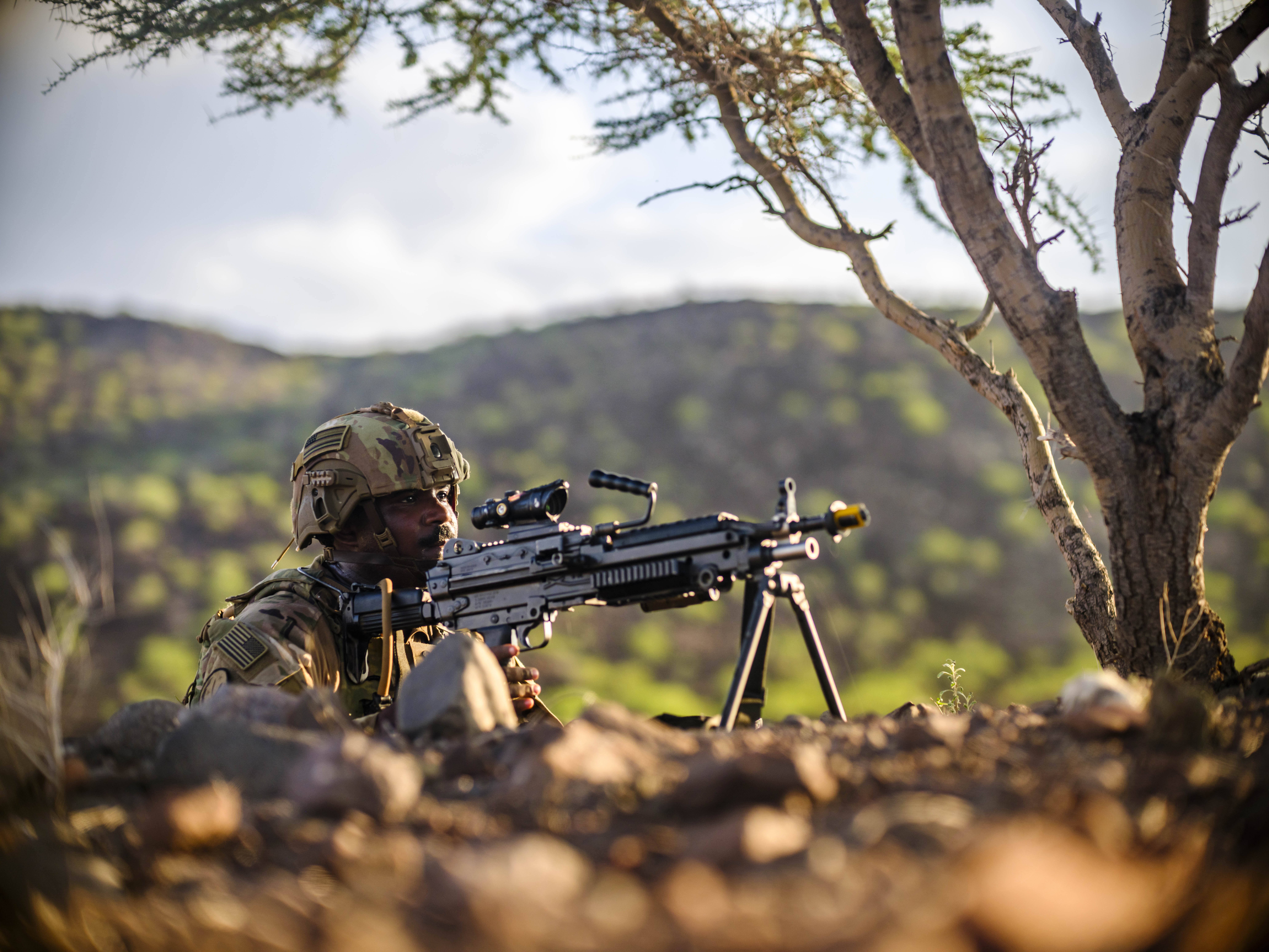 A U.S. Army Soldier with the East Africa Response Force, Task Force Associator, Combined Joint Task Force – Horn of Africa, participates in the Bull Shark 25-1 exercise at Arta, Djibouti, on Nov. 26, 2024. The semiannual exercise brought together U.S., Djiboutian, Spanish, Japanese, and French forces to enhance communication and interoperability among international partners. It simulated complex personnel recovery scenarios across land, sea, and air domains, testing coordination and operational readiness while strengthening regional security and stability. (U.S. Air Force photo by Master Sgt. Jon Alderman)