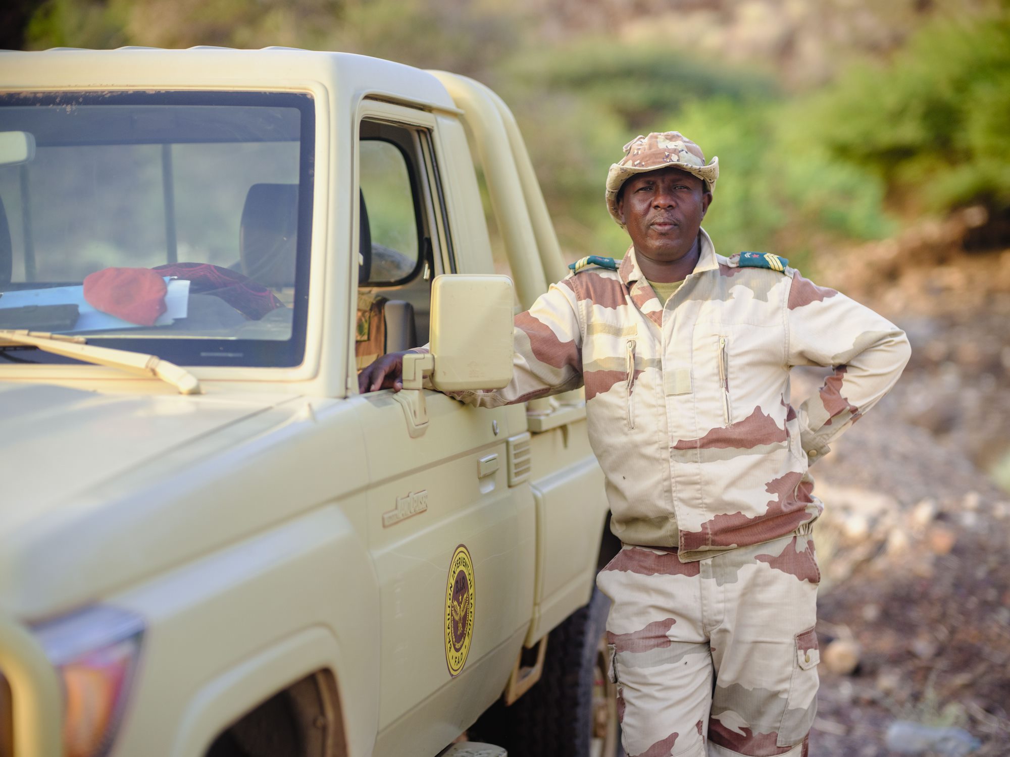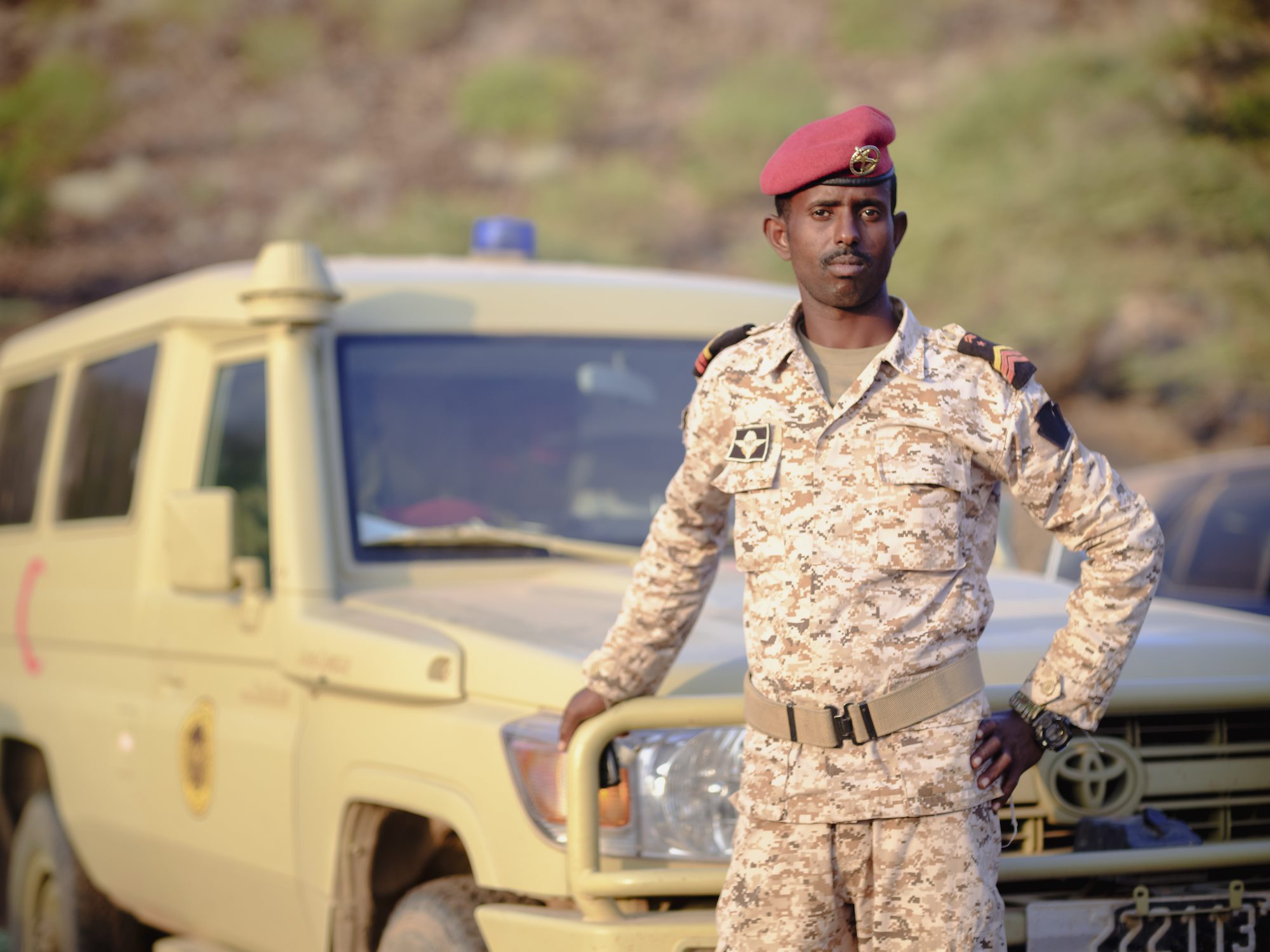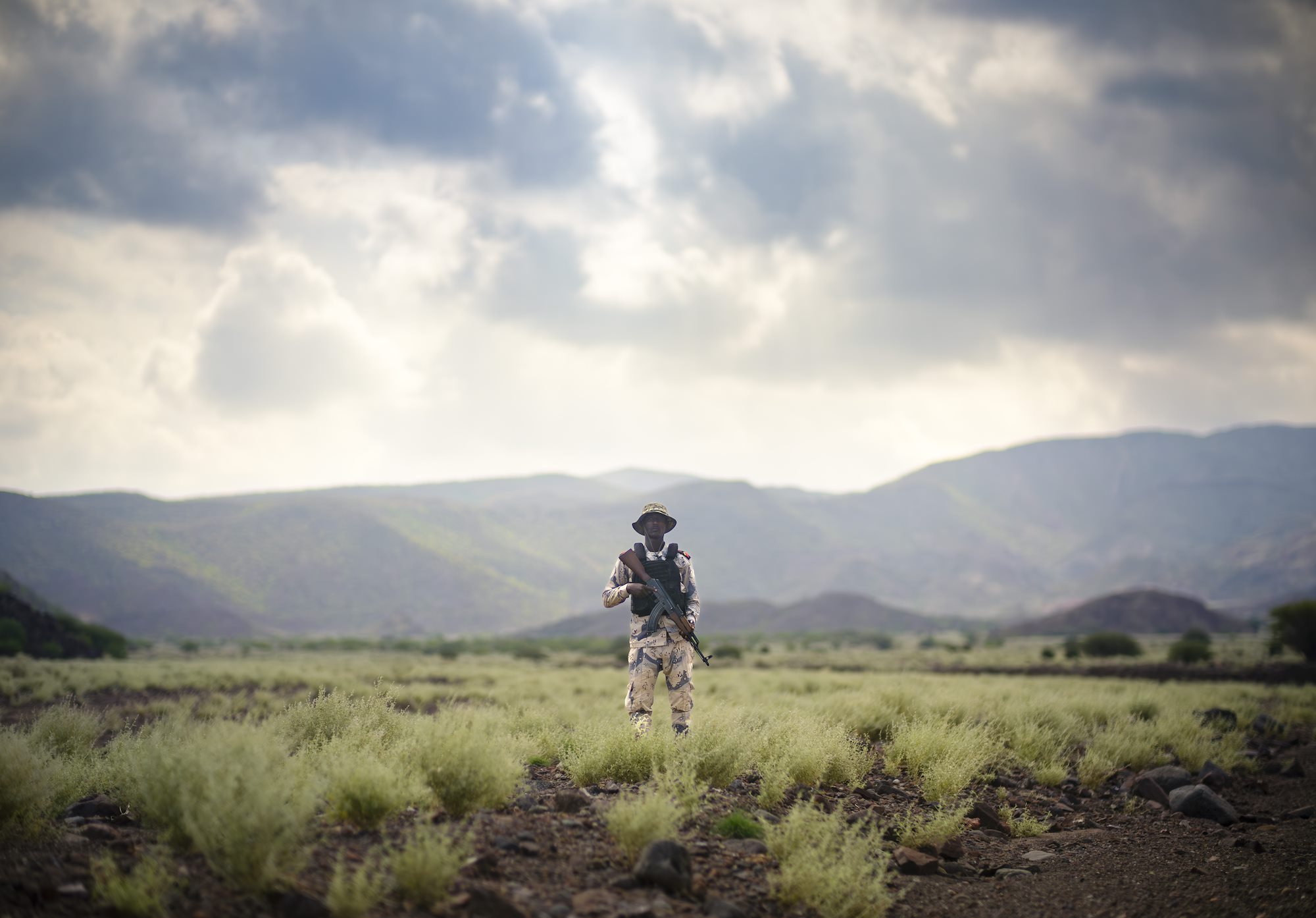 A member of the Djibouti Armed Forces poses for a portrait during Combined Joint Task Force – Horn of Africa’s Bull Shark 25-1 exercise at Arta, Djibouti, on Nov. 26, 2024. The semiannual exercise brought together U.S., Djiboutian, Spanish, Japanese, and French forces to enhance communication and interoperability among international partners. It simulated complex personnel recovery scenarios across land, sea, and air domains, testing coordination and operational readiness while strengthening regional security and stability. (U.S. Air Force photo by Master Sgt. Jon Alderman)
