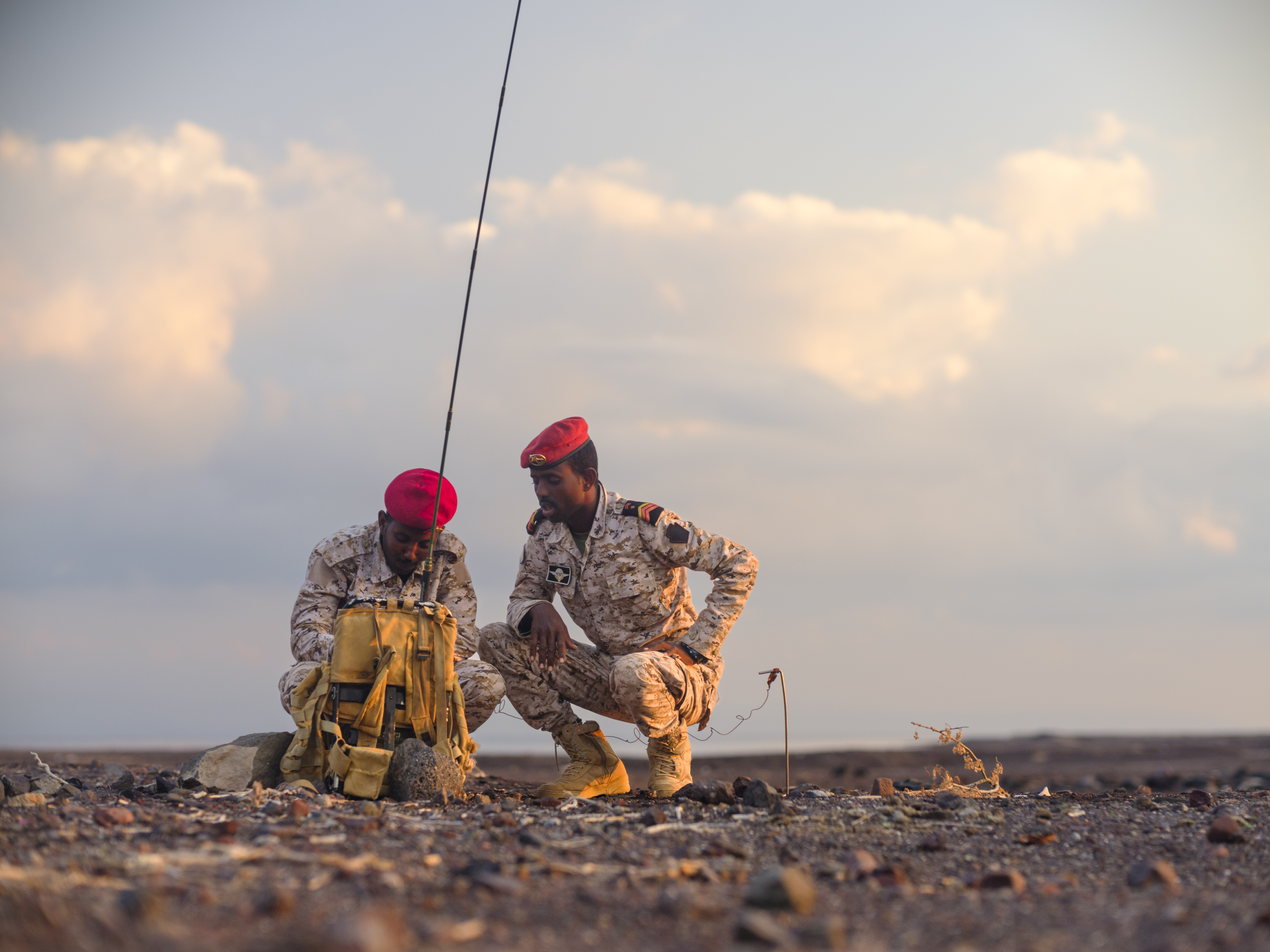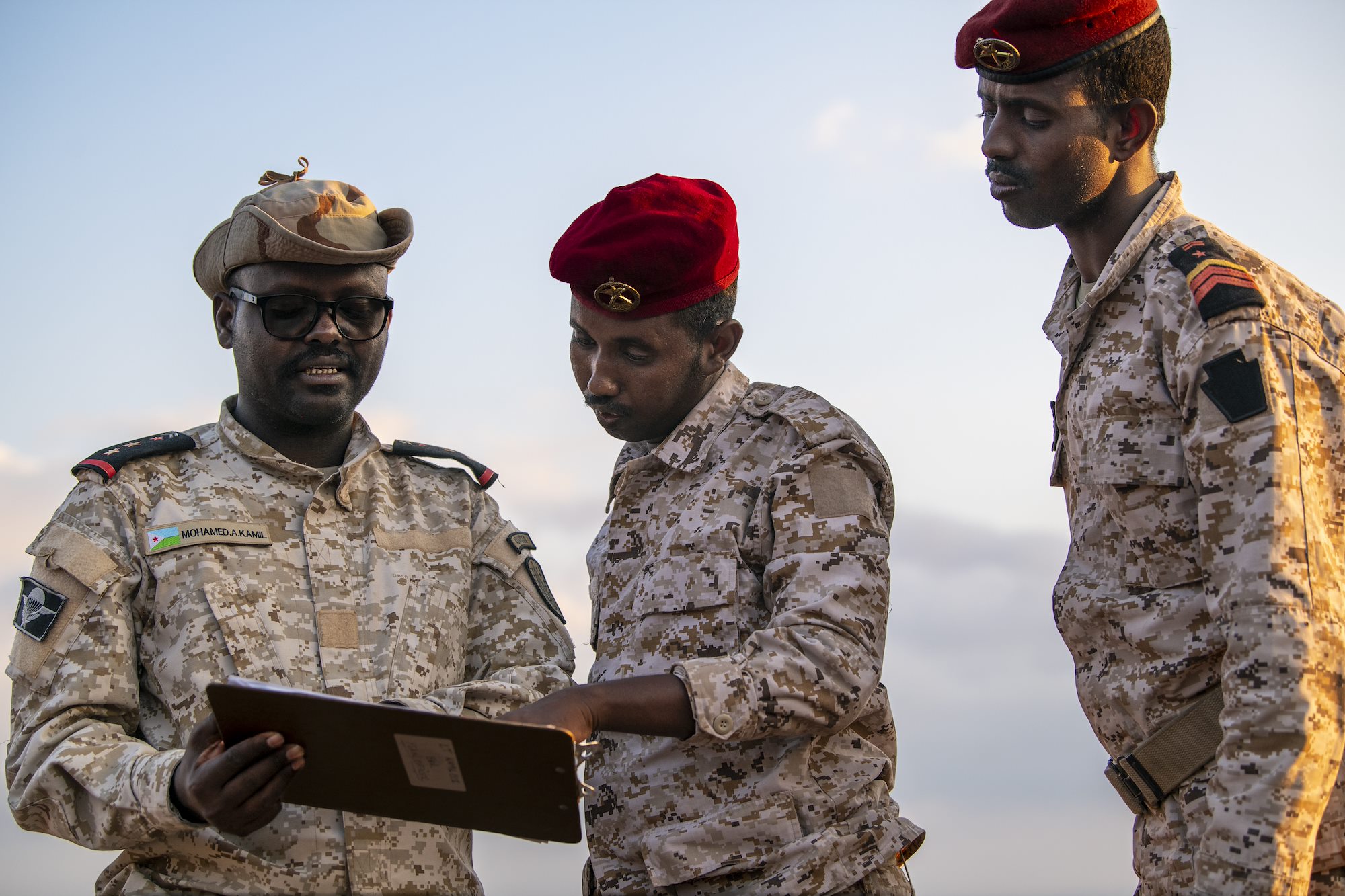 Members of the Djibouti Armed Forces set up communication equipment during Combined Joint Task Force – Horn of Africa’s Bull Shark 25-1 exercise at Arta, Djibouti, on Nov. 26, 2024. The semiannual exercise brought together U.S., Djiboutian, Spanish, Japanese, and French forces to enhance communication and interoperability among international partners. It simulated complex personnel recovery scenarios across land, sea, and air domains, testing coordination and operational readiness while strengthening regional security and stability. (U.S. Air Force photo by Master Sgt. Jon Alderman)