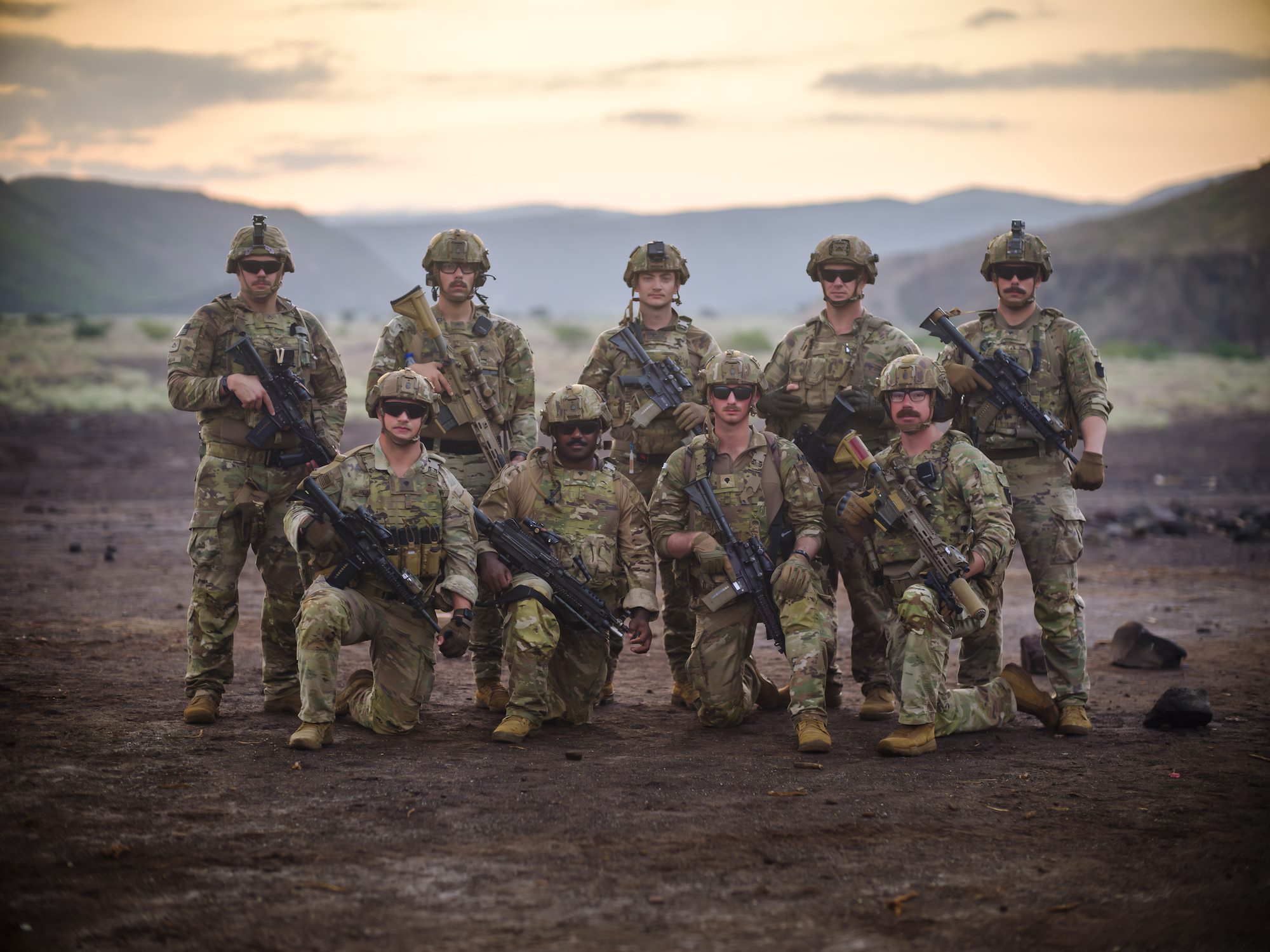 U.S. Army Soldiers with the East Africa Response Force, Task Force Associator, Combined Joint Task Force – Horn of Africa, pose for a group photo during Bull Shark 25-1 exercise at Arta, Djibouti, on Nov. 26, 2024. The semiannual exercise brought together U.S., Djiboutian, Spanish, Japanese, and French forces to enhance communication and interoperability among international partners. It simulated complex personnel recovery scenarios across land, sea, and air domains, testing coordination and operational readiness while strengthening regional security and stability. (U.S. Air Force photo by Master Sgt. Jon Alderman)