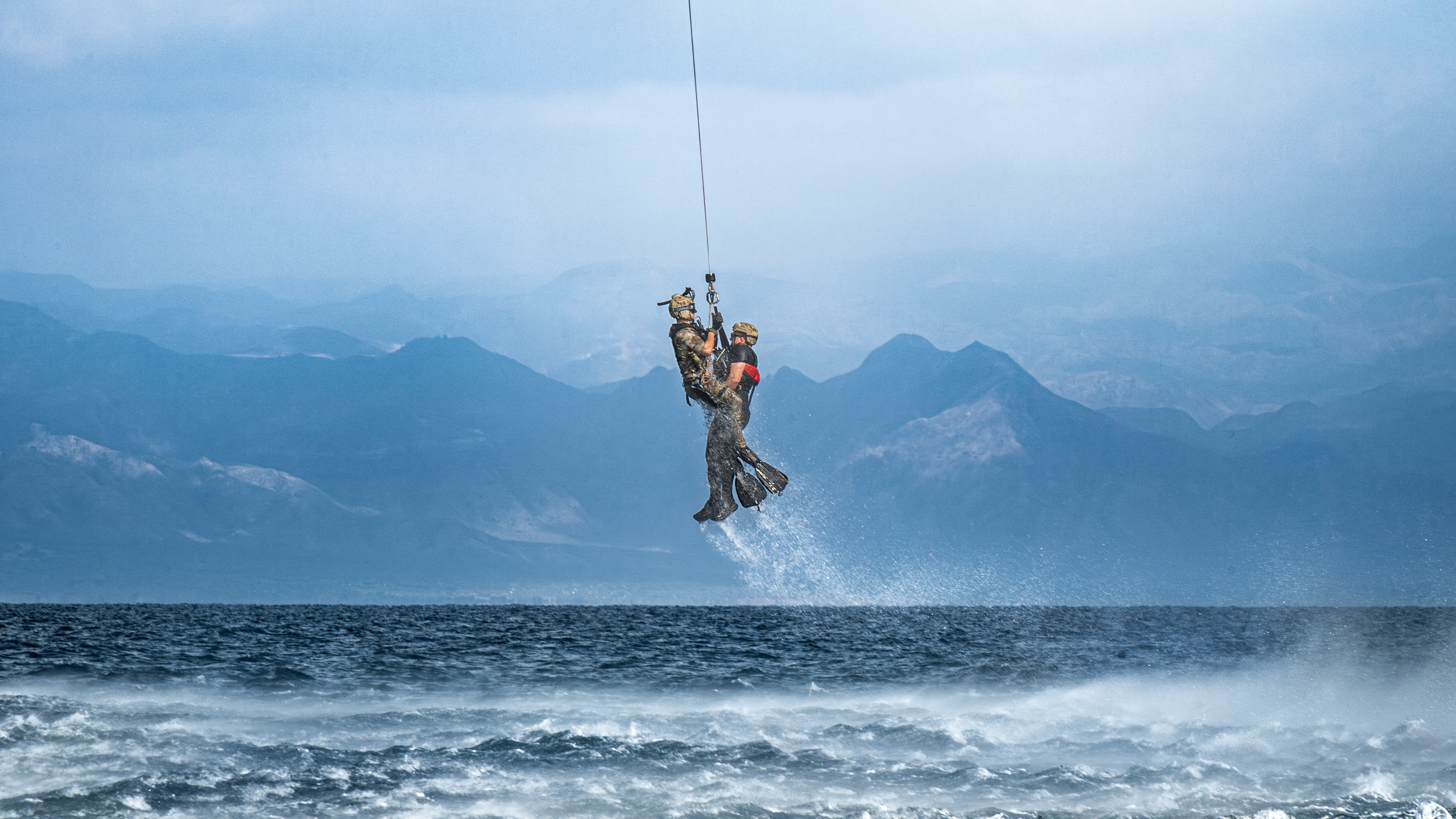 A U.S. Air Force pararescueman assigned to the 82nd Expeditionary Rescue Squadron (ERQS) recovers personnel in the water during exercise Bull Shark in Djibouti on November 26, 2024. The exercise simulated multiple personnel recovery scenarios in water allowing for the coordination of land, sea, and air components from multiple U.S. military branches, the Spanish Navy, and the Djiboutian Coast Guard. (U.S. Air Force photo by Staff Sgt. Jana Somero)