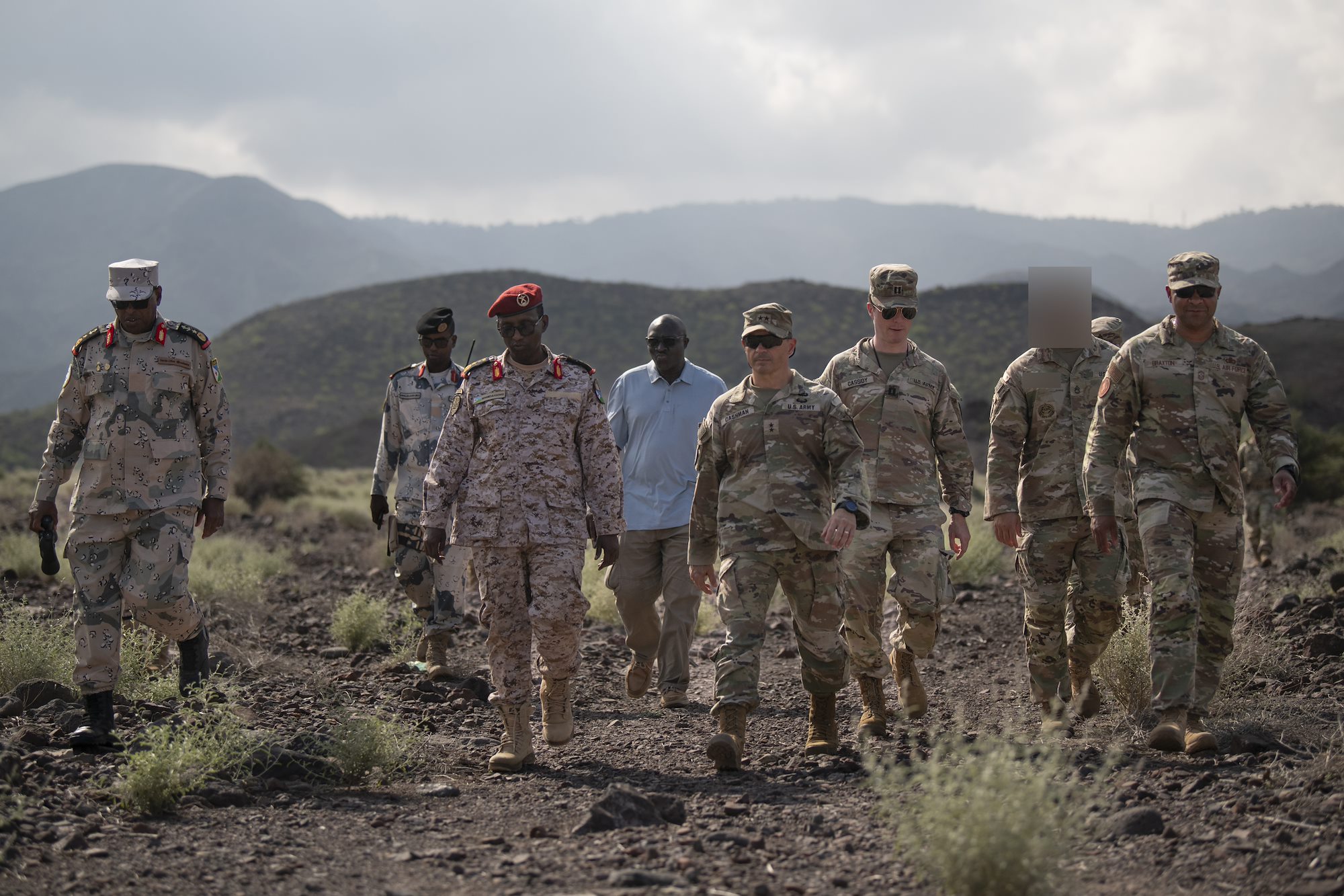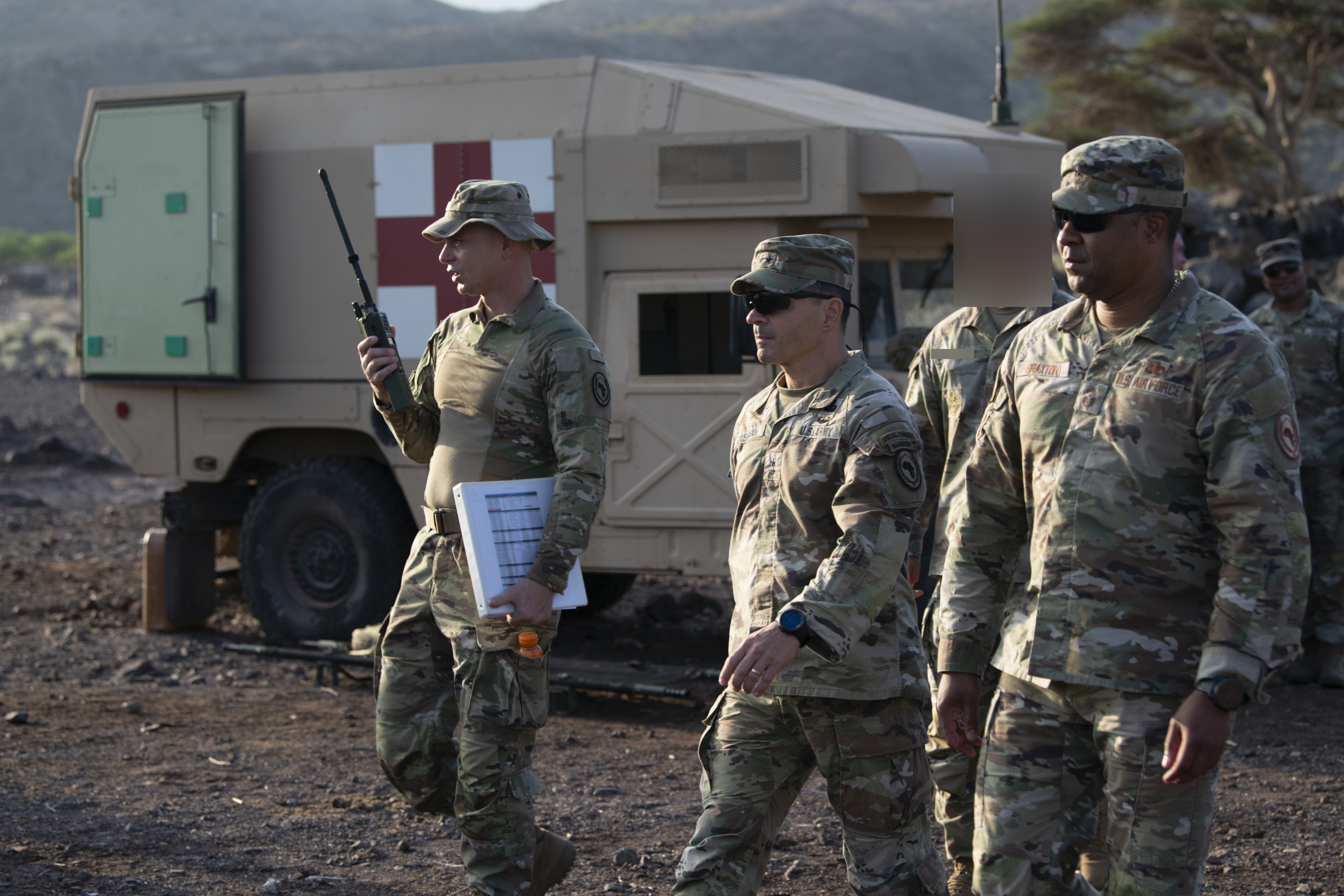 U.S. Army Maj. Gen. Brian Cashman, commander, Combined Joint Task Force-Horn of Africa, second from left, observes military members participating in Bull Shark 25-1 at Arta, Djibouti, on Nov. 26, 2024. The semiannual exercise brought together U.S., Djiboutian, Spanish, Japanese, and French forces to enhance communication and interoperability among international partners. It simulated complex personnel recovery scenarios across land, sea, and air domains, testing coordination and operational readiness while strengthening regional security and stability. (U.S. Air National Guard photo by Tech Sgt. Kathleen LaCorte)