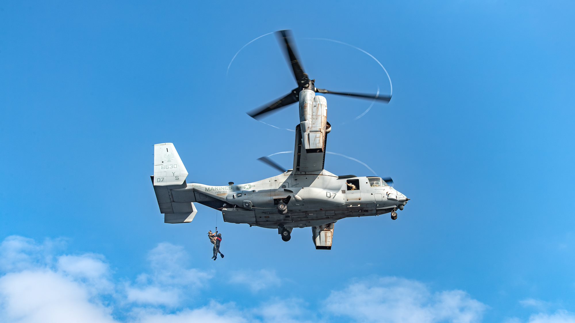 An MV-22 Osprey tiltrotor aircraft extracts pararescuemen from the Gulf of Tadjoura during Exercise Bull Shark on Nov. 26, 2024. The semiannual exercise brought together U.S., Djiboutian, Spanish, Japanese, and French forces to enhance communication and interoperability among international partners. It simulated complex personnel recovery scenarios across land, sea, and air domains, testing coordination and operational readiness while strengthening regional security and stability. (U.S. Army National Guard photo by Sgt. Lark Sine)
